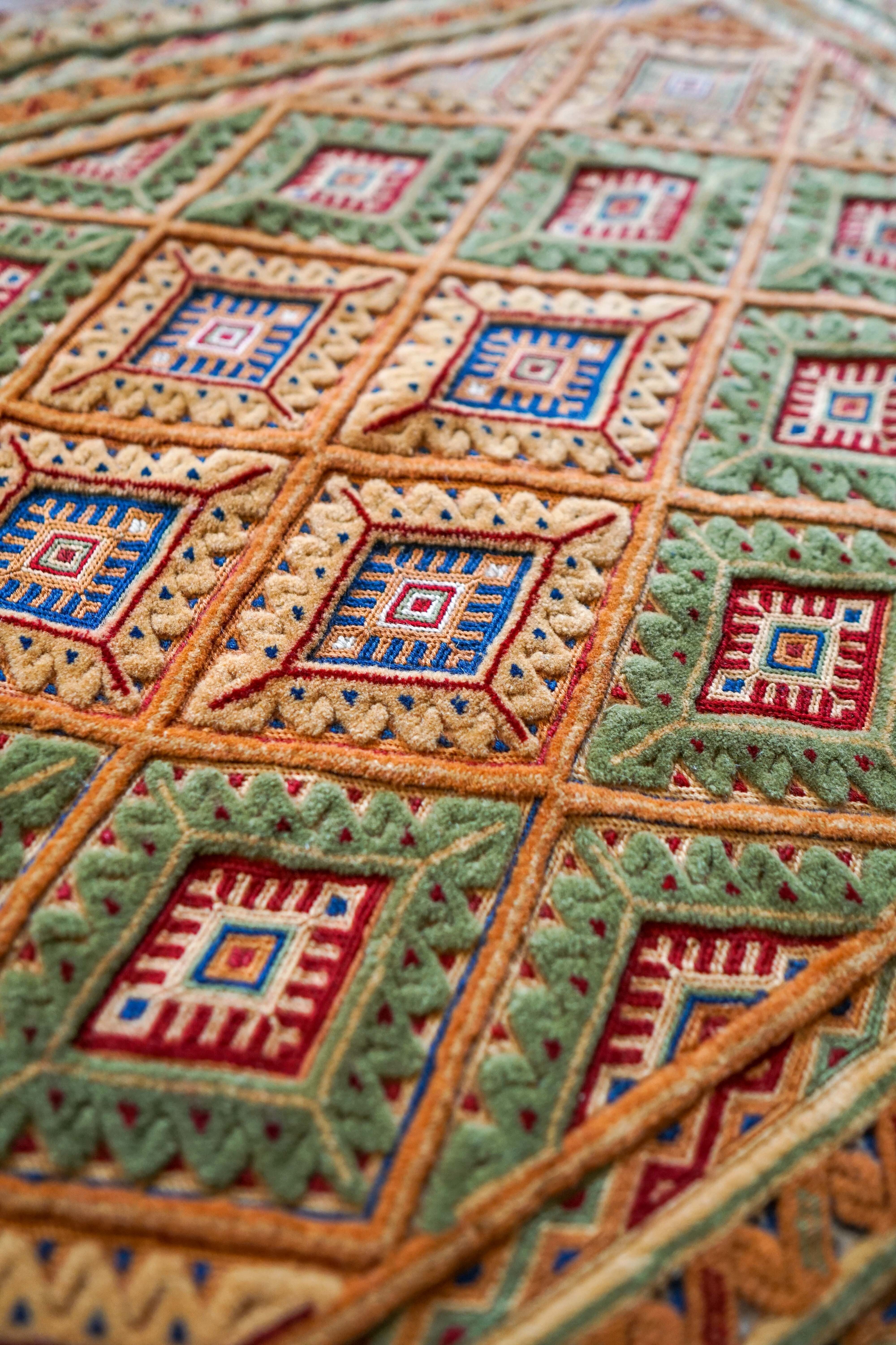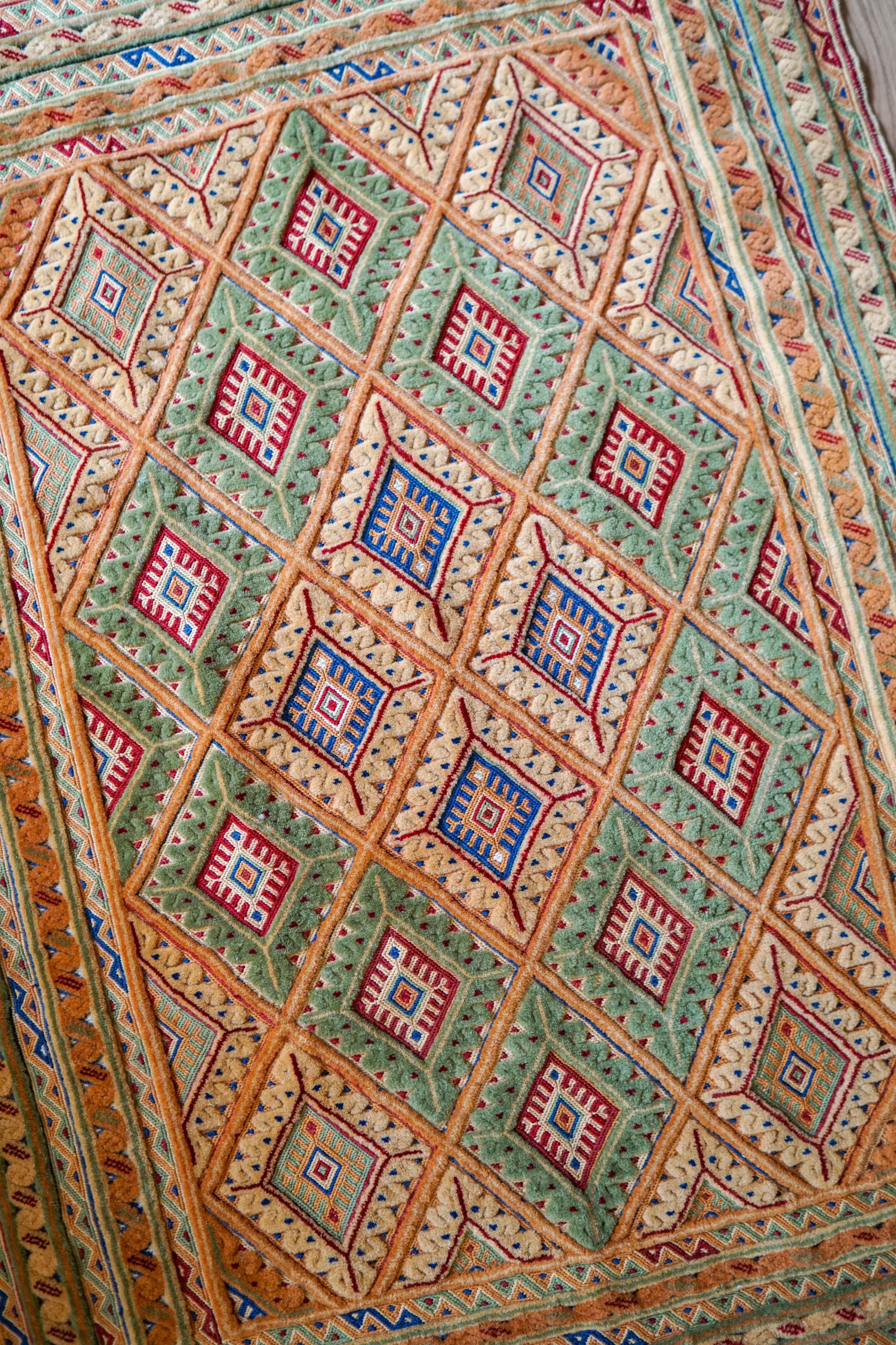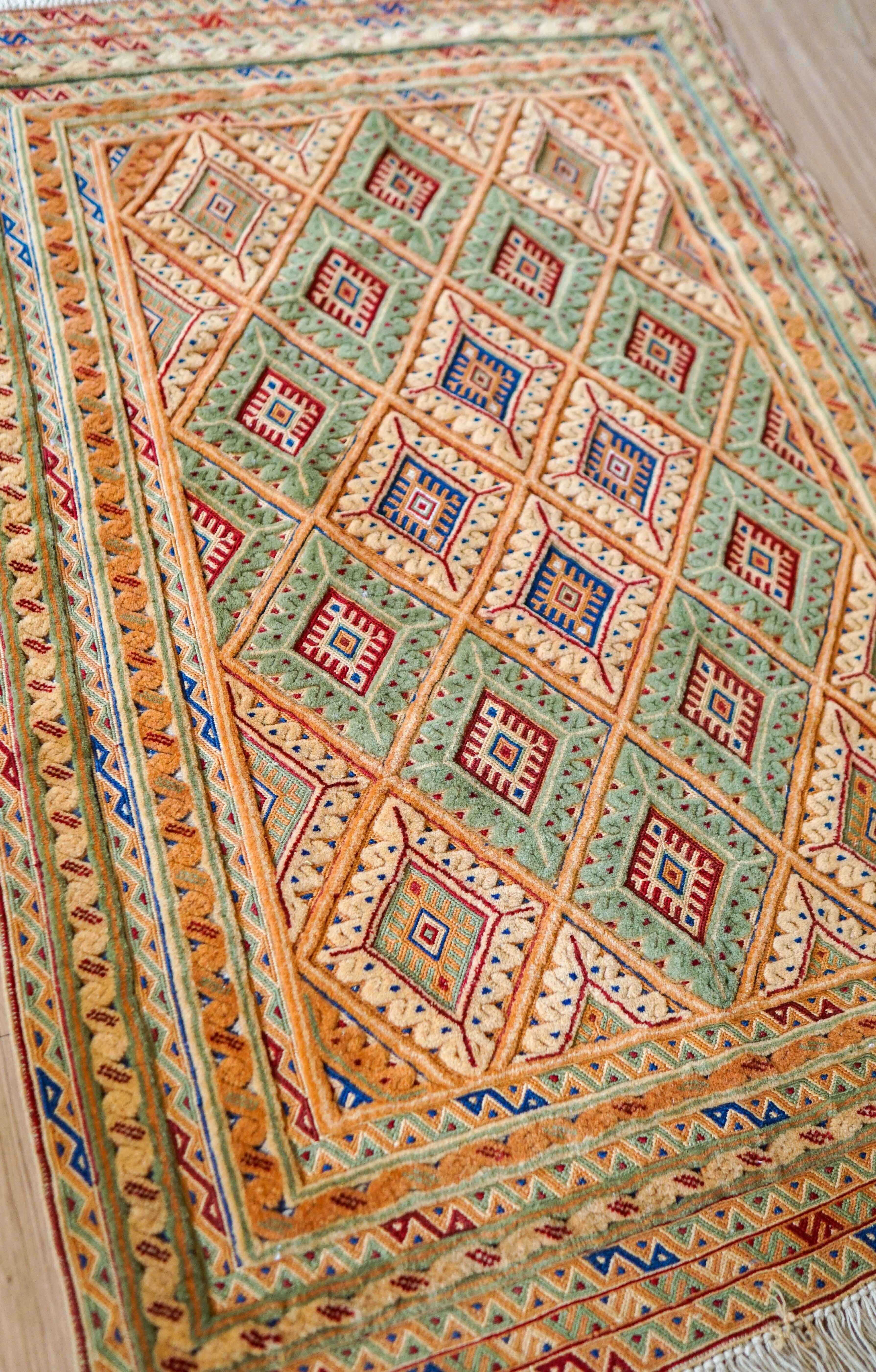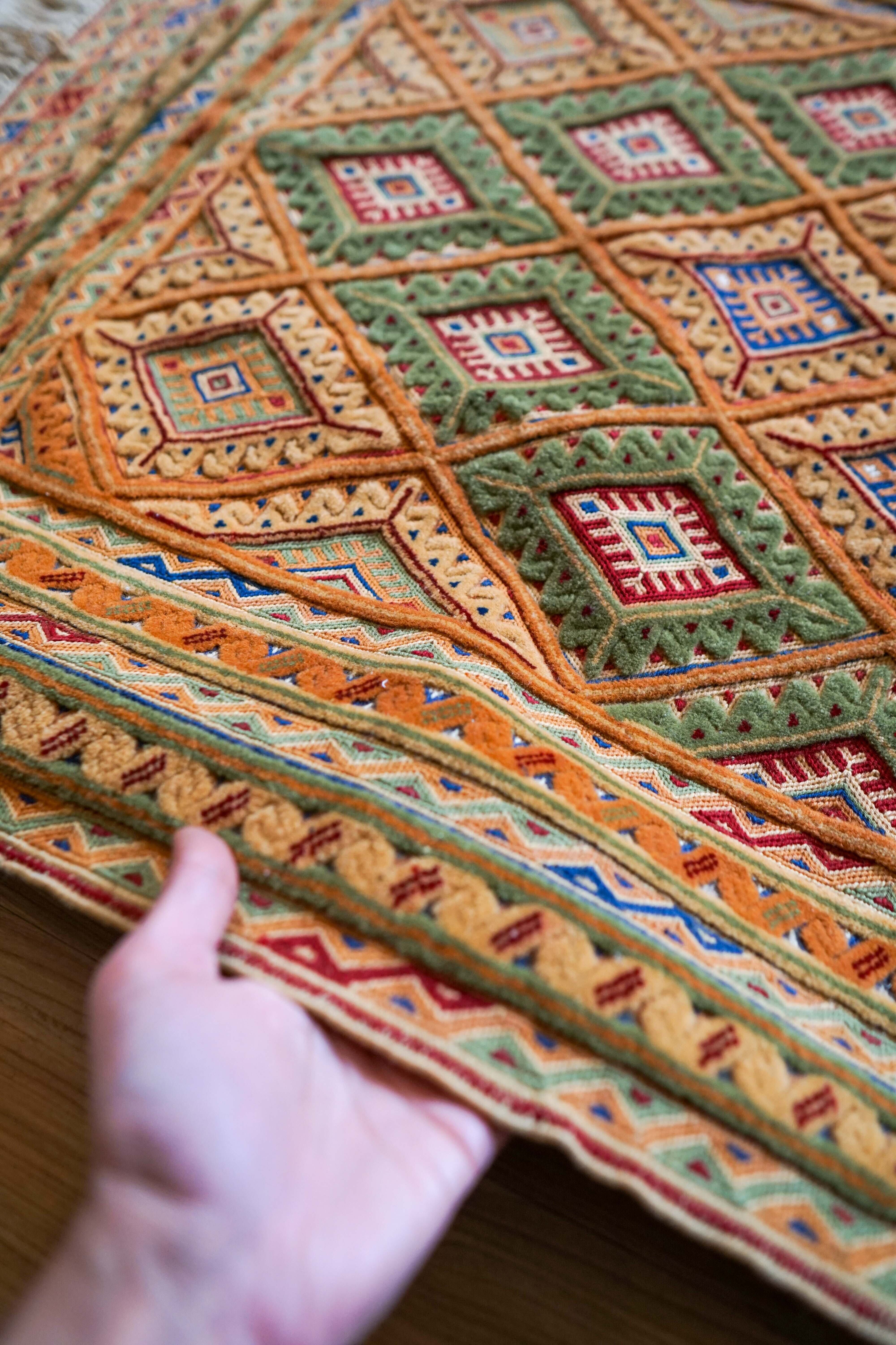 毛足のない麻のような肌触りのキリムと、パイル地の絨毯部分を合わせもった凸凹のある絨毯で、幾何学的なデザインが美しく、踏み心地も大変良いです。