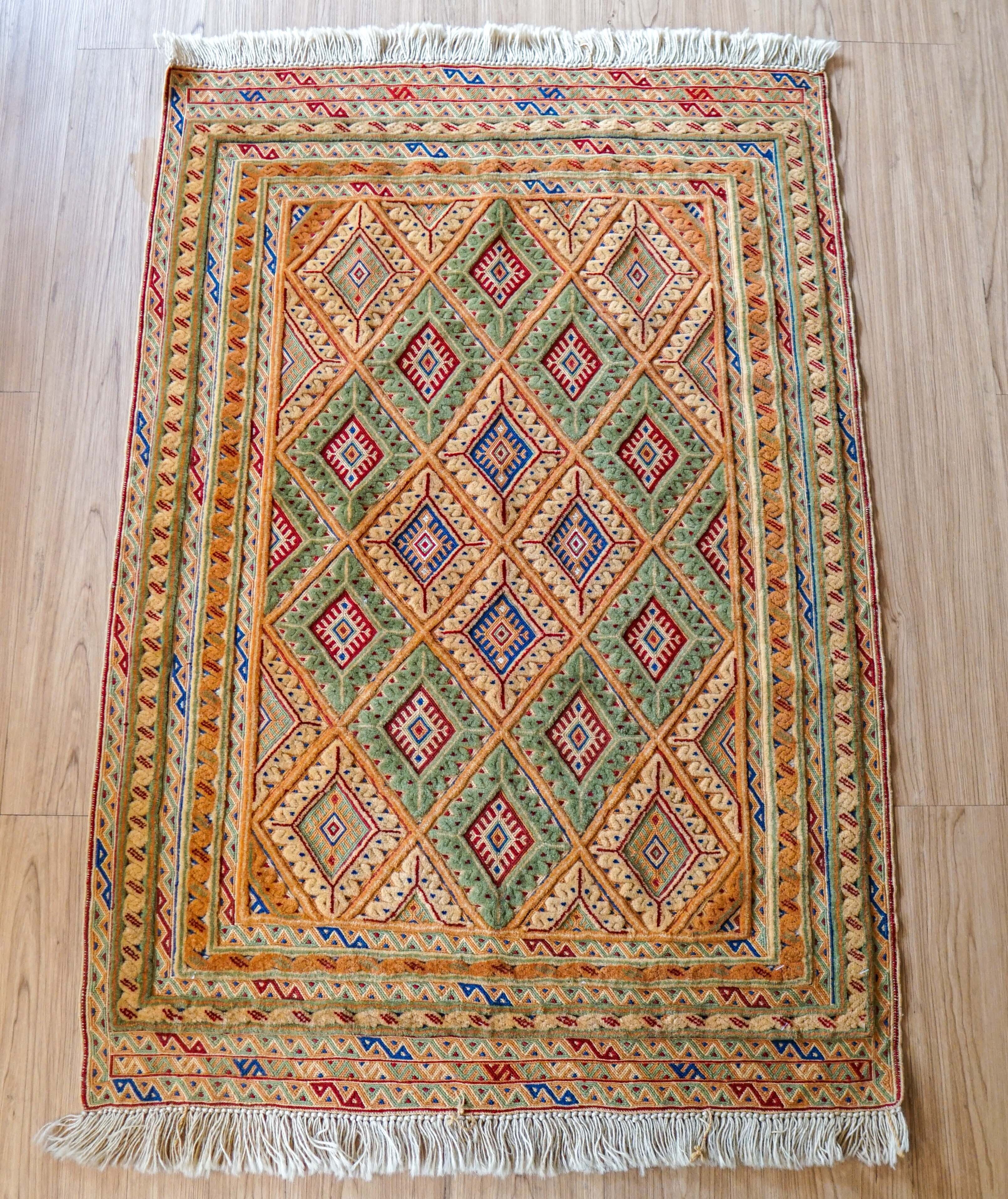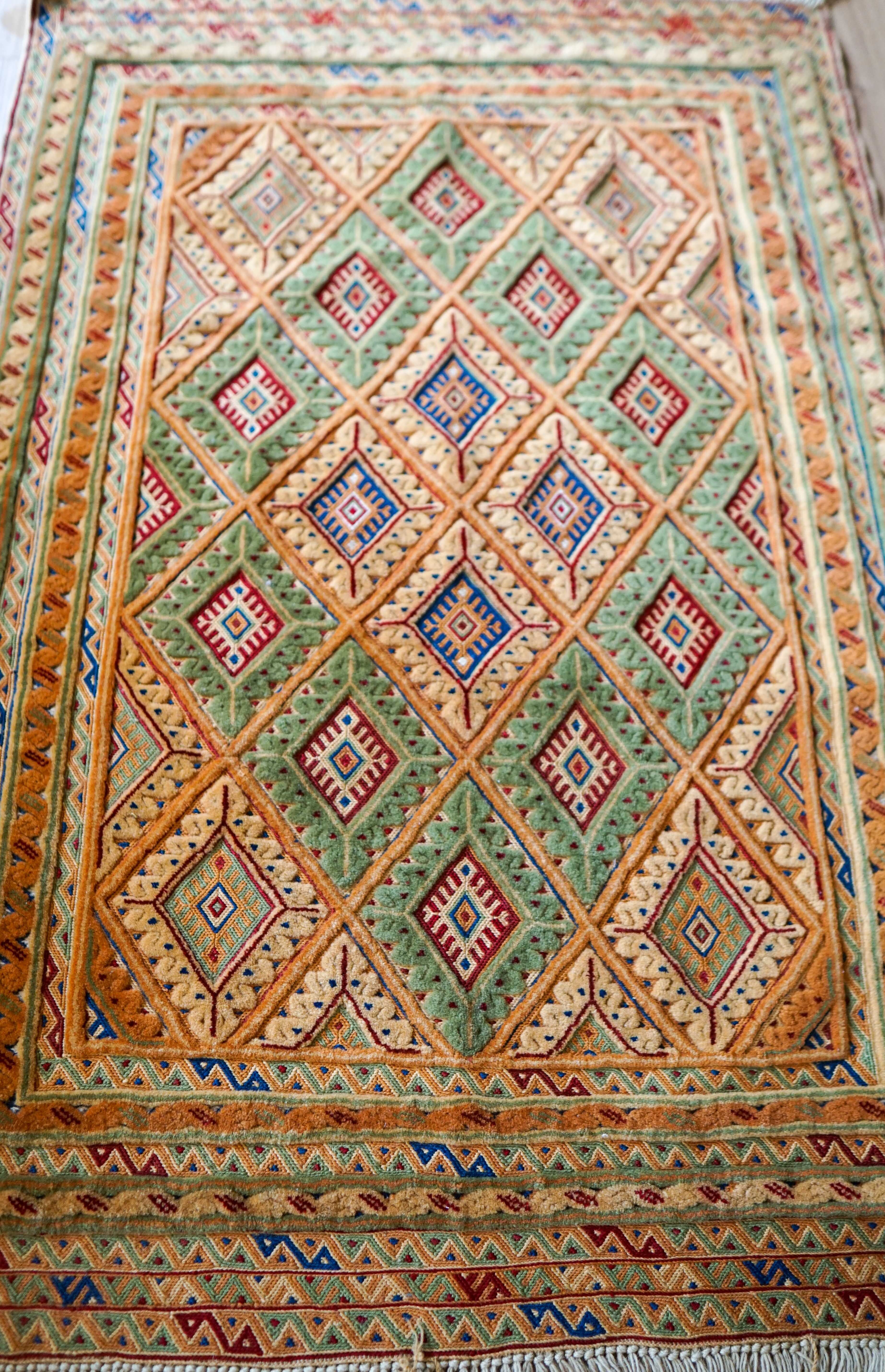 アフガニスタン ヘラート産のマシュワニキリムです。マシュワニ族という部族が手織りしています。彼らの得意とするスマック織りという技法は、複雑な織り技術を要するため難易度が高く、希少で日本ではあまり出回っていません。
