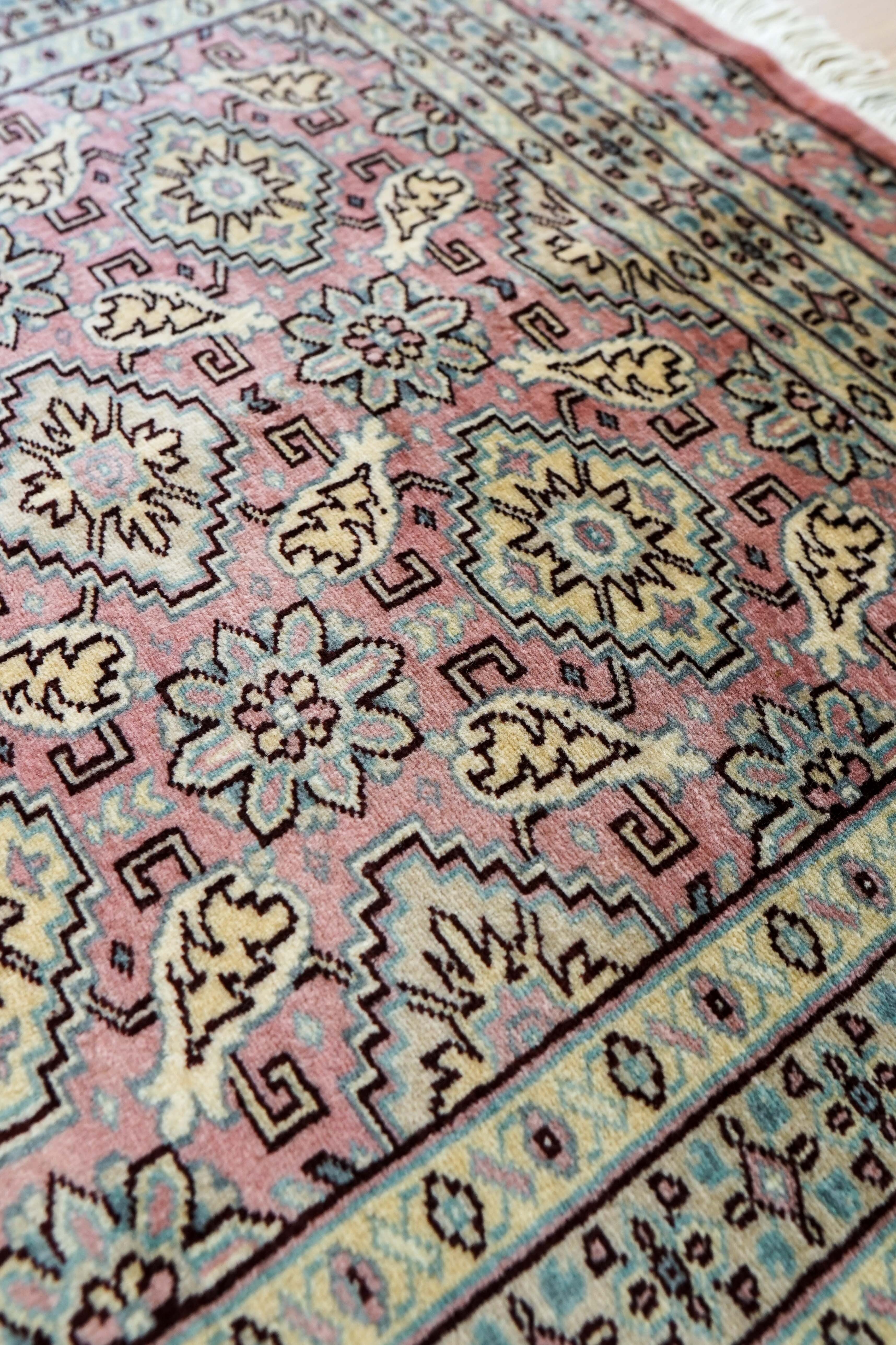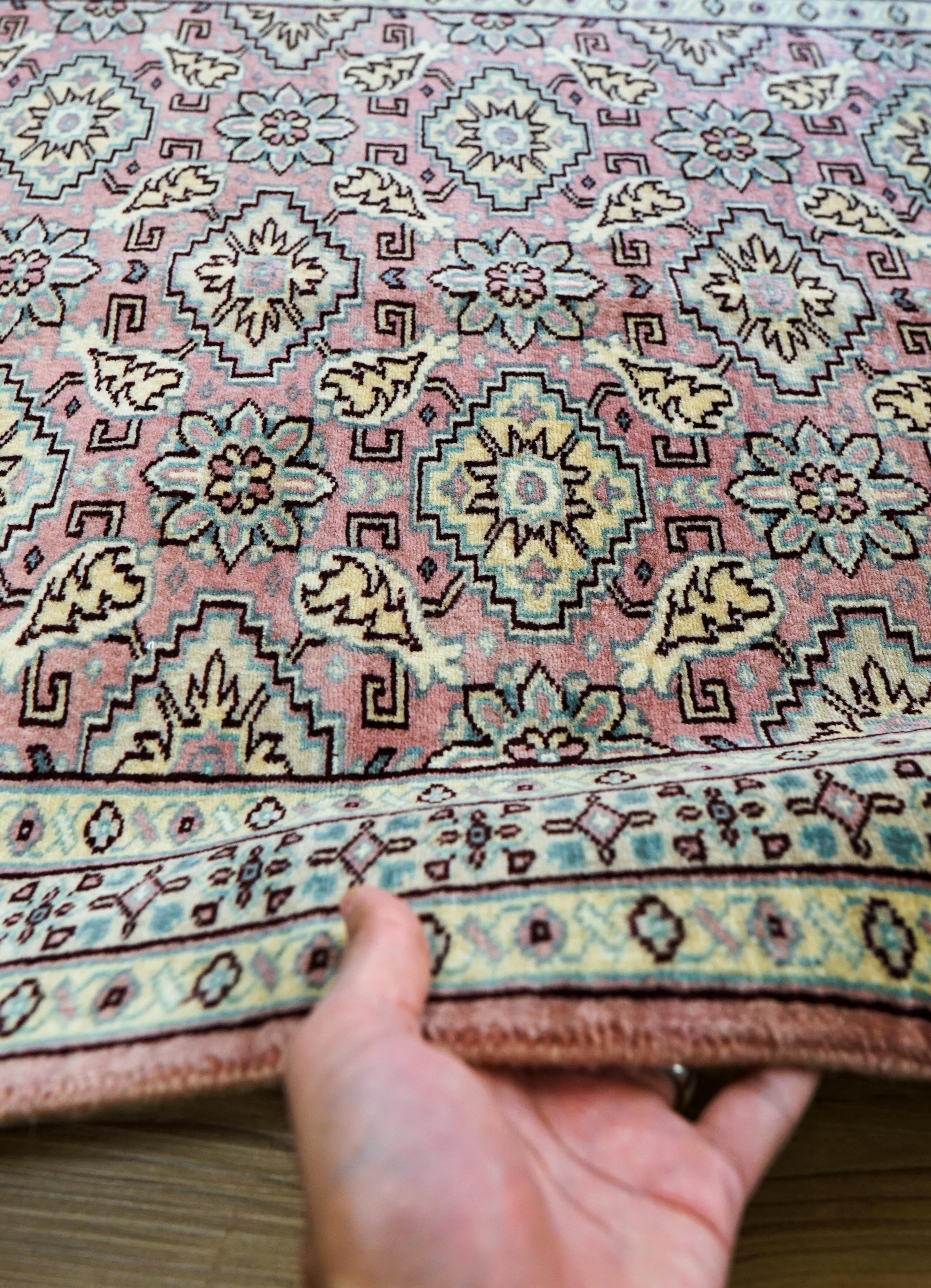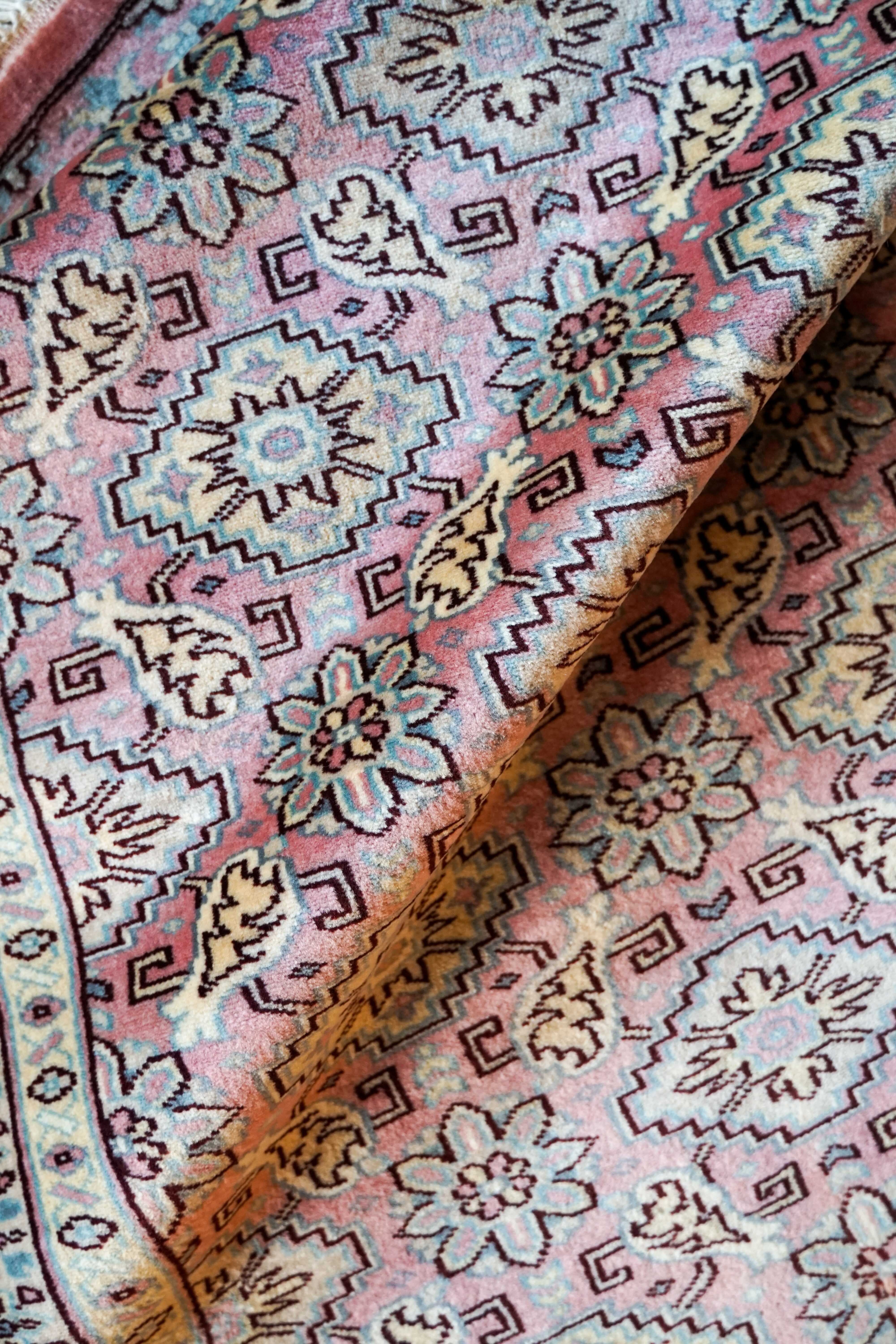 やさしいピンク色が空間を明るく彩る、パキスタン製の手織り絨毯です。