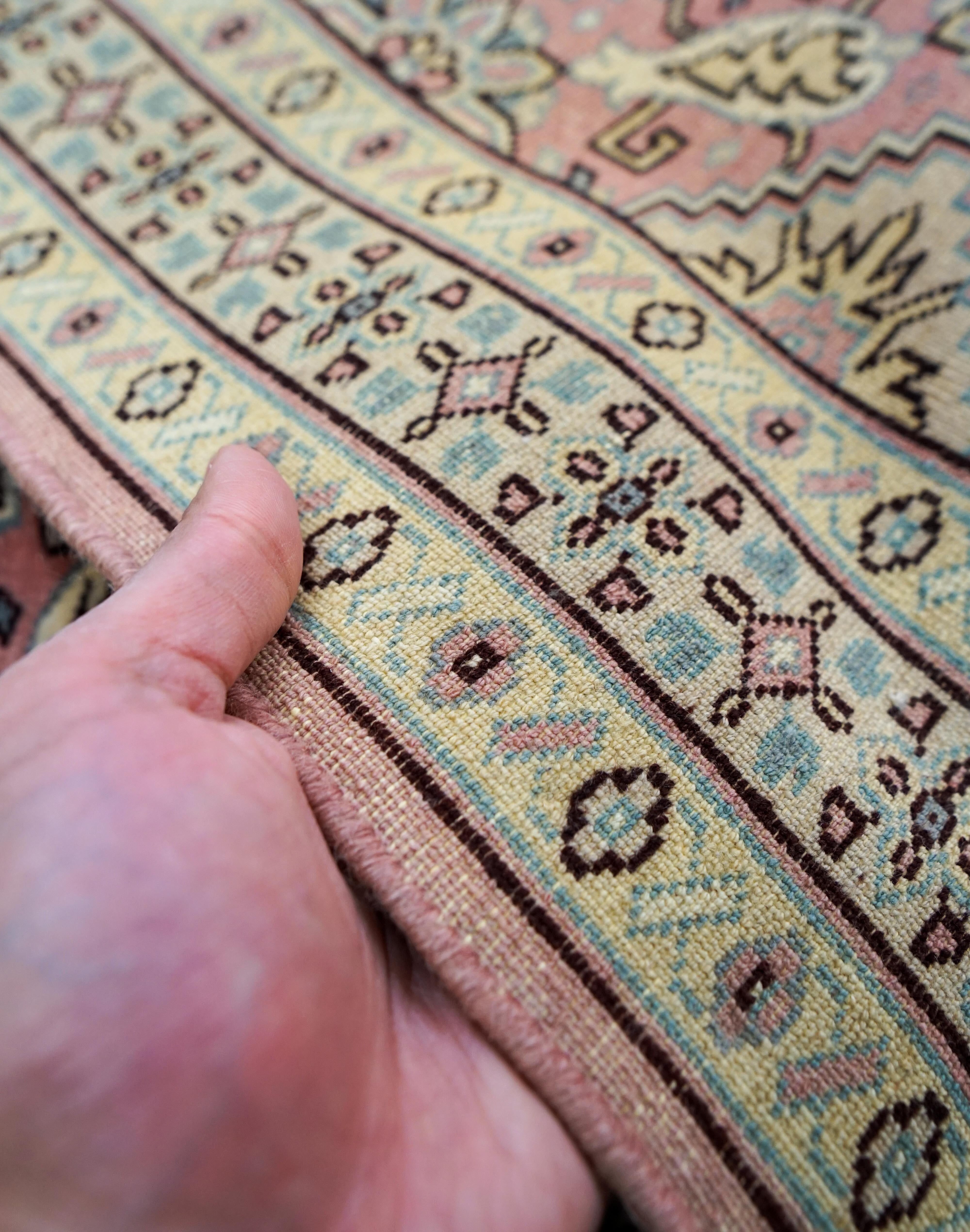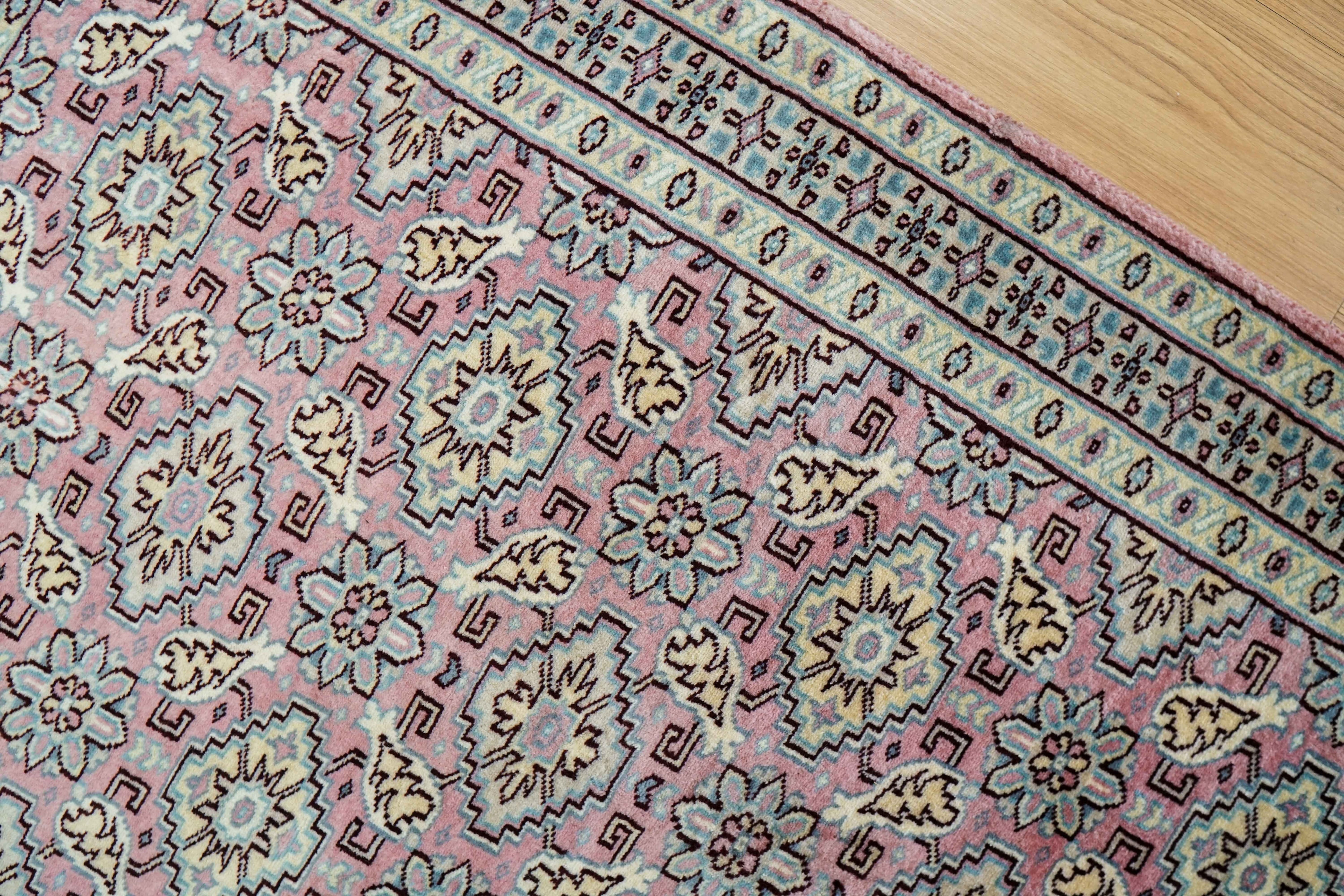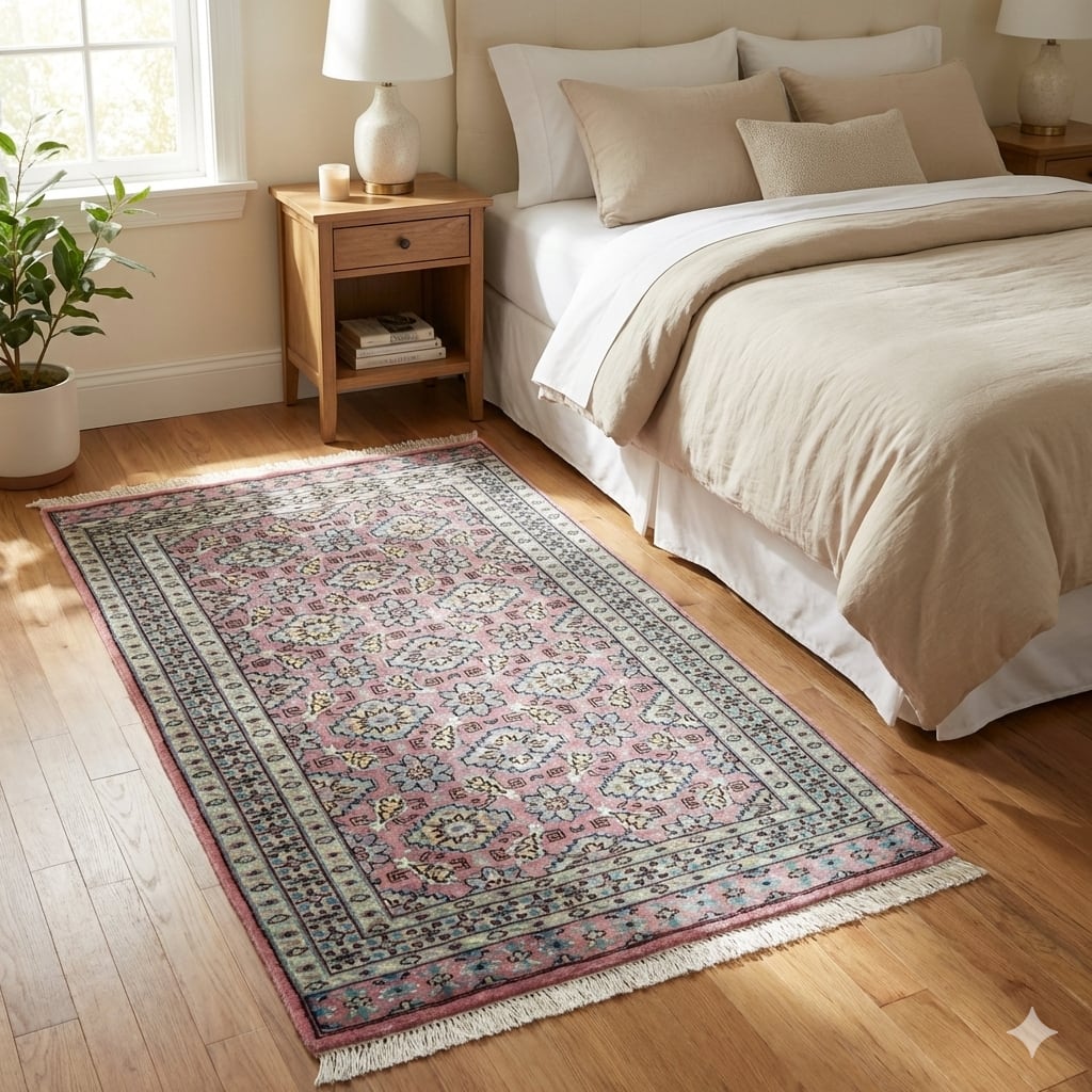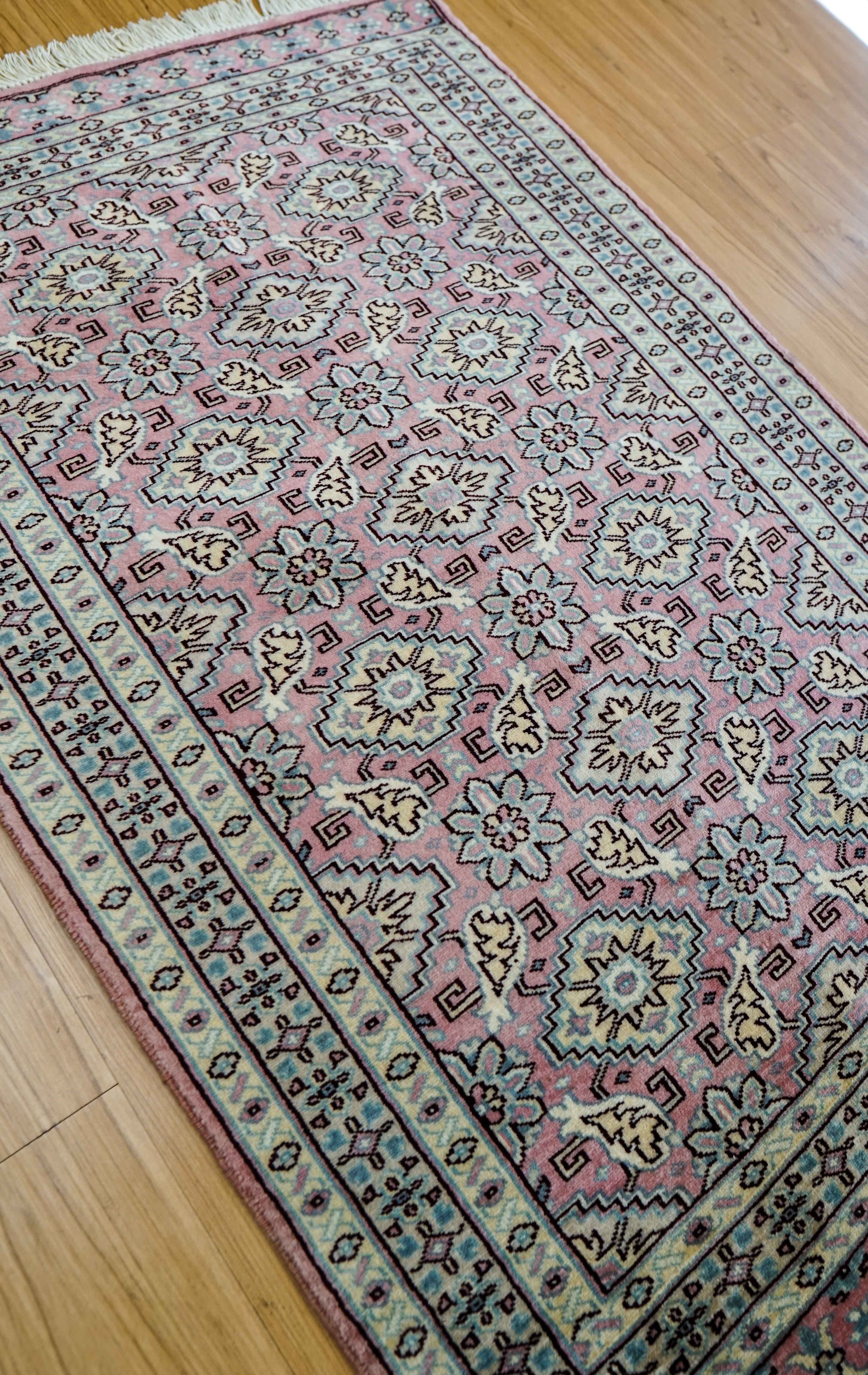 やさしいピンク色が空間を明るく彩る、パキスタン製の手織り絨毯です。