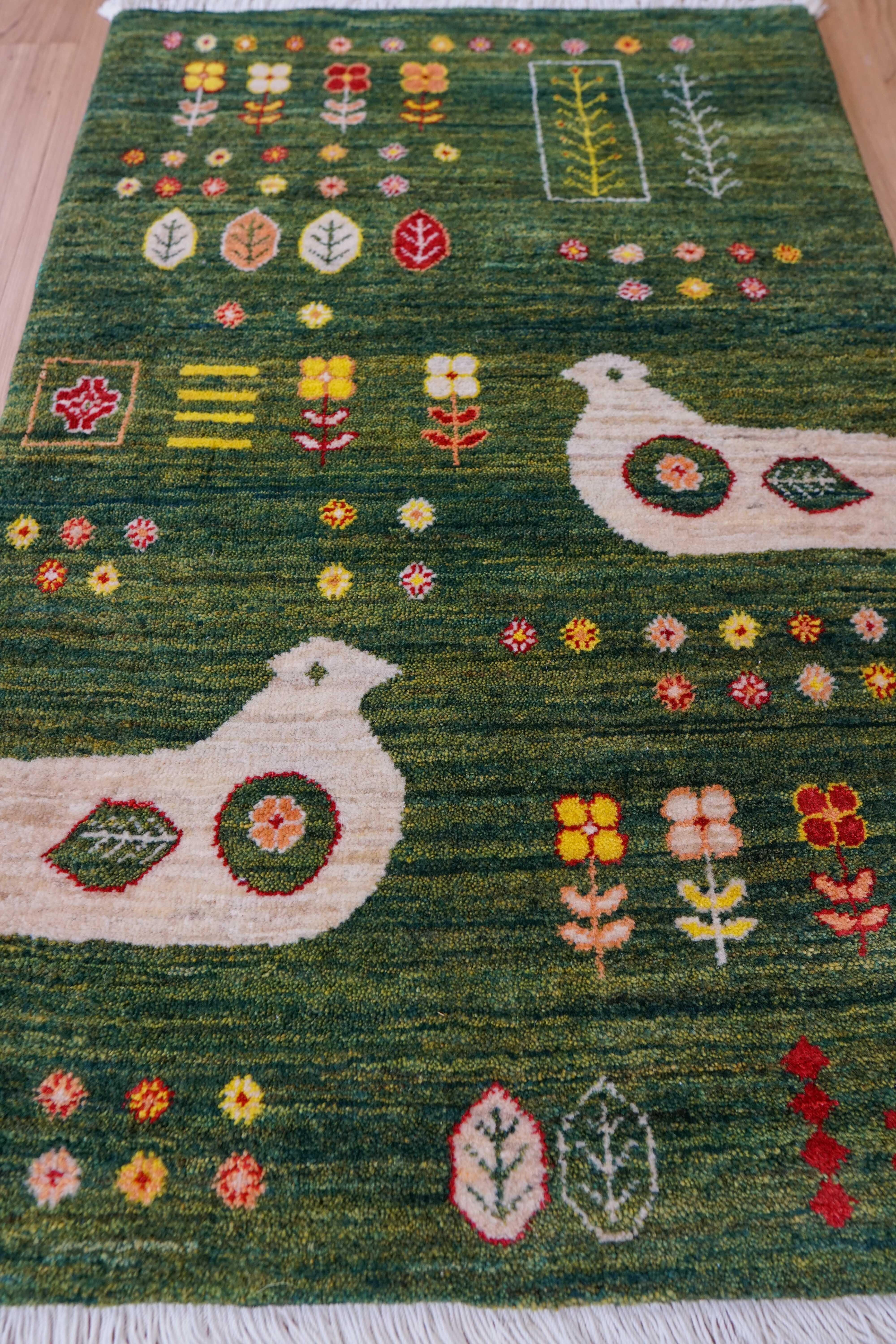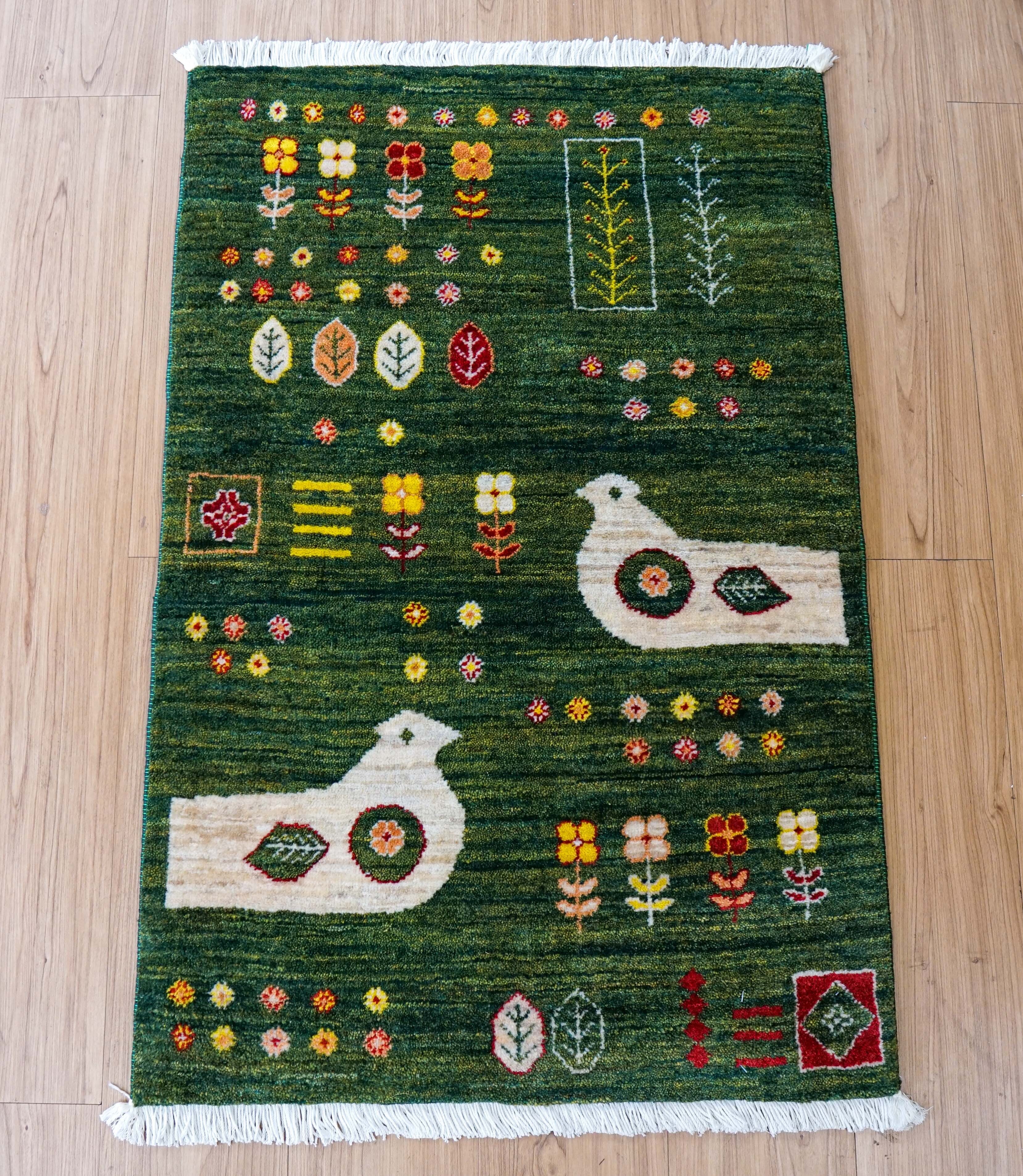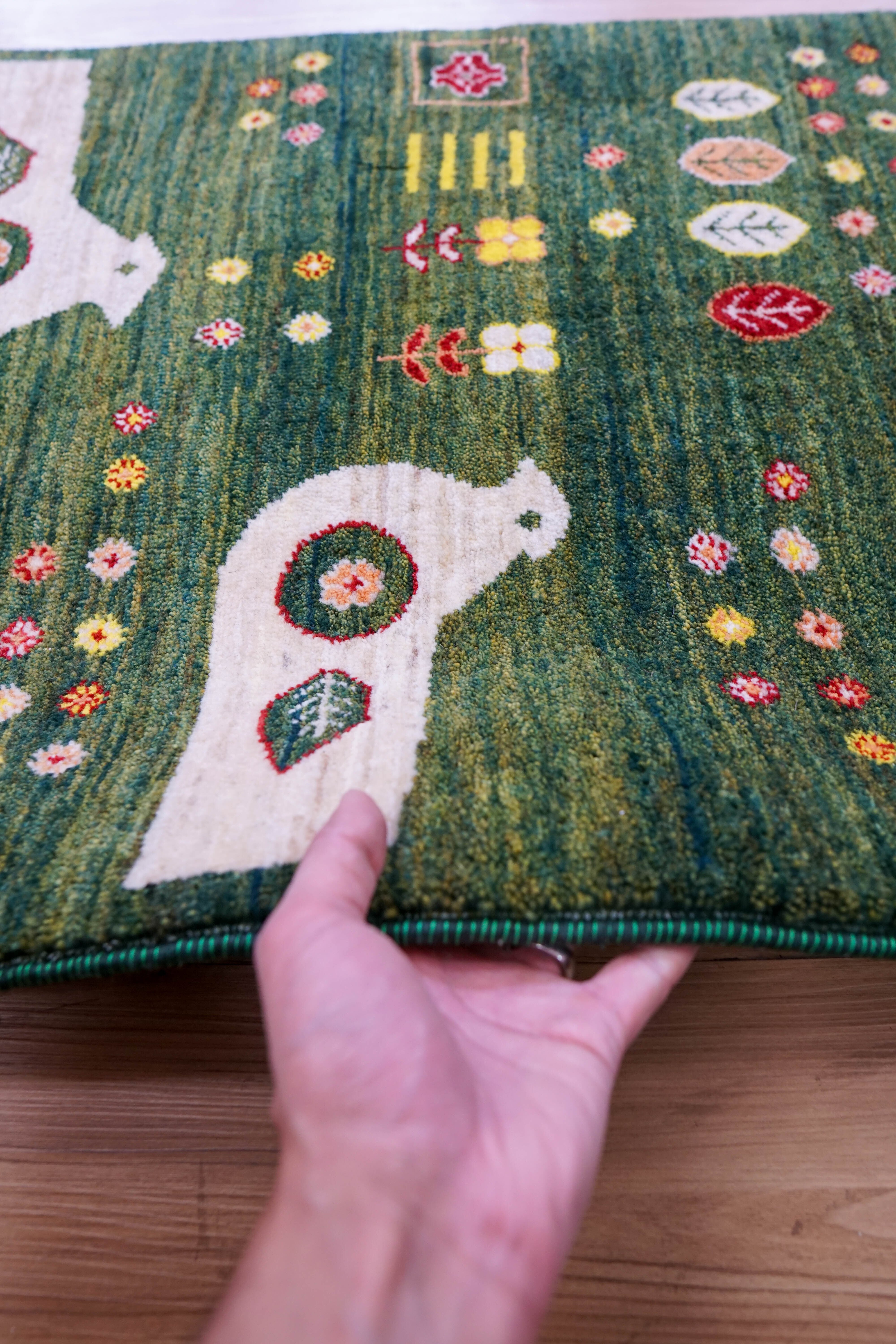 ペルシャ手織りカシュクリギャッベ リズバフト 93×62cm|緑の草原と鳥のモチーフ・高密度織り ギャベ