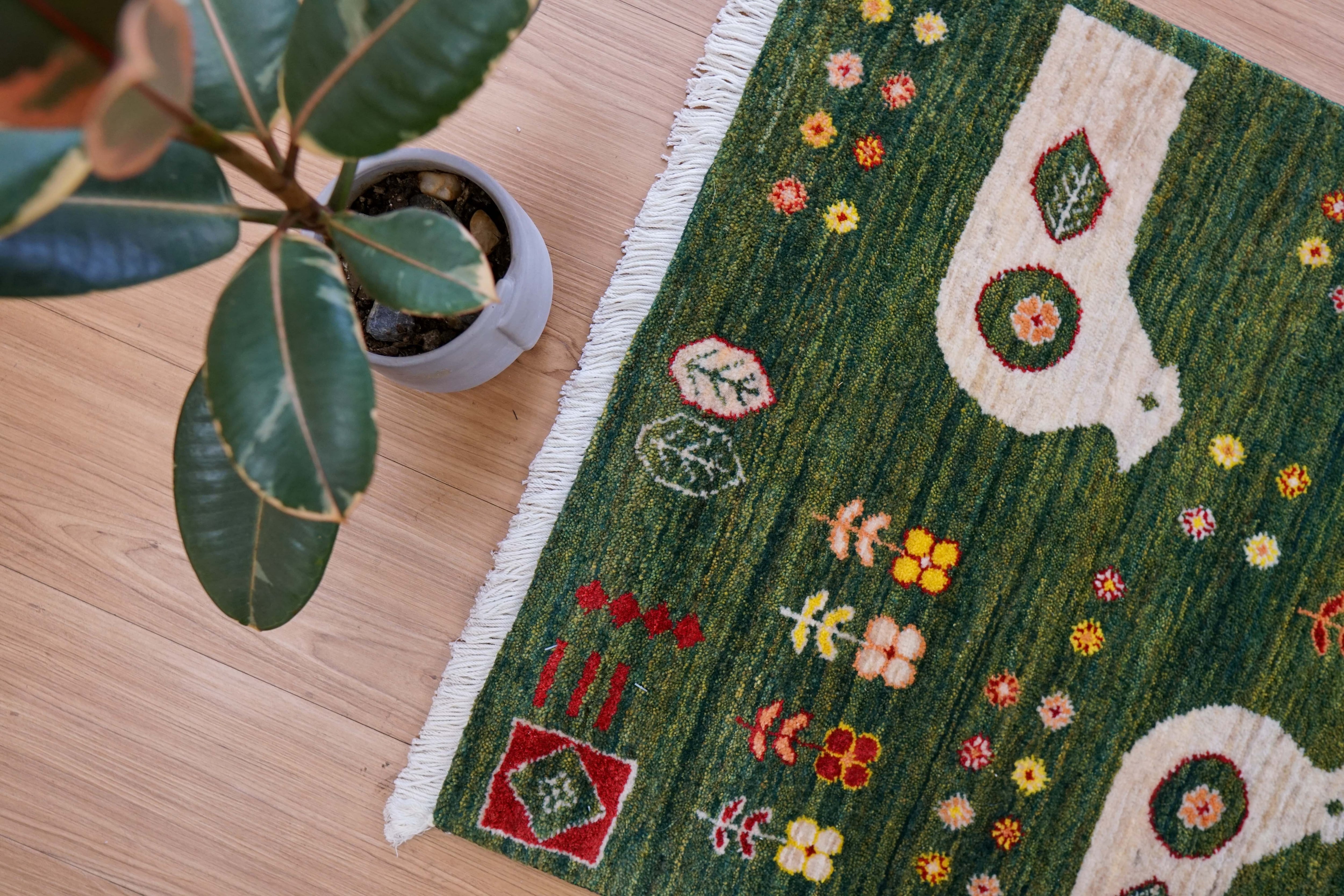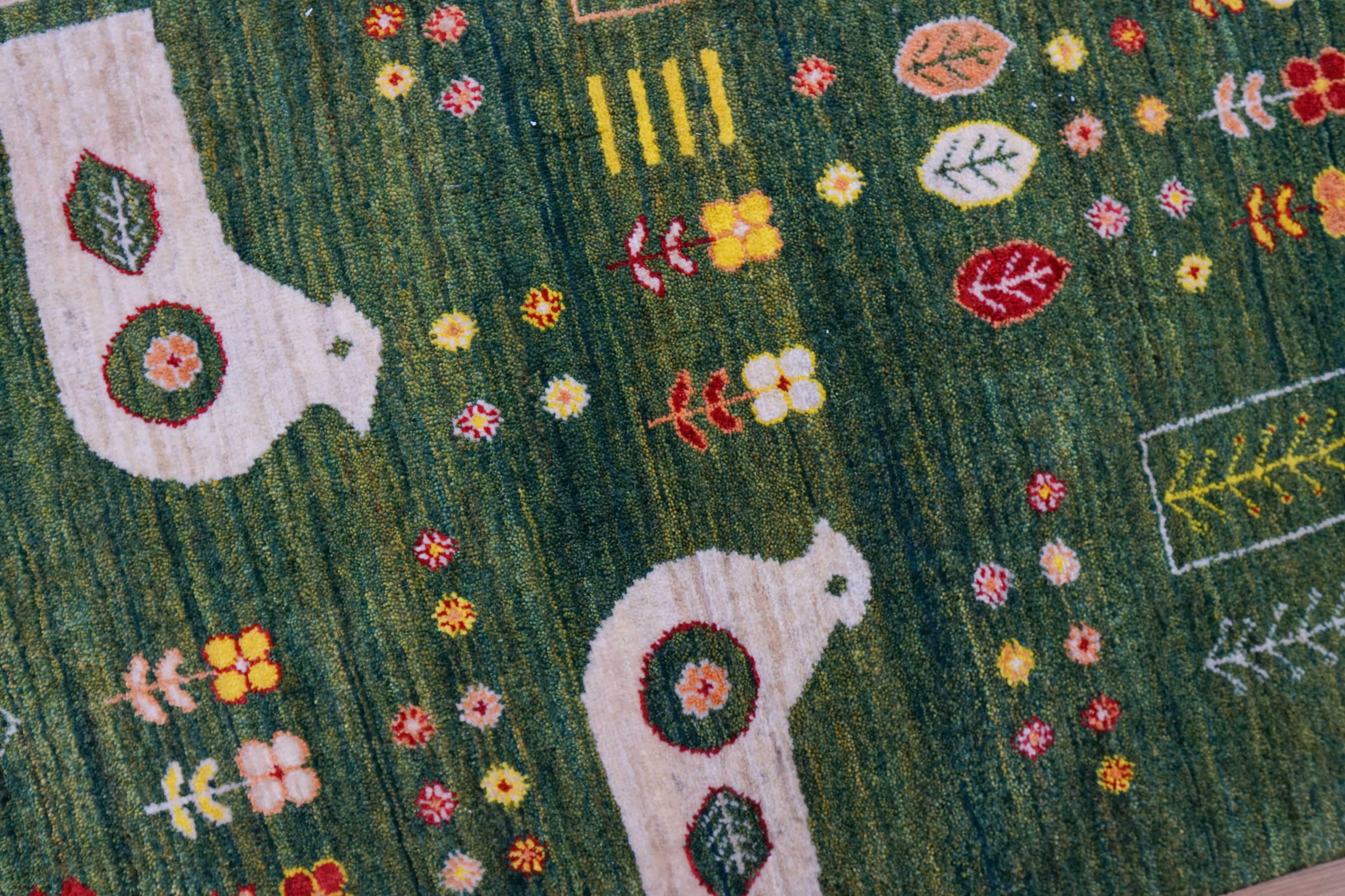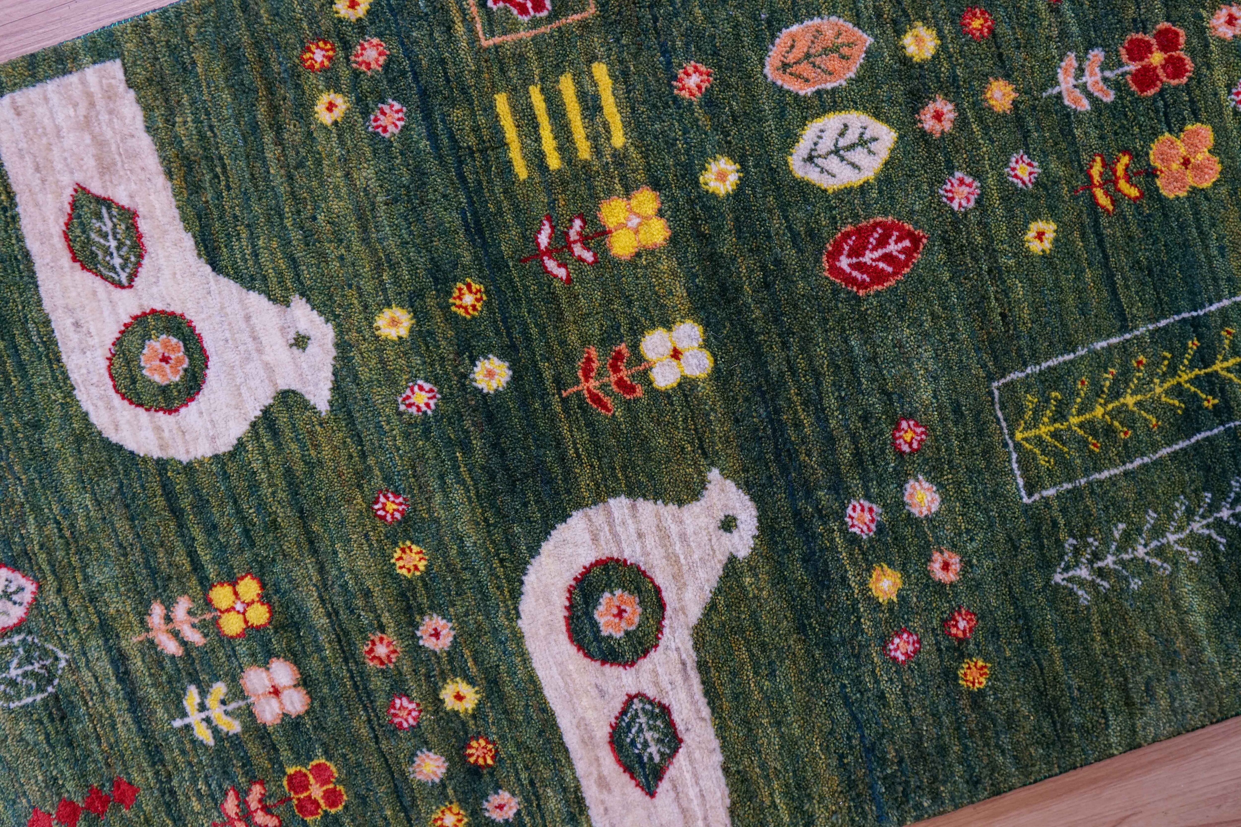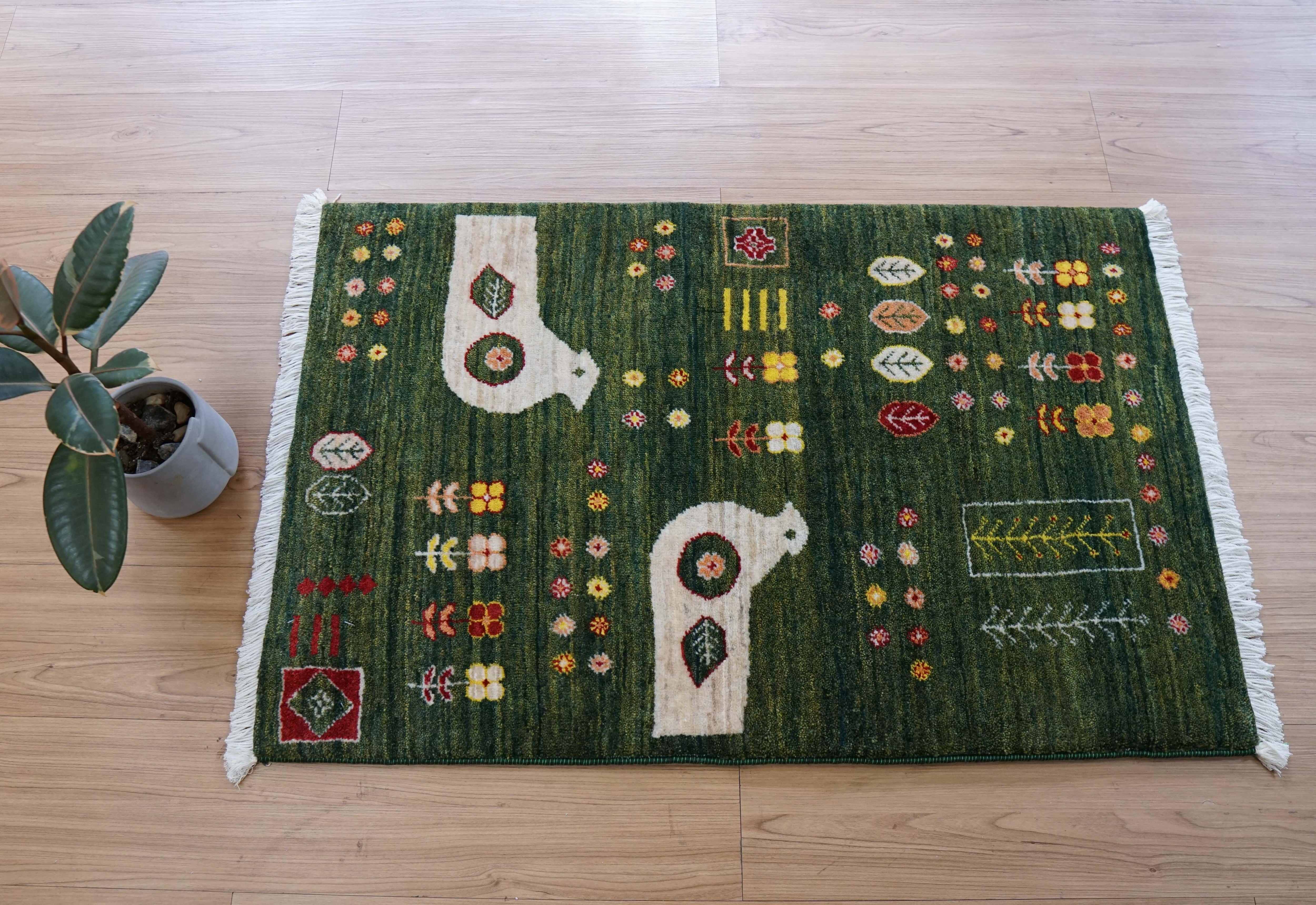 ペルシャ手織りカシュクリギャッベ リズバフト 93×62cm|緑の草原と鳥のモチーフ・高密度織り ギャベ