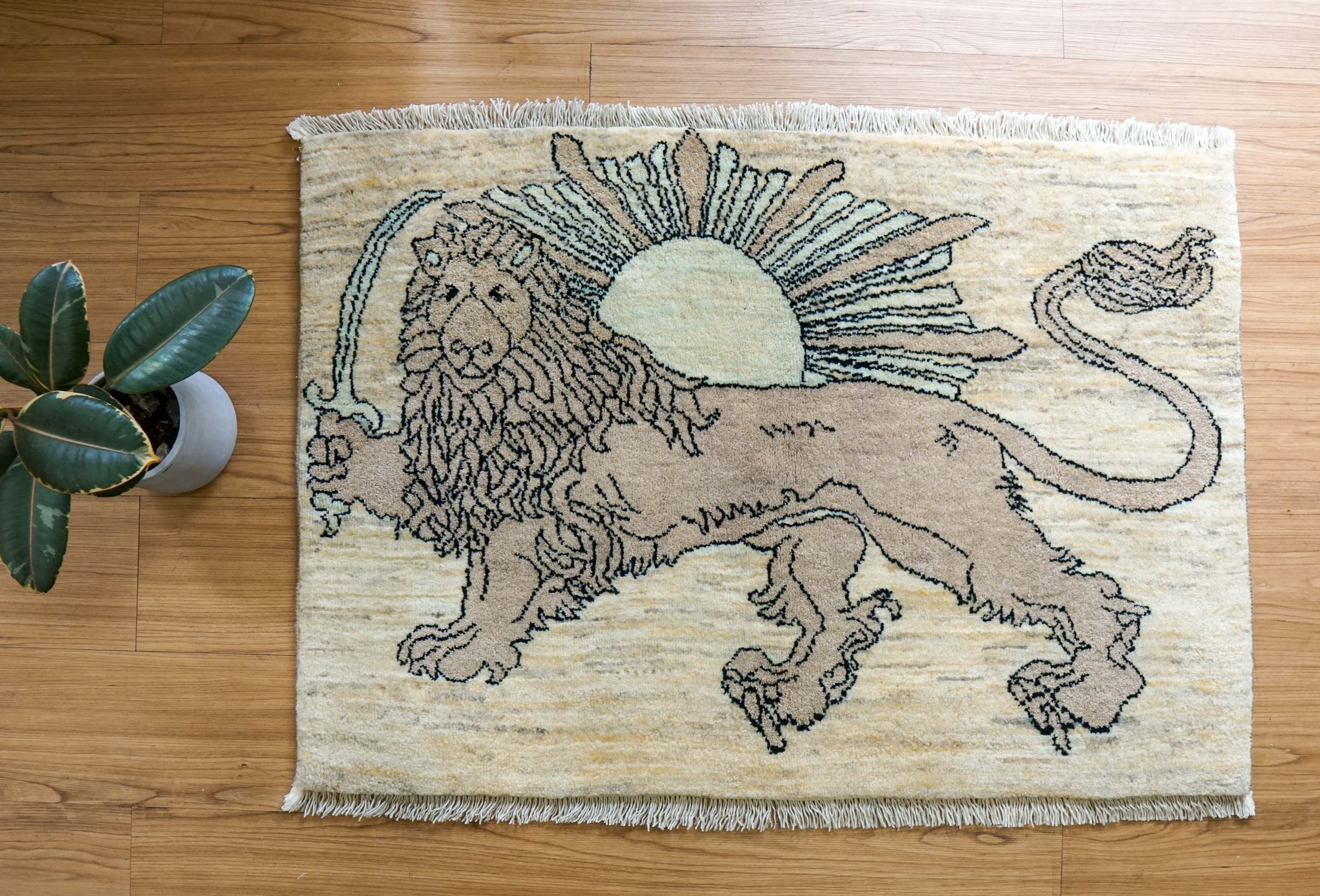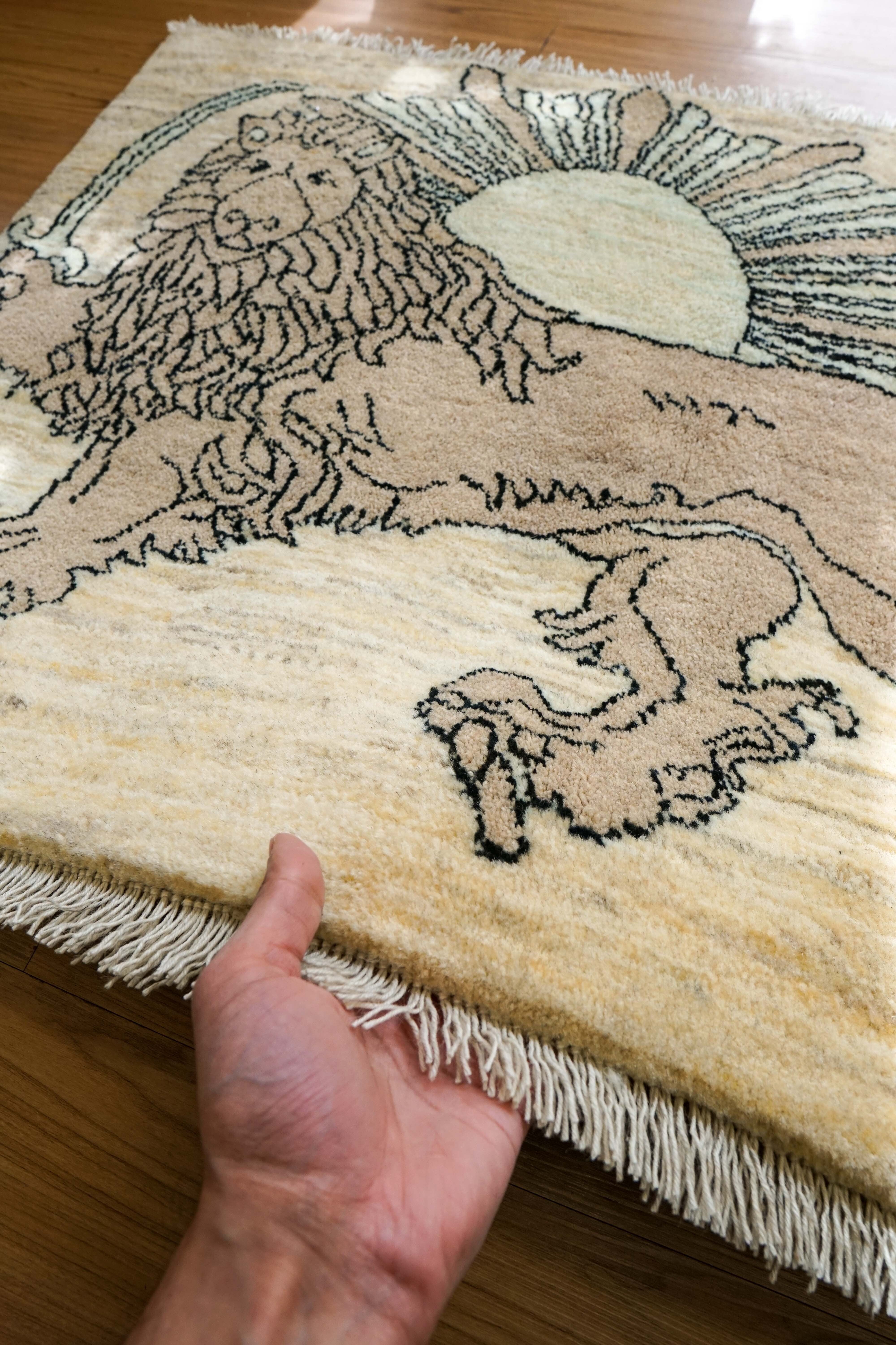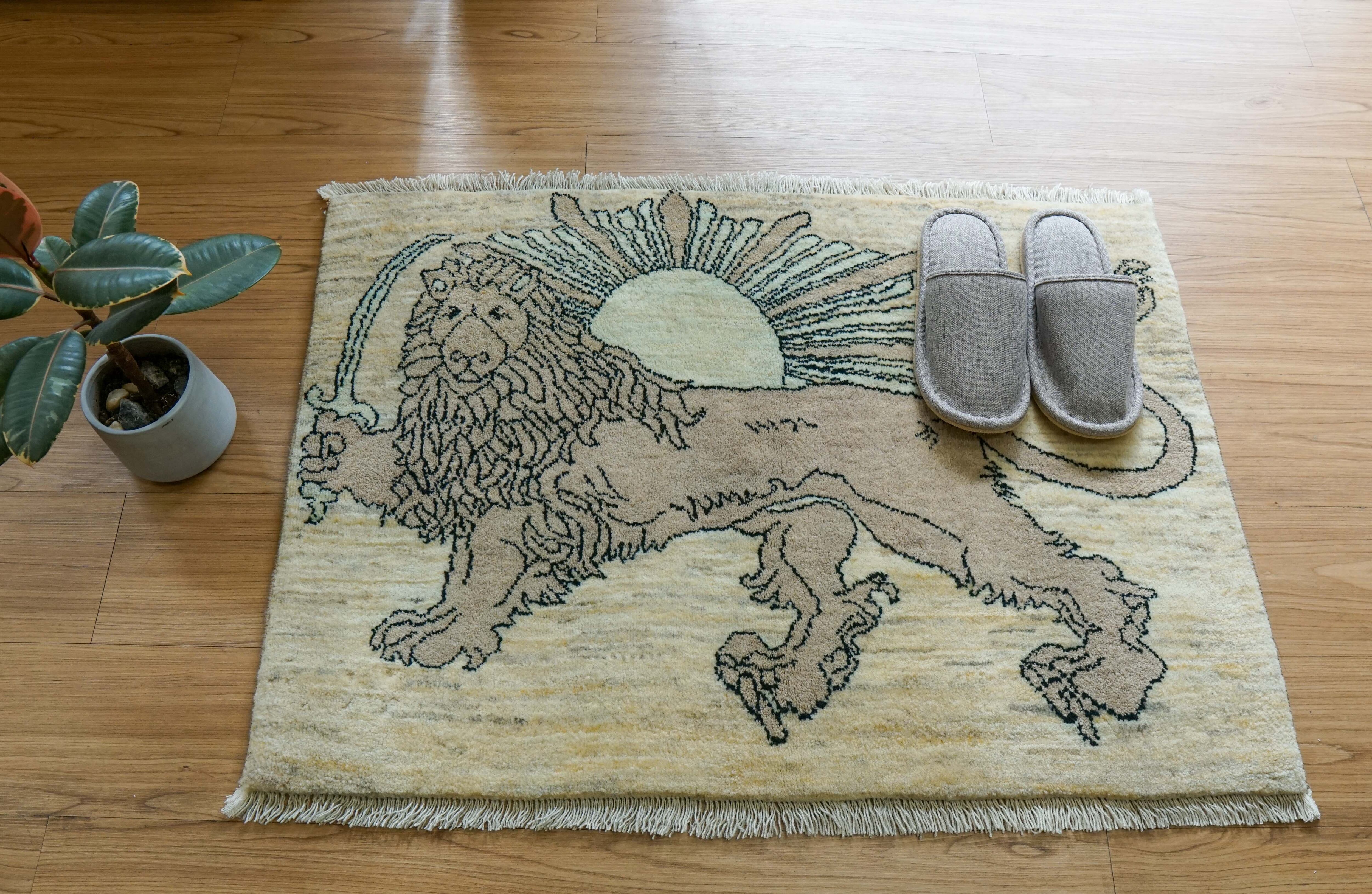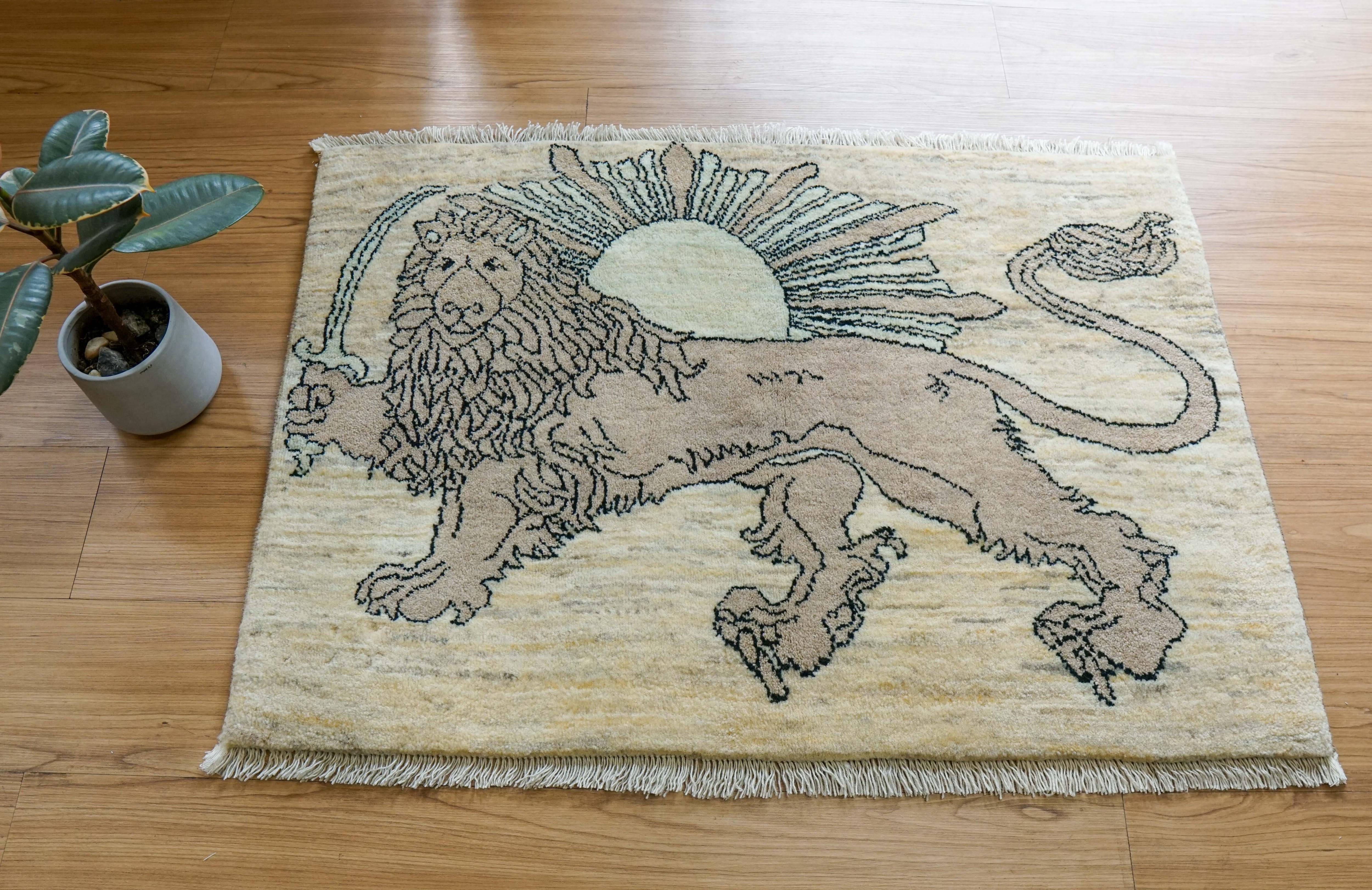 手織りペルシャ絨毯 カシュクリギャッベ リズバフト 93×65cm|ライオンと太陽デザイン|高密度織り ウールラグ 玄関マット