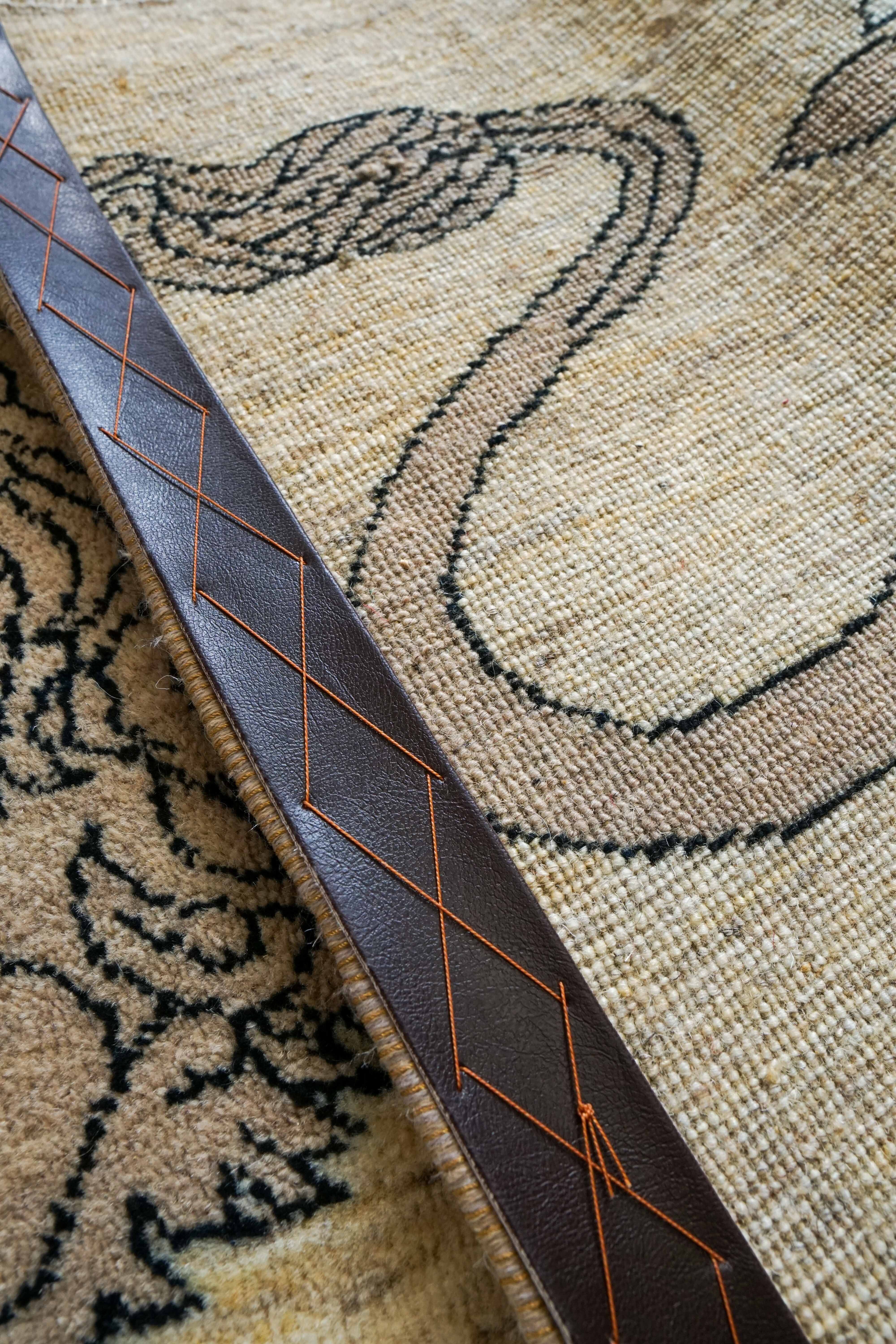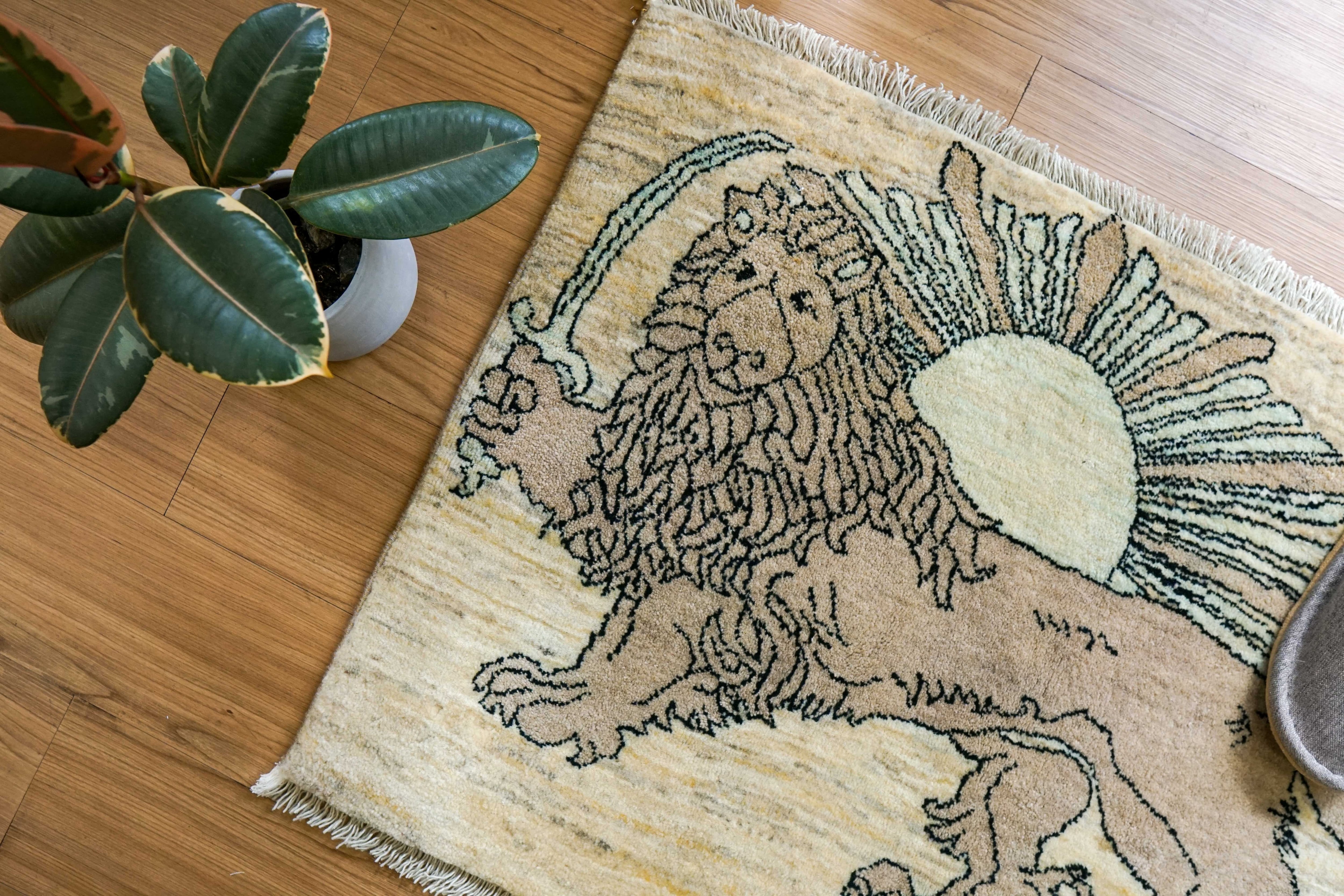 この絨毯に描かれているライオンと太陽は、古くからペルシャで「力」「守り」「生命」を象徴する特別なモチーフとされてきました。堂々と歩くライオンの背後から昇る太陽は、空間に前向きなエネルギーと温かみをもたらします。