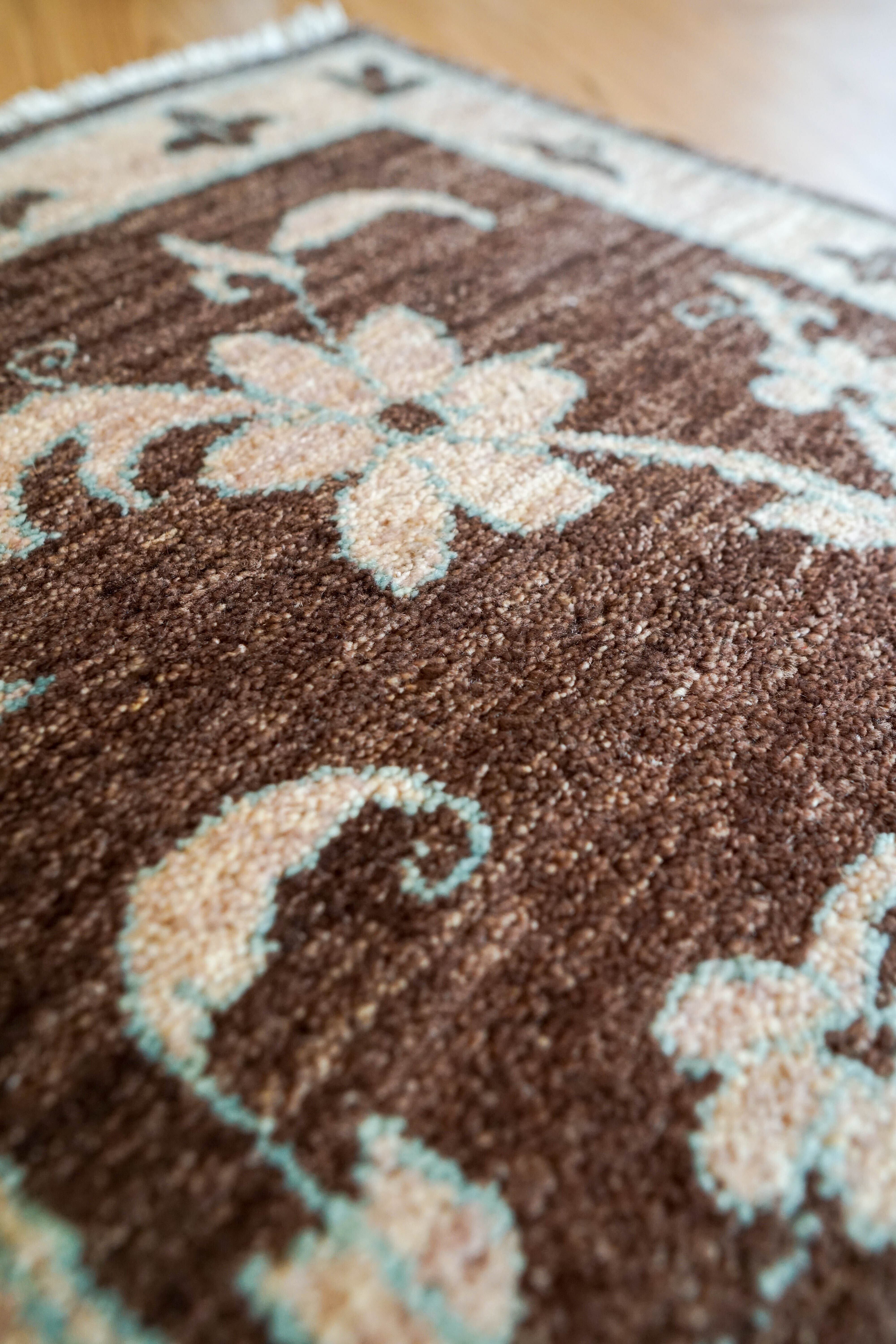 優しげなブラウンとウール本来の色味を活かしたクリーム色。額縁にいれた絵のようなデザインで、Life of treeが描かれています。神がいるとされる天空に向かって伸びる木は命のモチーフで、長寿や健康への祈りが込められた柄です。『生命の木』と呼ばれ、長く親しまれている人気の柄です。また、エッジに描かれているのは鳥のモチーフで、良い知らせの予感を意味する縁起の良い柄です。ベビーブルーの縁取りが可愛らしく、全体的に優しいカラーコンビネーションが美しい絨毯です。