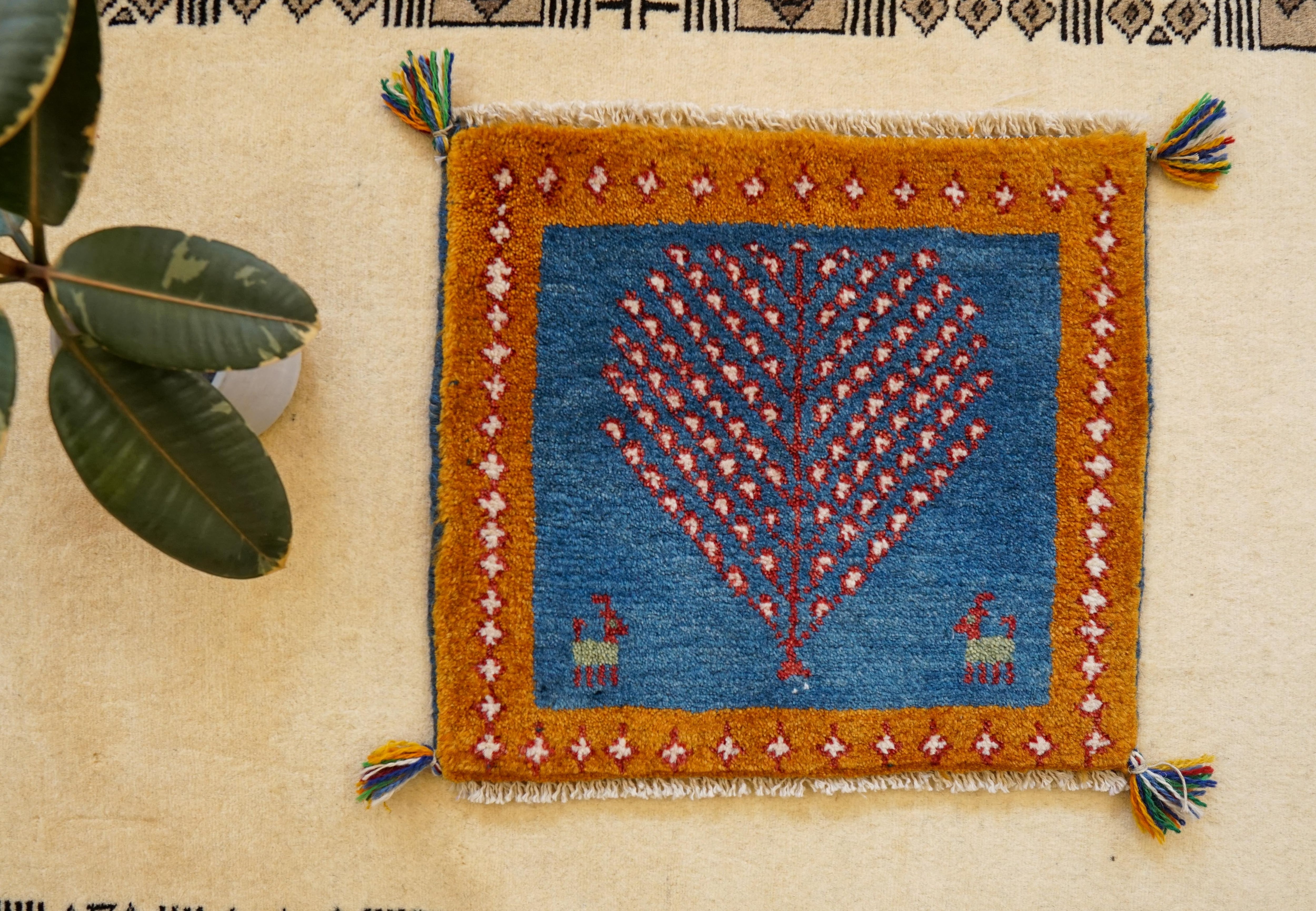 ペルシャ手織りギャッベ アマレ族 40×40cm|生命の木デザイン ウール100% ミニラグ・チェアマット