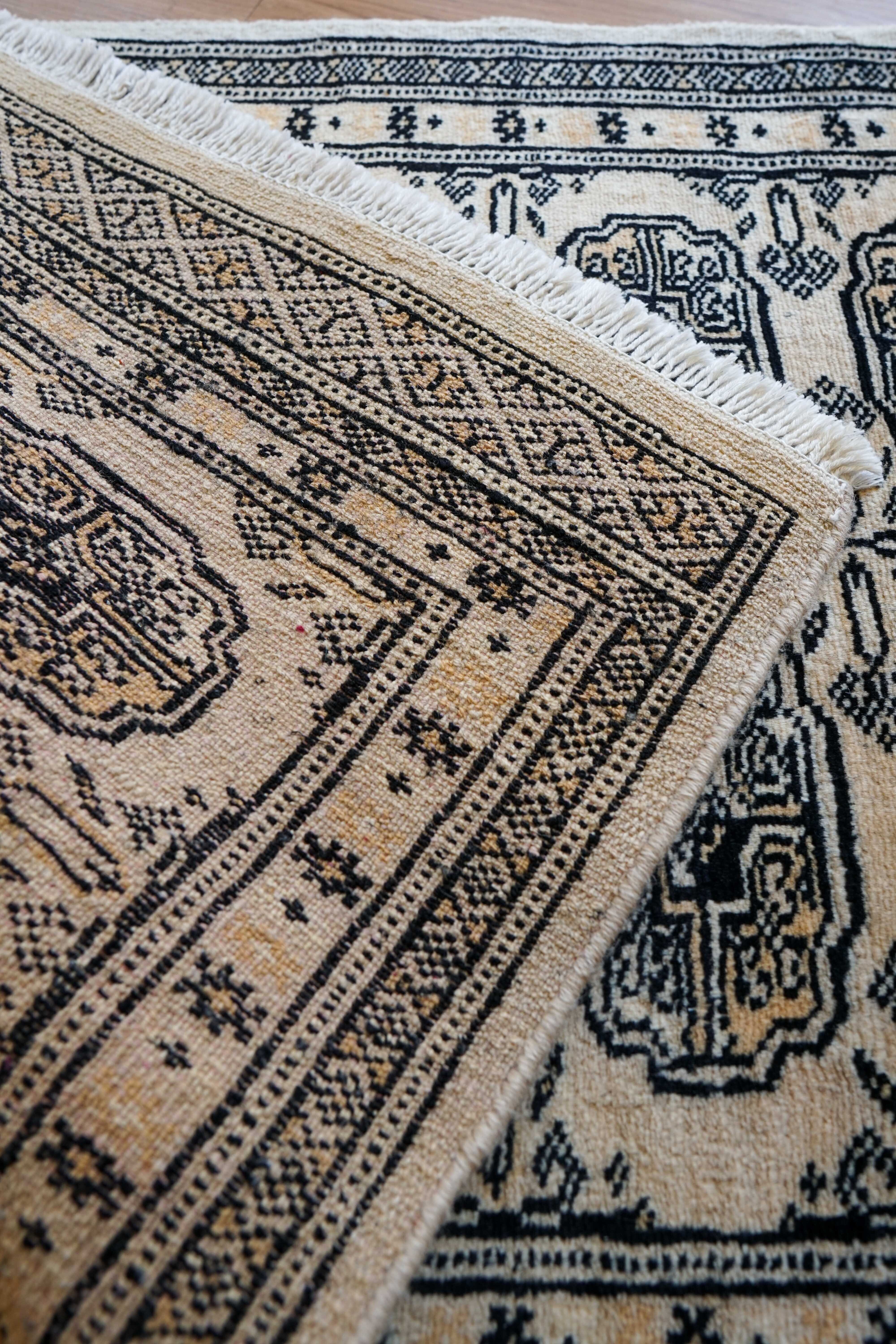 パキスタン絨毯で人気の『Bokhara(ボハラ)』は、トルクメニスタンの国旗にも使われている由緒ある柄で、象の足跡をモチーフにしています。
