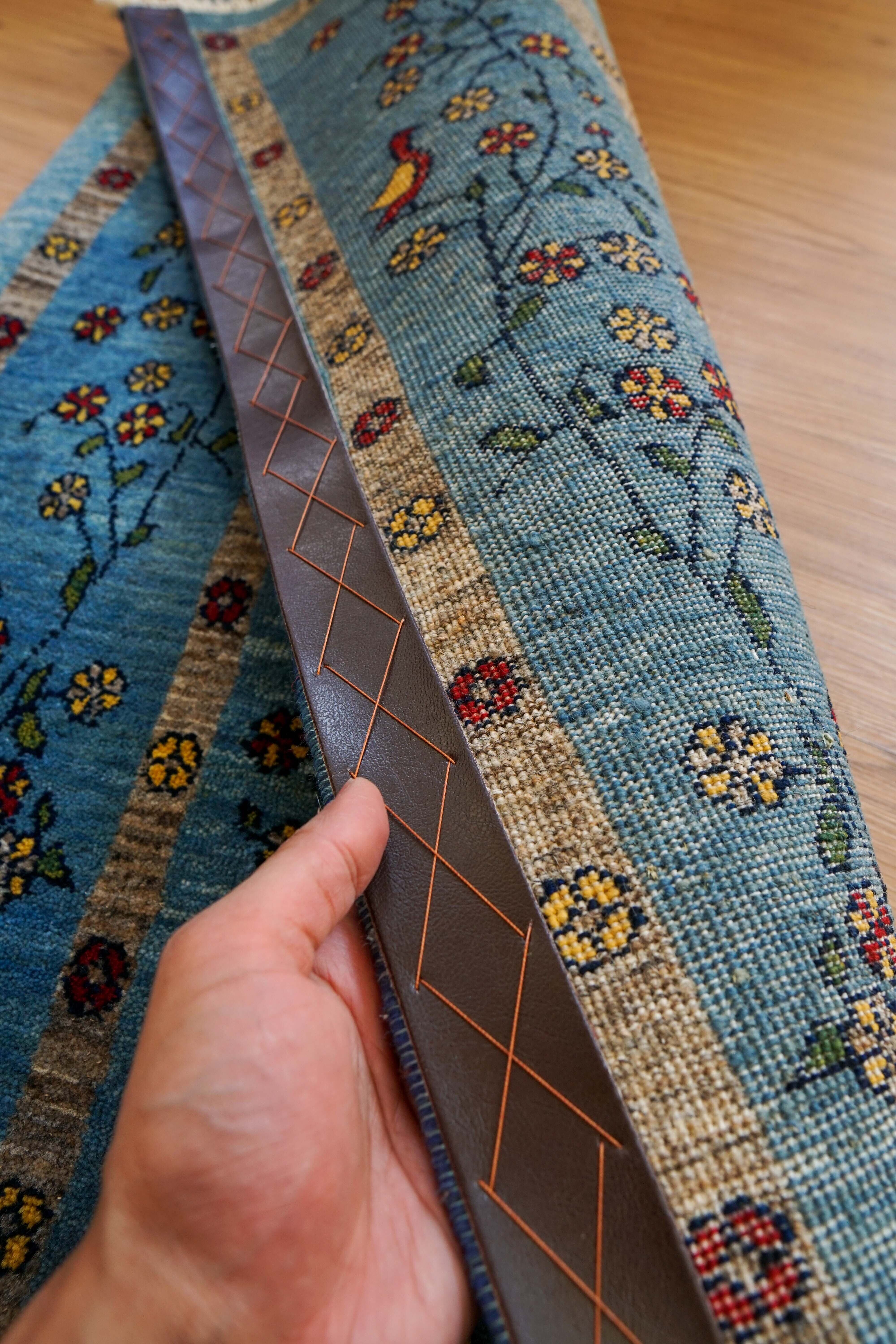 色調は落ち着いた青を基調に、赤や黄の草花が控えめに配され、素朴でありながら深みのある印象。天然染料ならではのやわらかな発色が、空間に自然に馴染みます。