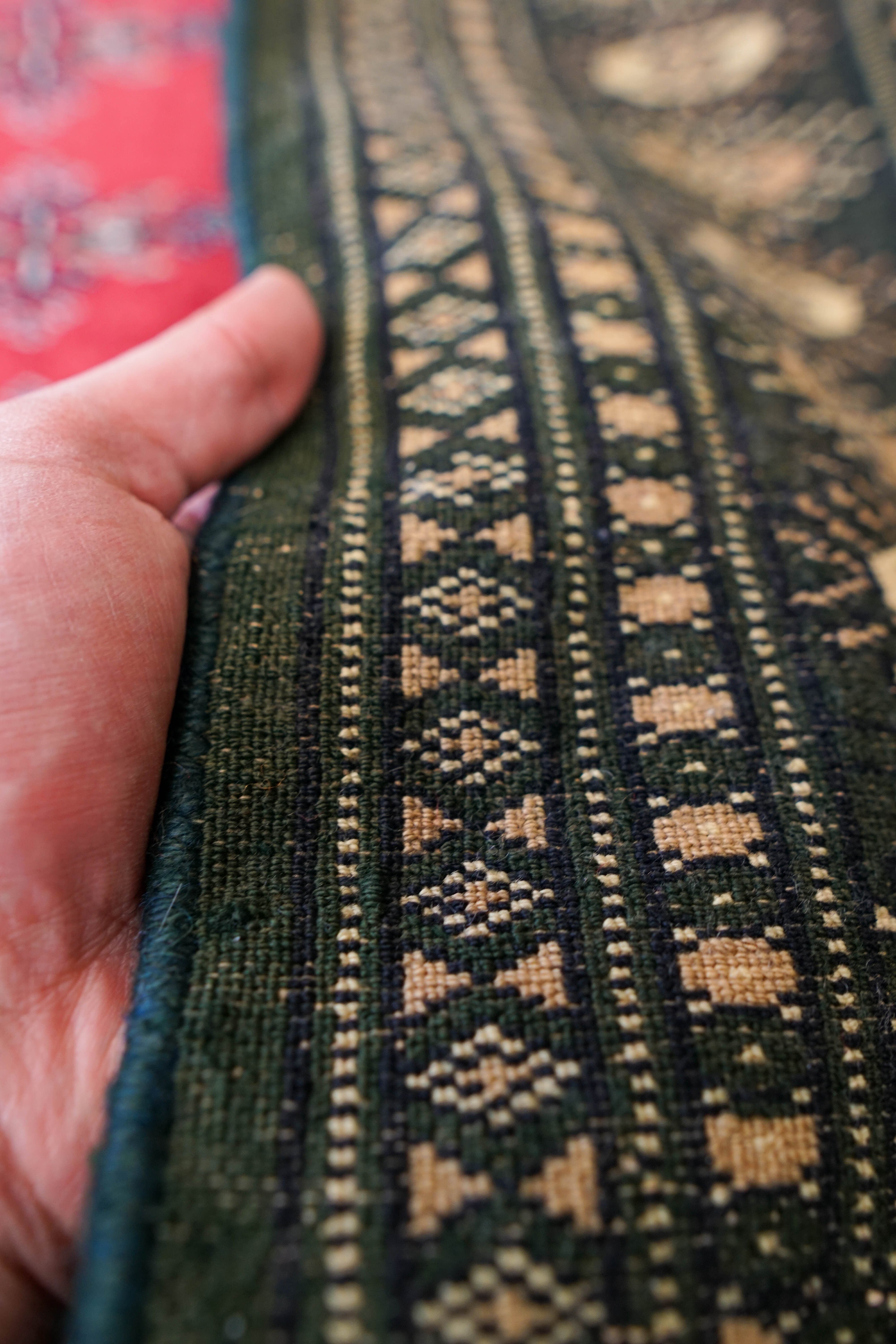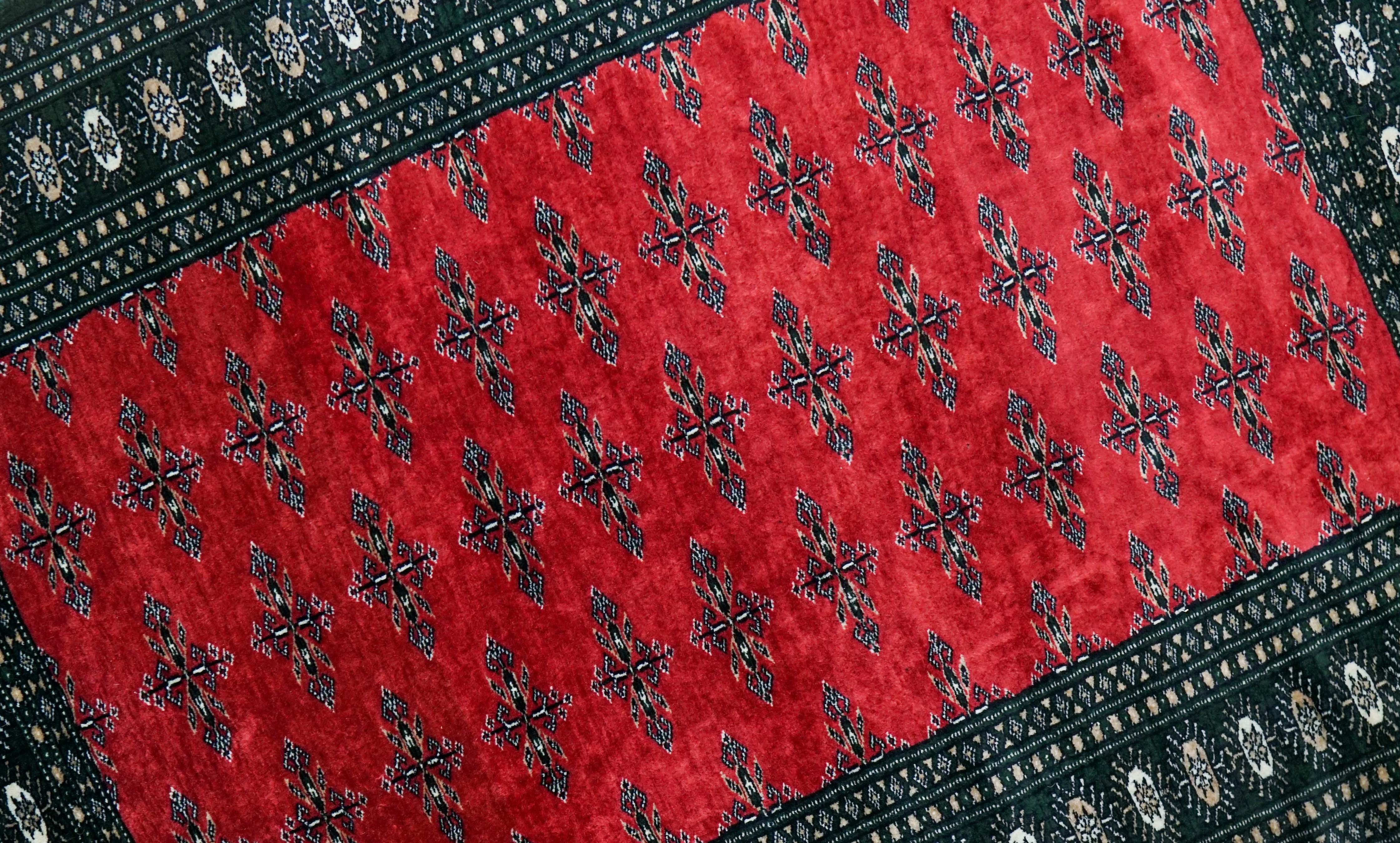 やわらかくピンクがかった赤を基調に、深いグリーンのボーダーが全体を引き締める、上品な印象のパキスタン手織り絨毯です。落ち着きのある配色でありながら、空間にさりげない彩りを添えてくれます。