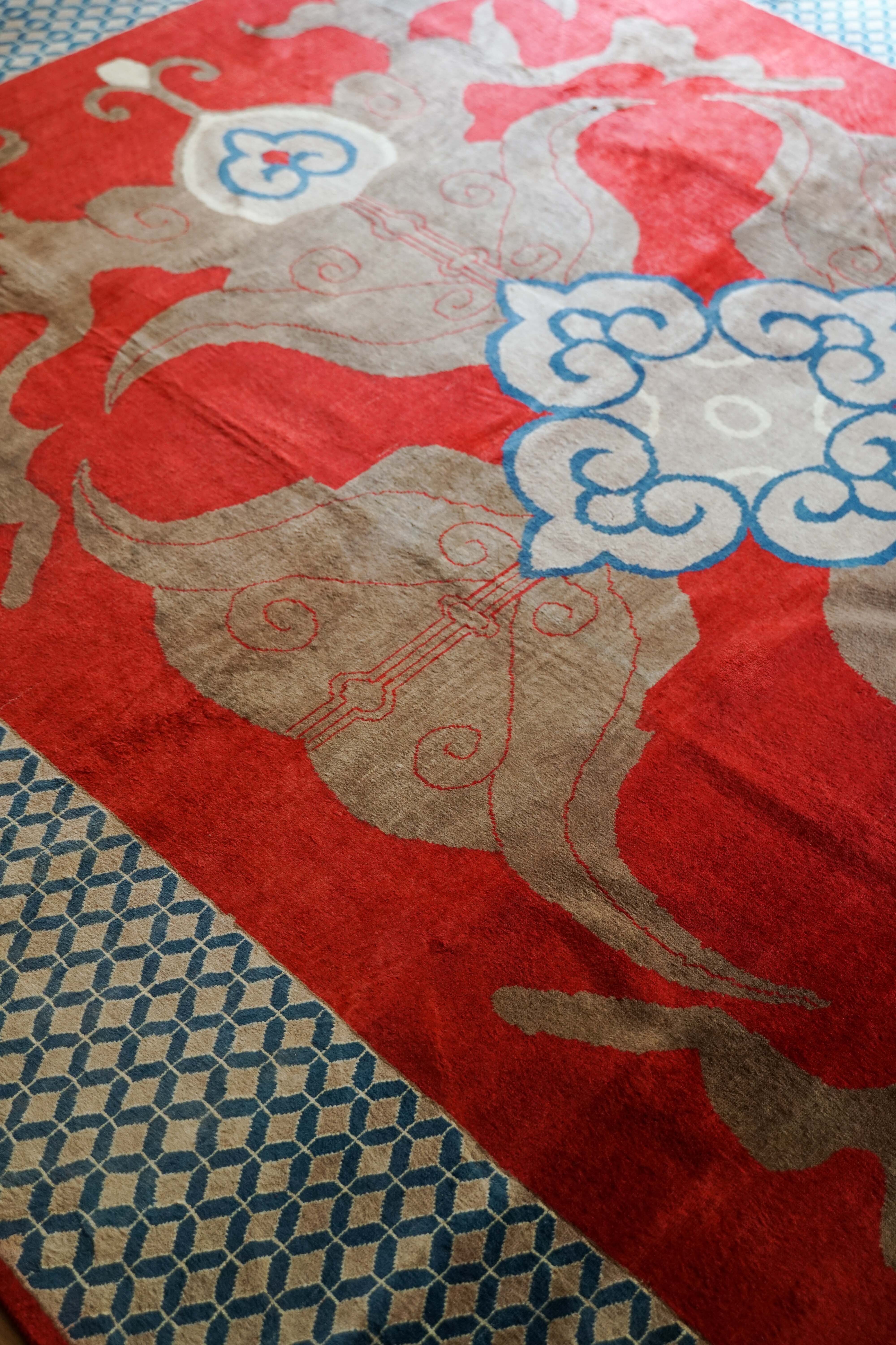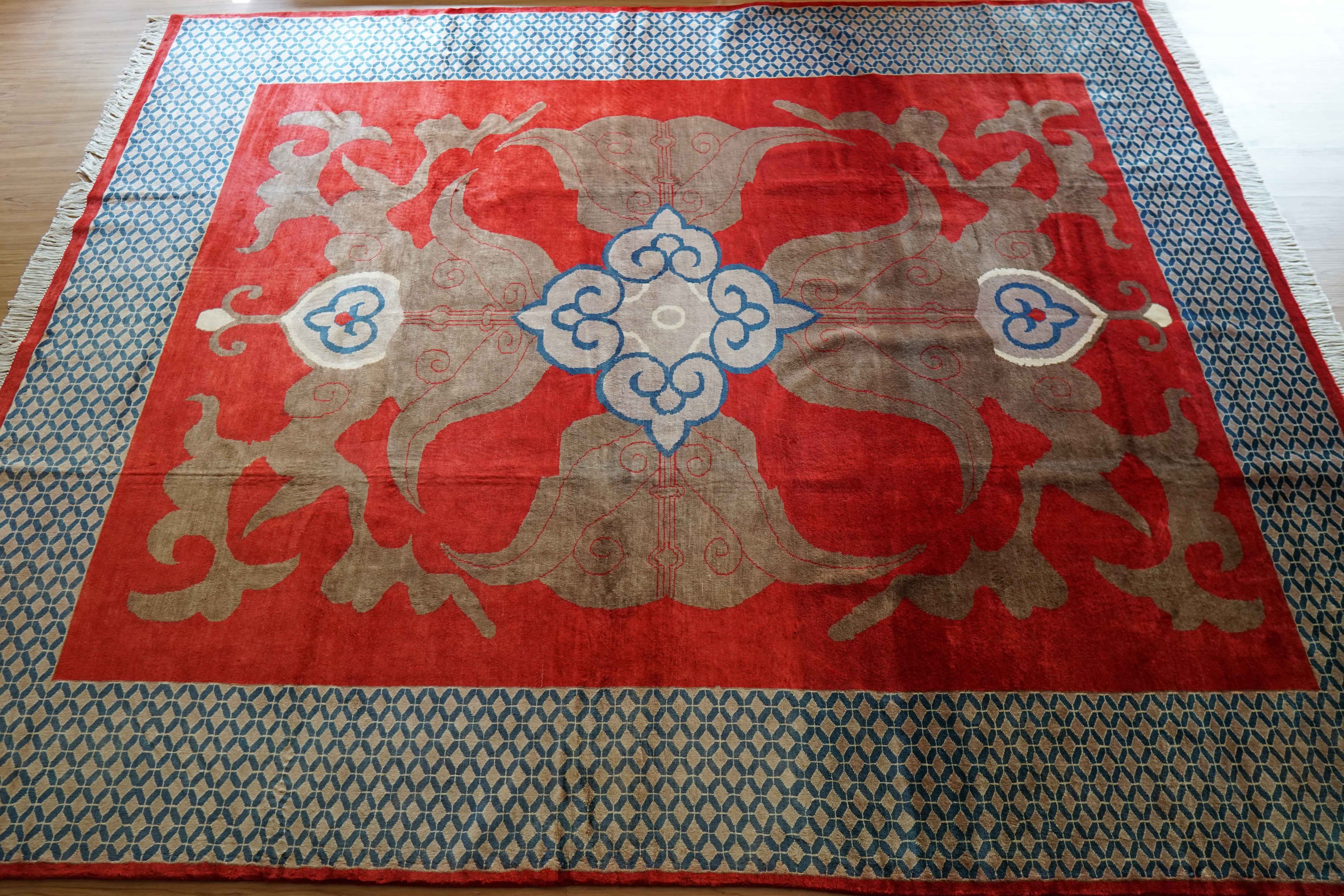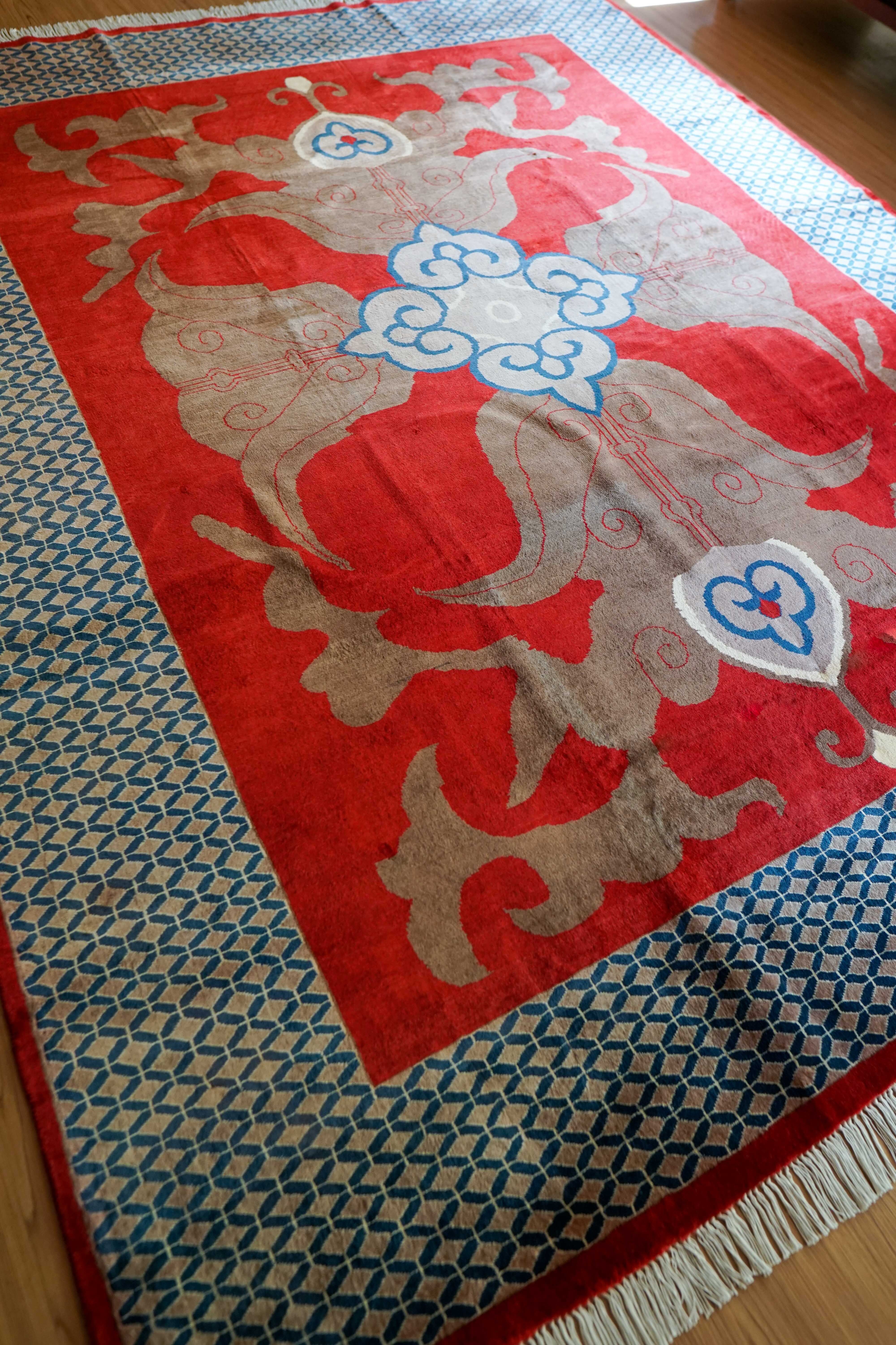 中央には大きく広がる曲線的なメダリオンと草花文様が描かれ、空間にゆったりとした流れを生み出します。外側のボーダーには細かな幾何学模様が整然と配され、全体をやさしく引き締めています。赤と青、ベージュの組み合わせが落ち着いたコントラストをつくり、和洋どちらのインテリアにも自然に馴染みます。