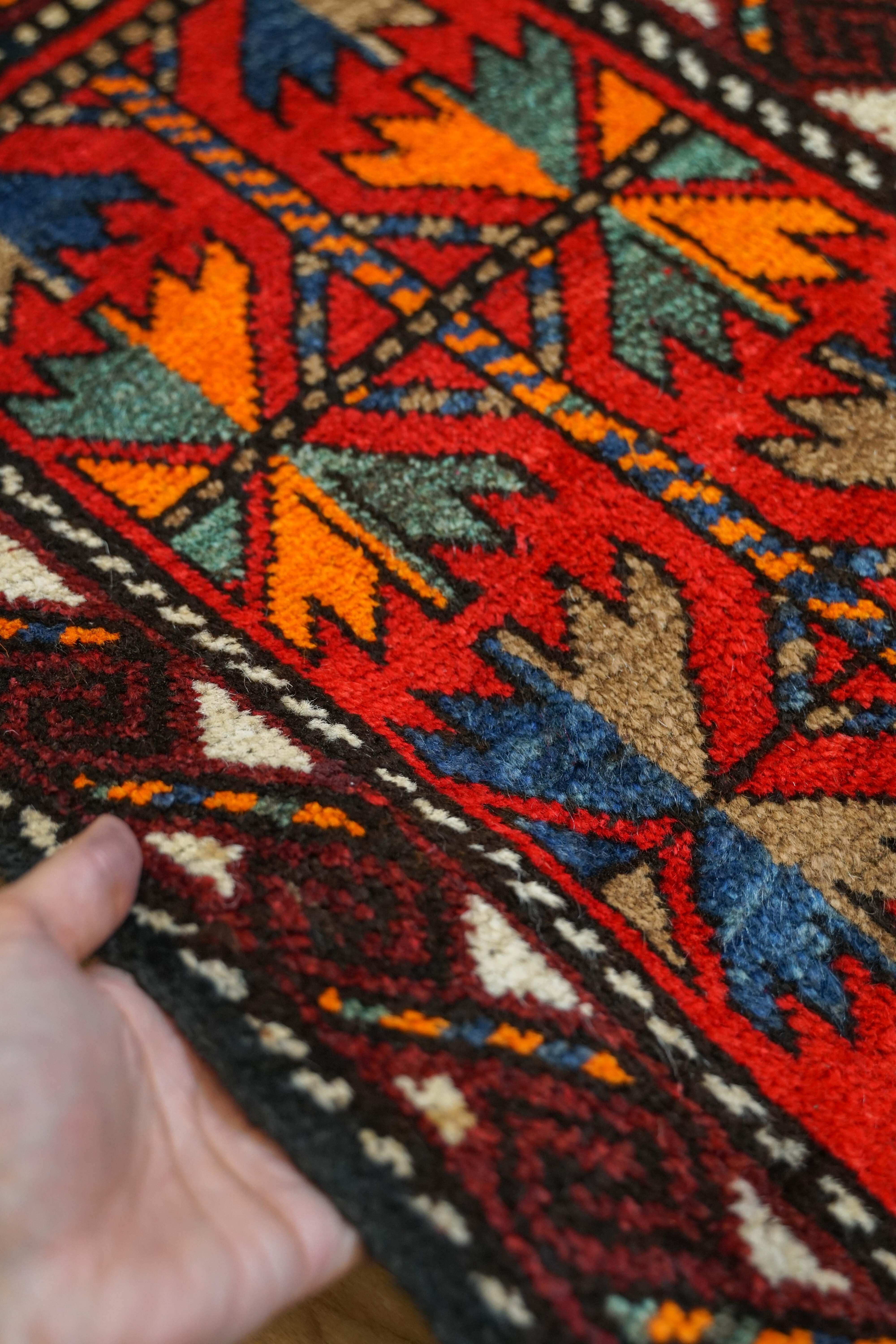 深みのある赤を基調に、力強い幾何学文様が印象的なバルーチ族のトライバルラグです。