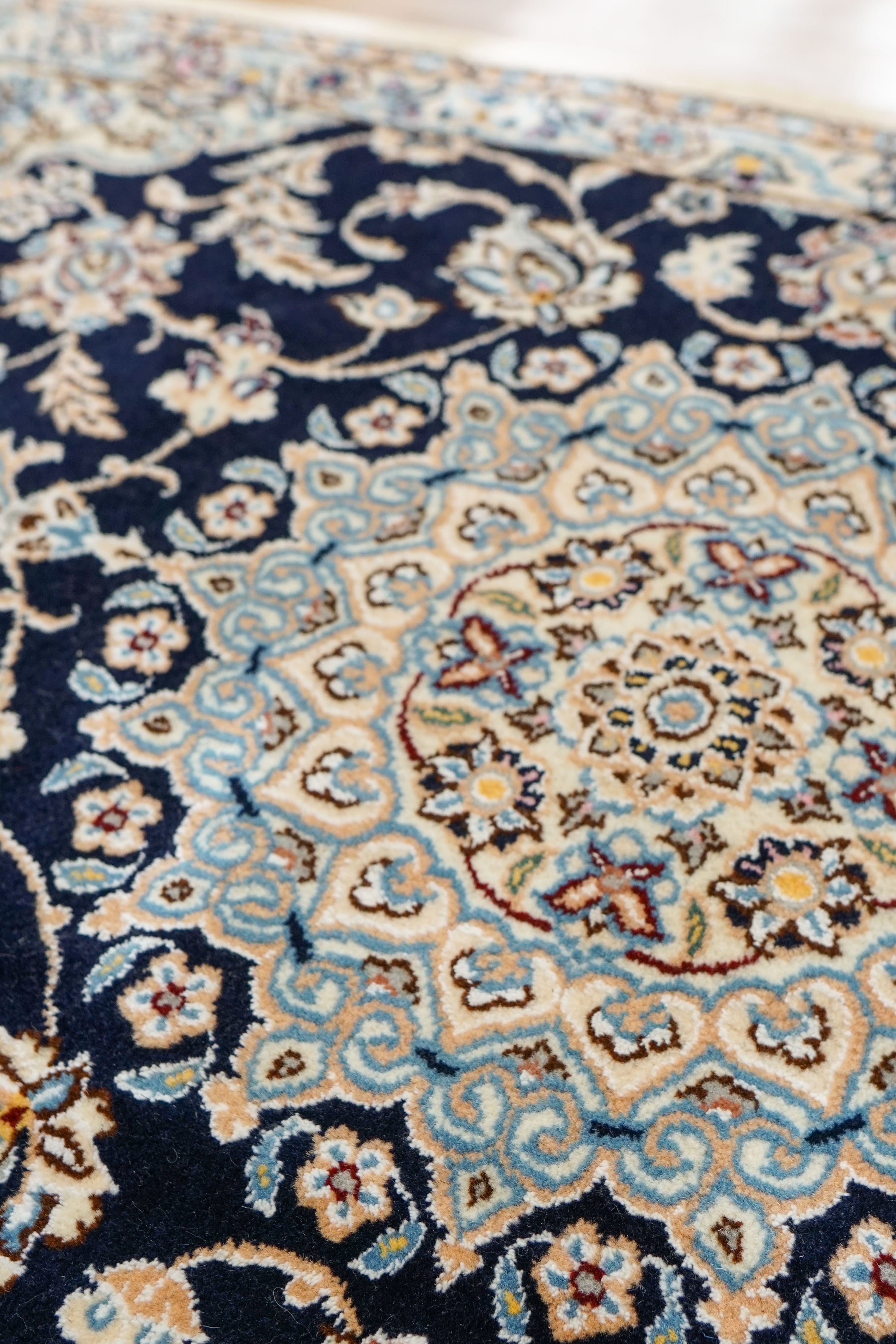 ナインはイスファハンに近い歴史ある産地で、緻密な織りと上品な配色で知られています。砂漠の町に咲く芸術とも称され、職人たちは代々受け継がれた技術で、一本一本丁寧に結び上げていきます。その細かさは、手織りならではの温もりと気品を同時に宿しています。