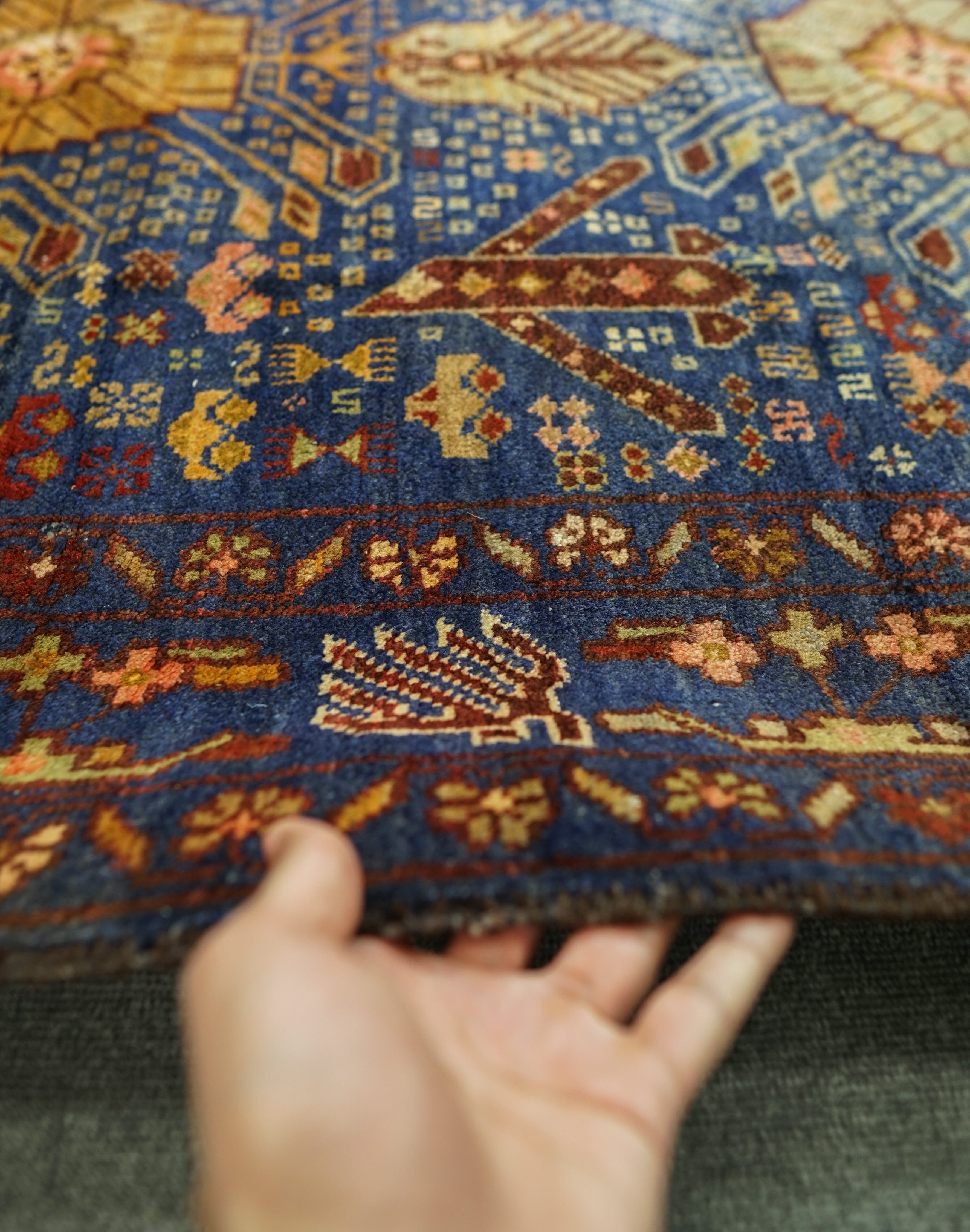 草木染めを施した上質なウールを使用し、アフガニスタンの職人が手織りした絨毯。織り手の故郷を表現した作品で、作物や花、車などさまざまに描かれています。不均一な色味がアンティーク感を高める1枚。
