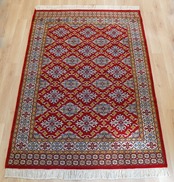 ダイヤを型取った花が大きく開いており、黄色の小花がジャルダルデザインを描いています。あえて艶を抑えて仕上げることで高級感を高め、より色の深みを楽しめるようになっています。伝統的な柄を巧みに取り入れた美しい絨毯です。