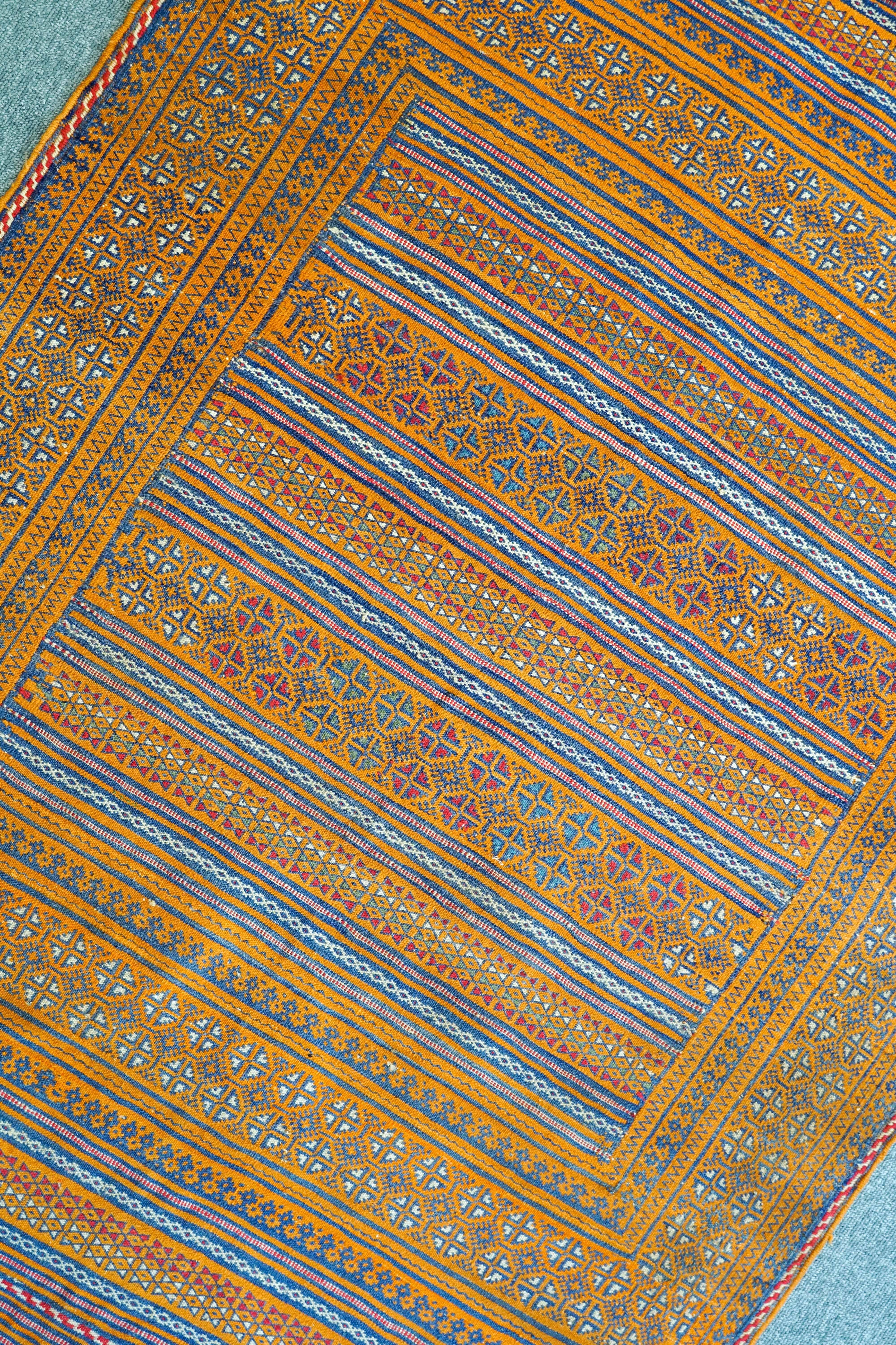 ペルシャ、シラーズ産のトライバルラグ。キリムという種類の毛足のない平織り絨毯です。素材はウールですが、麻のようにさらっとした肌触り。薄手で通気性に優れて夏場でも涼やかにお使いいただけます。他国のキリムと比較して柄が細かく、表面もなめらかです。