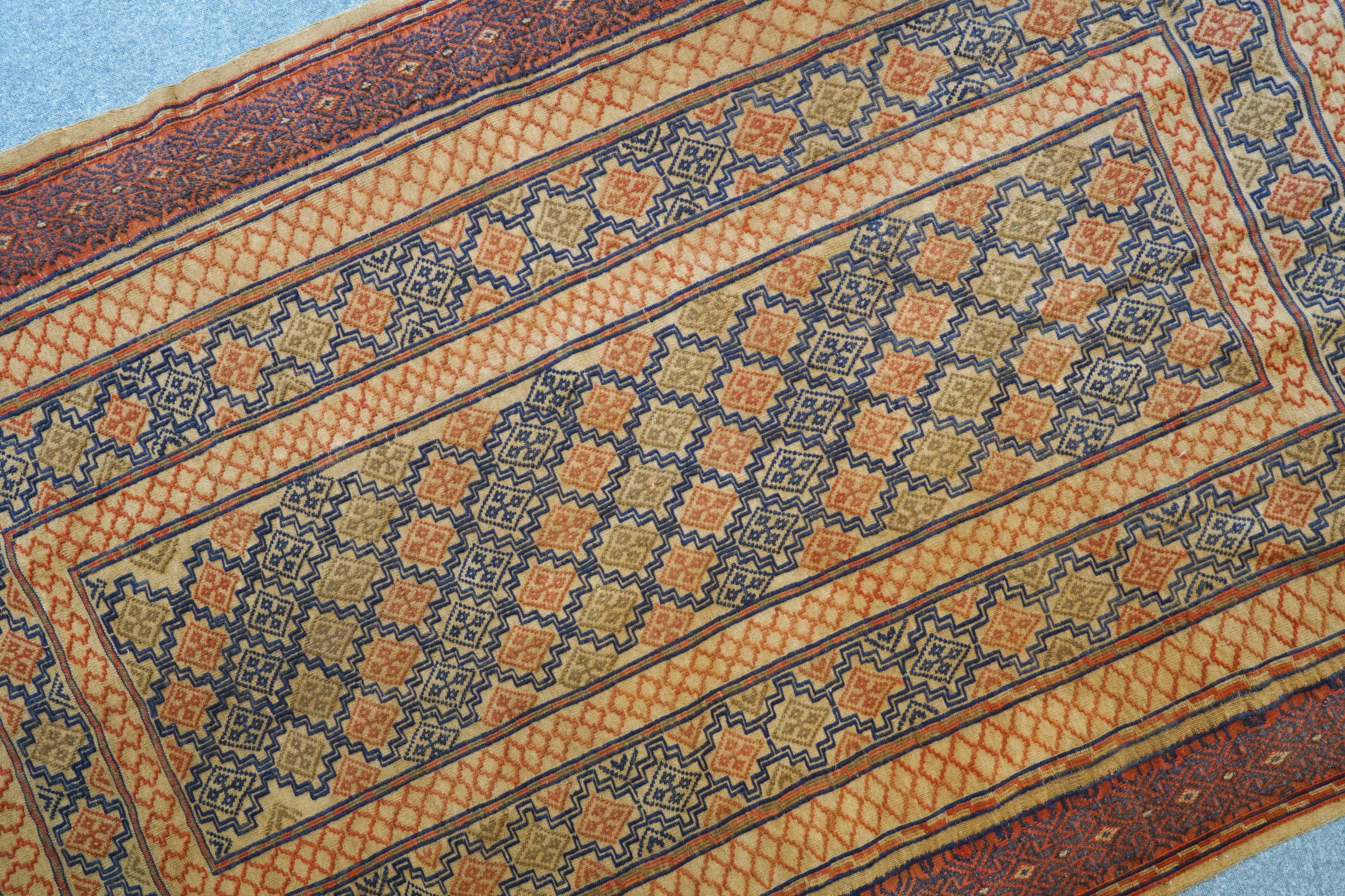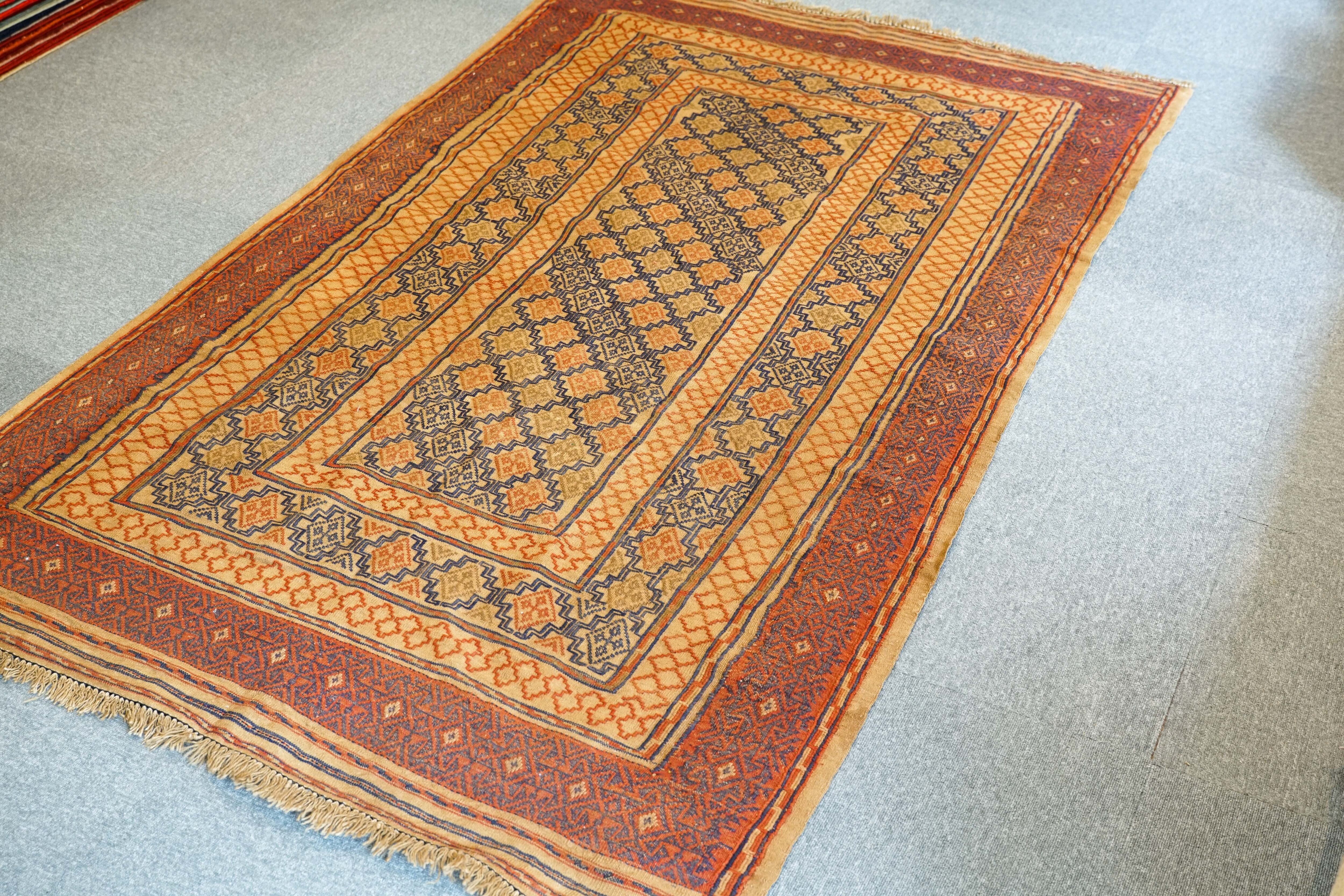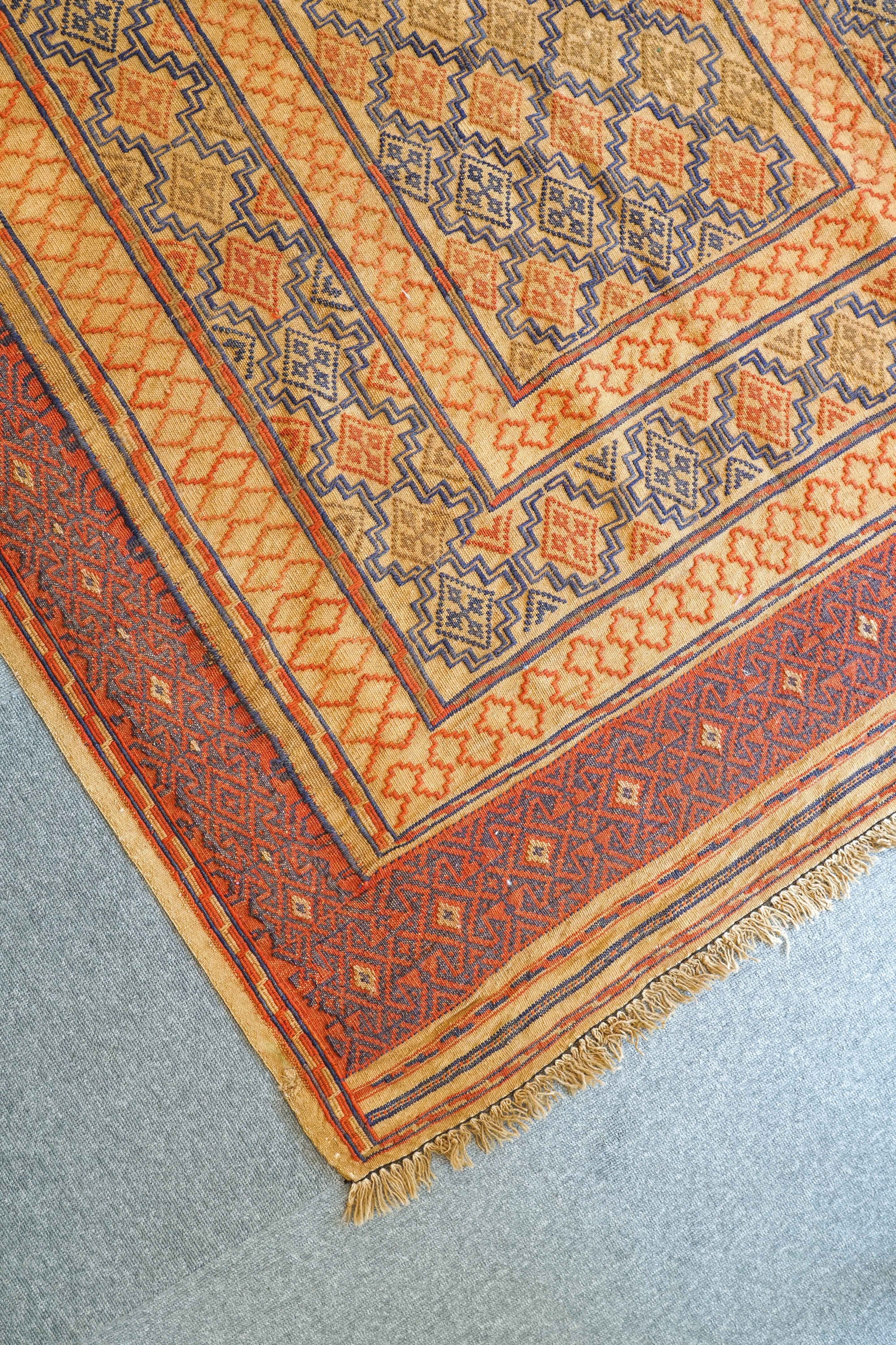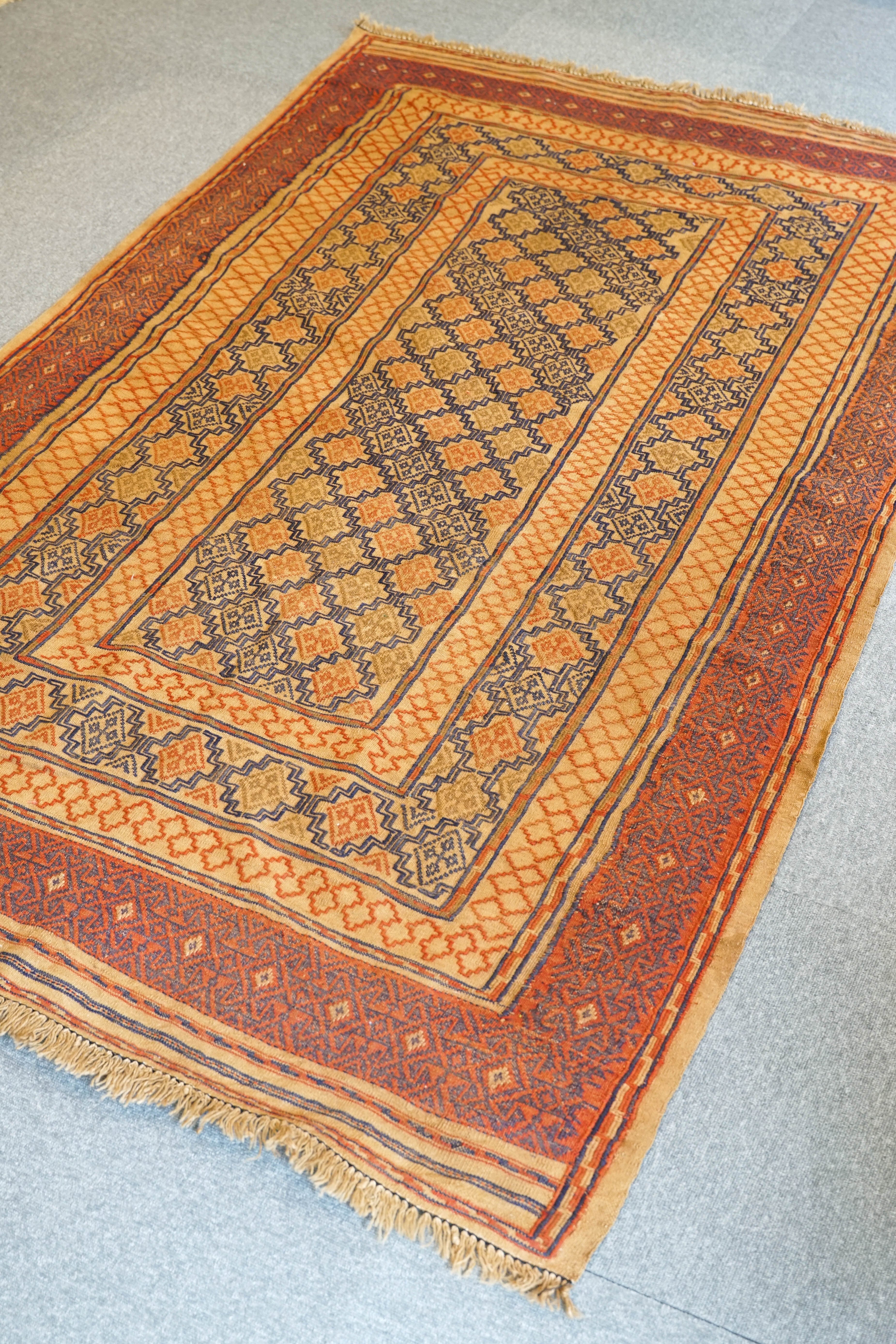アフガニスタンで織られたトライバルラグ。キリムという種類の毛足のない平織り絨毯です。素材はウールですが麻のようにサラッとした肌触りで、薄手なので夏場でも涼やか。草木染めを施したウールを100%使用しているため、化学染料に比べて安全性が高く、お子様やペットにも安心してお使いいただけます。