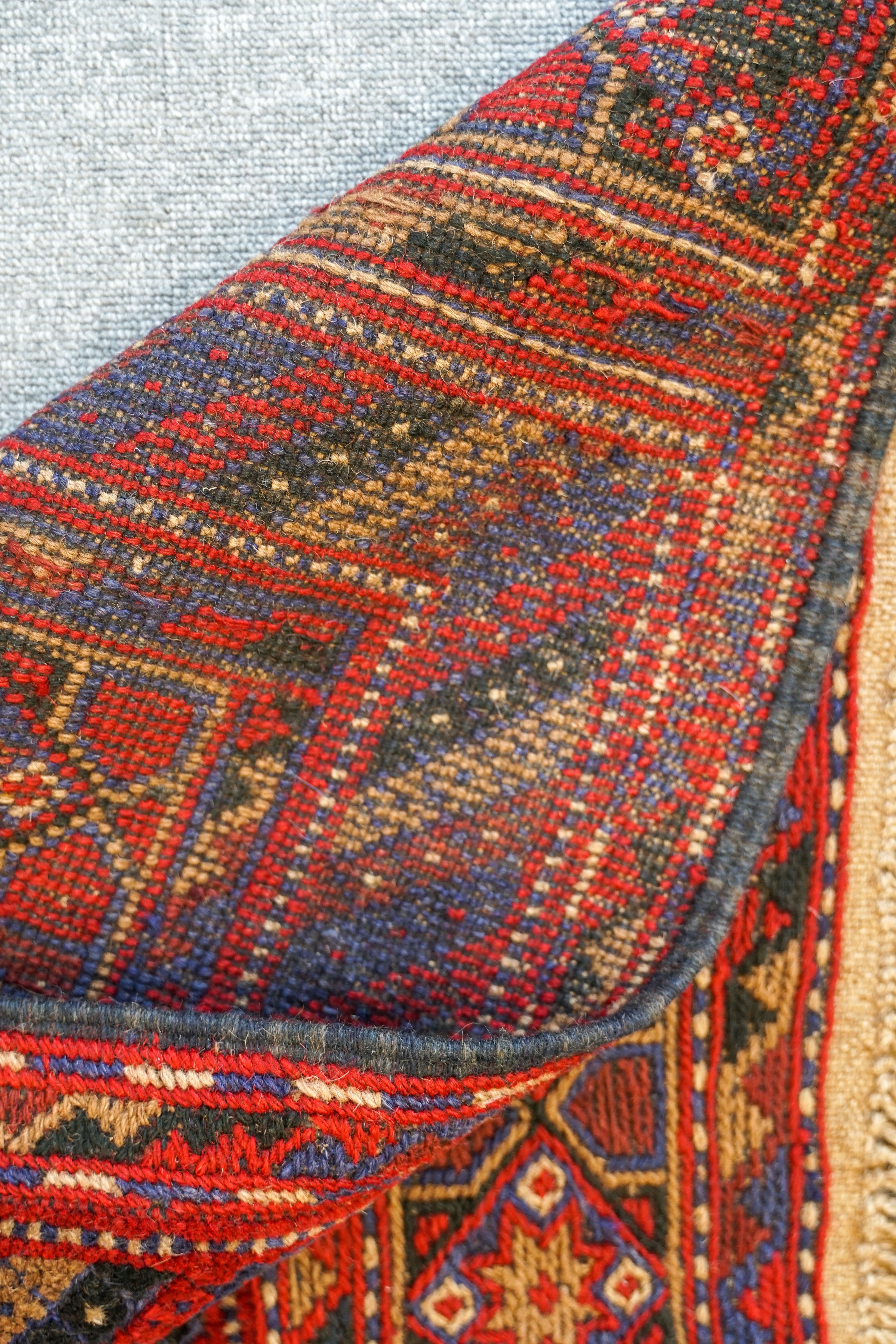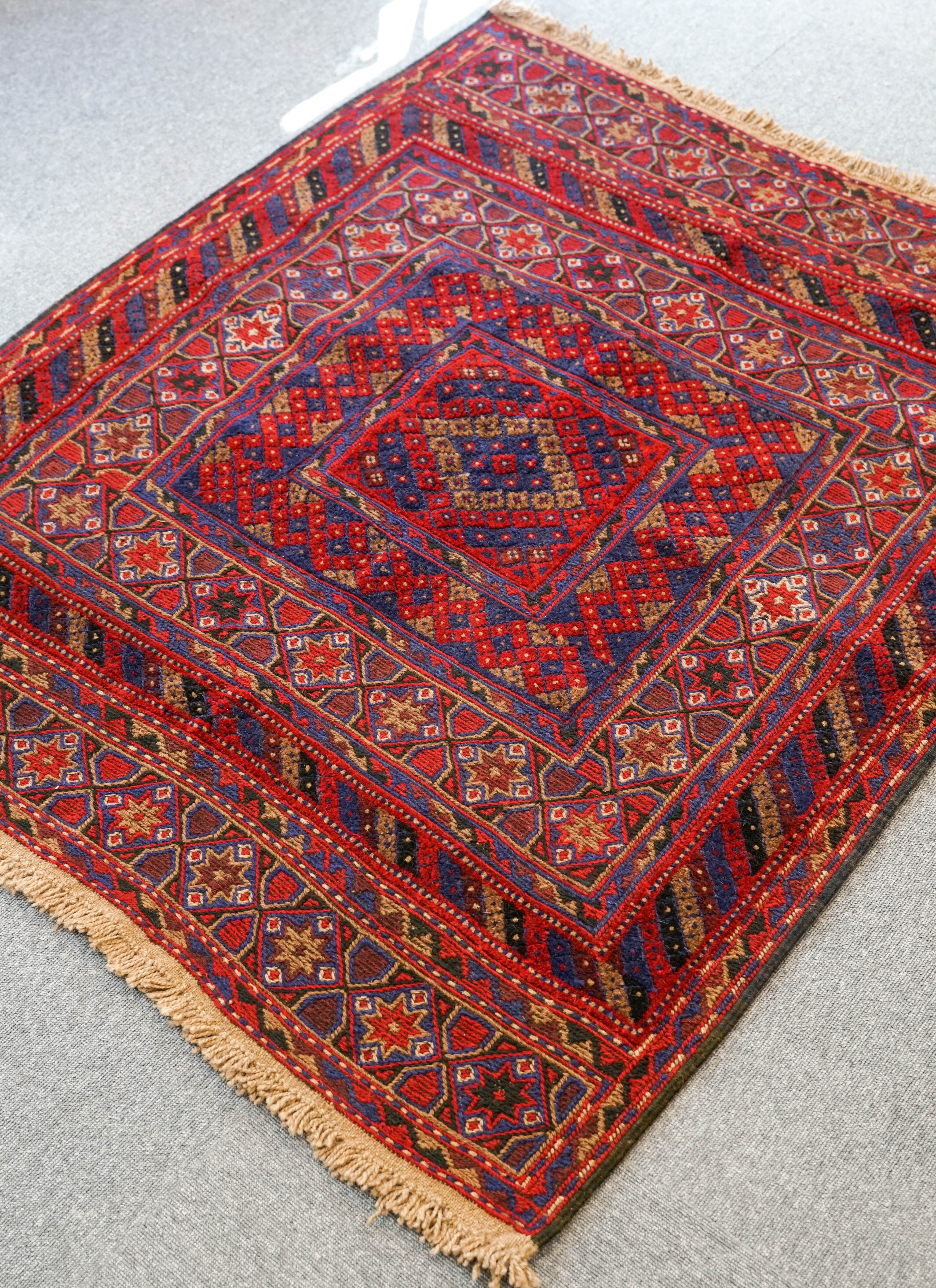 アフガニスタン ヘラート産のマシュワニキリムです。マシュワニ族という部族が手織りしています。彼らの得意とするスマック織りという技法は、複雑な織り技術を要するため難易度が高く、希少で日本ではあまり出回っていません。