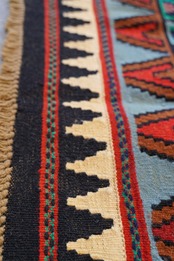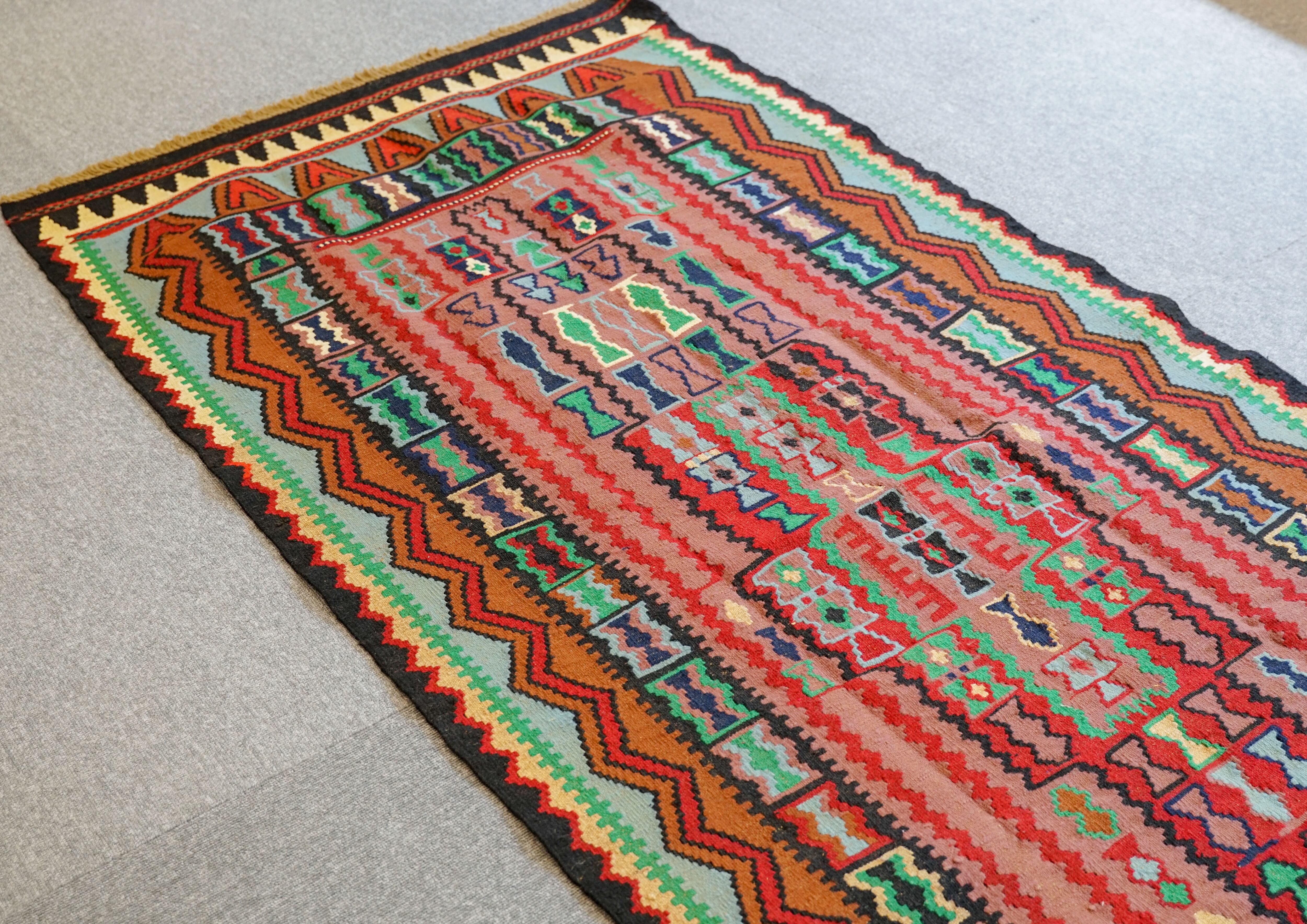トルコ、イラン、アフガニスタンを主な産地とする毛足のない平織りのトライバルラグで、汚れれば水洗いをし、破れれば修理をしたり袋物に作り変えたりと現地では大切に使われています。