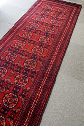 落ち着いたモチーフ、派手すぎない深い赤色が特徴で、トライバルラグらしいオリエンタルな雰囲気をもちつつも、モダンな家具にしっくりくる不思議な魅力があります。