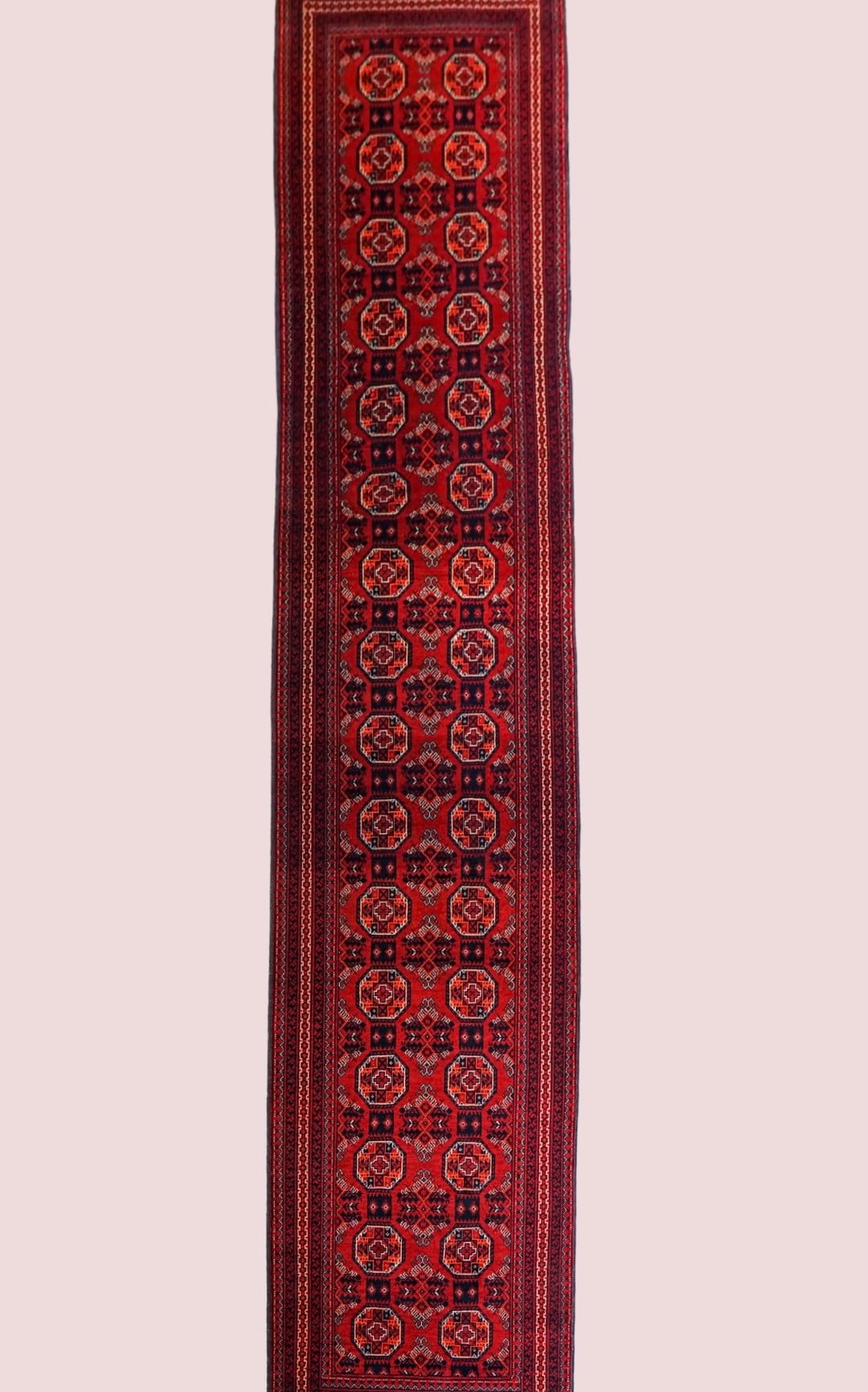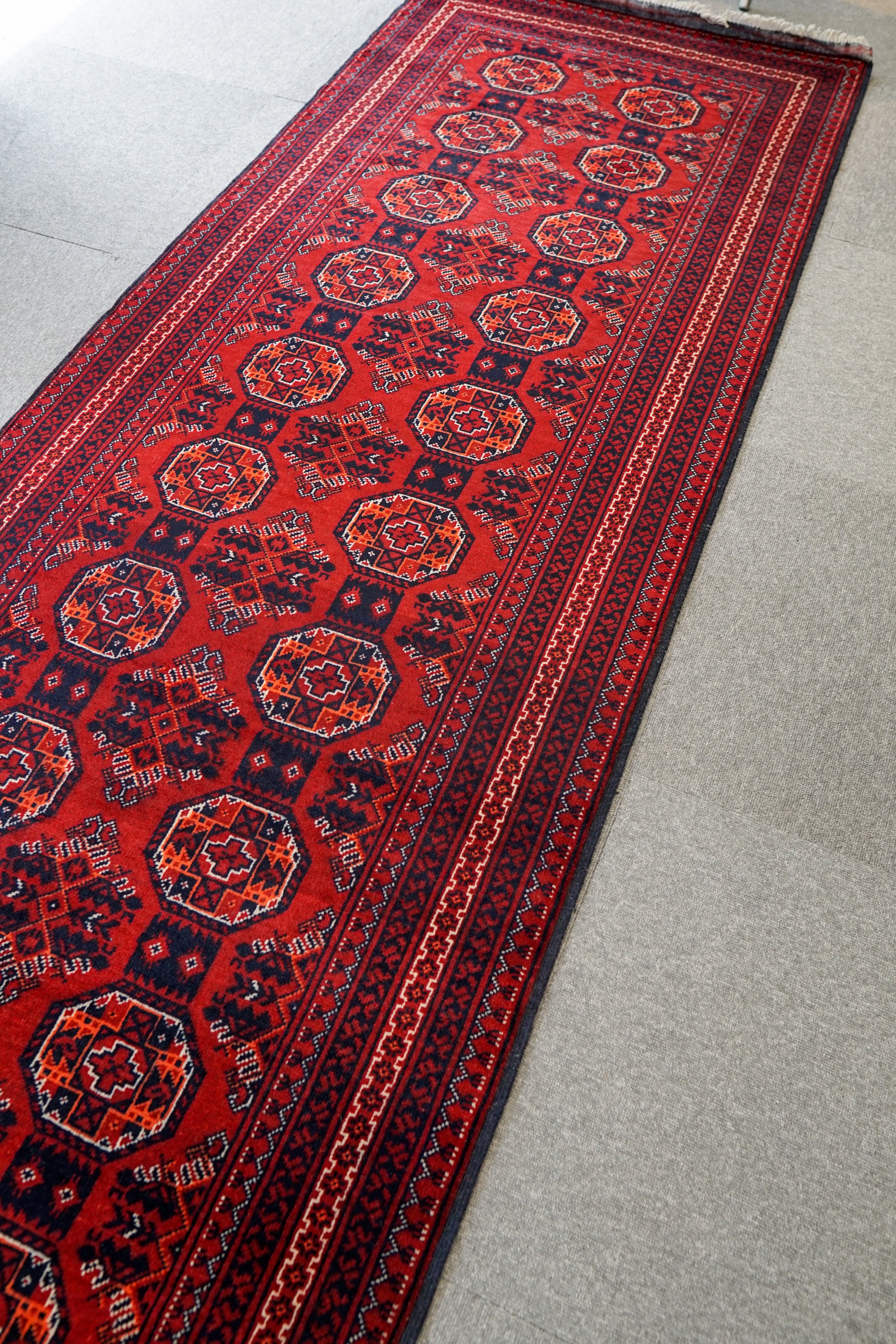 深い赤色と黒色のアフガニスタン絨毯らしさあふれるオリエンタルラグです。あえて光沢を抑えた重厚感のある仕上がりで、気高く引き締まった厳かな空間を作り上げます。
