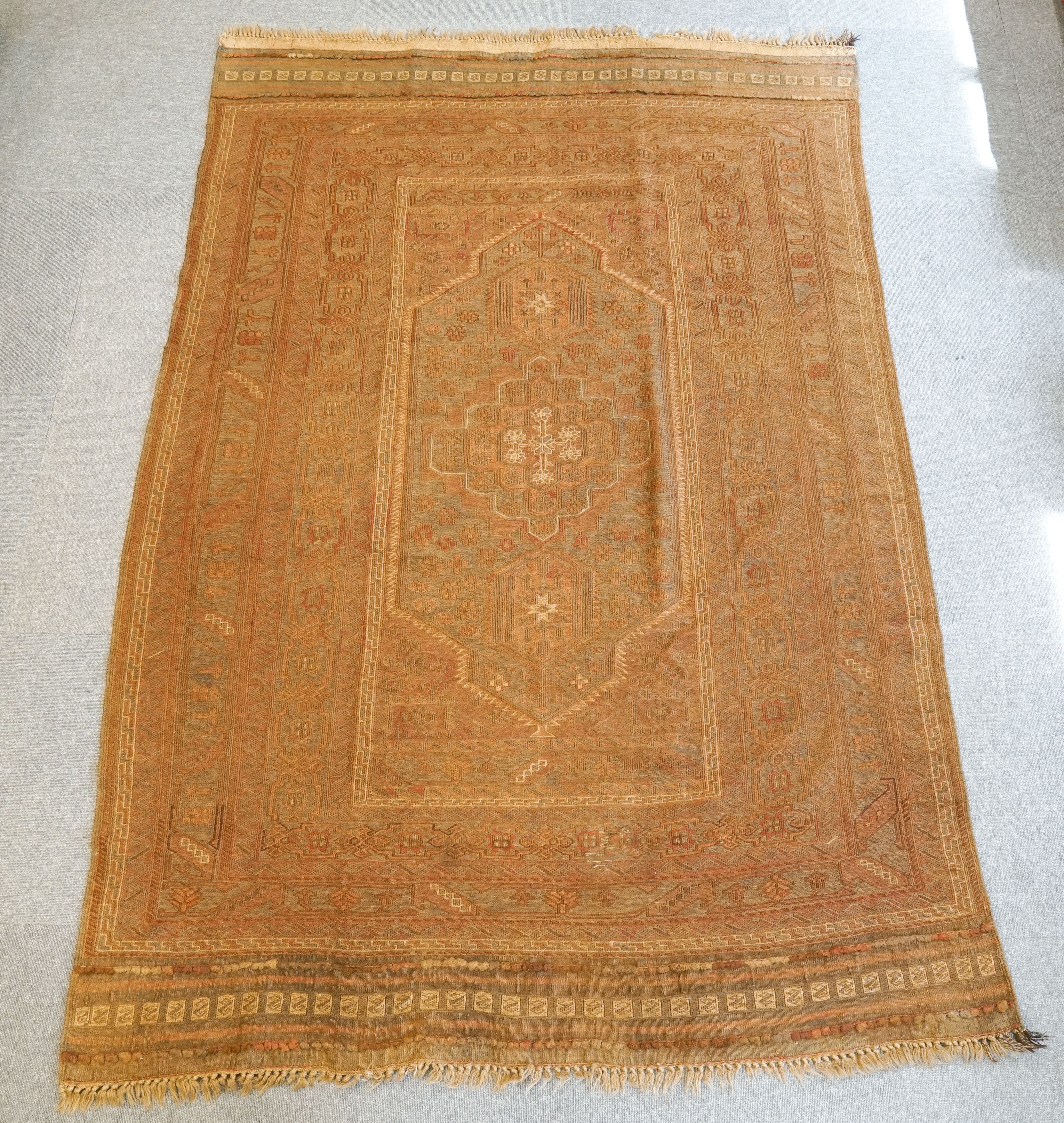 イランで織られたキリムという種類の絨毯。素材はウールですが麻のようにサラッとした肌触りで、薄手なので夏場の敷物にぴったりです。草木染めを施したウールを100%使用しているため、化学染料に比べて安全性が高く、お子様やペットにも安心してお使いいただけます。