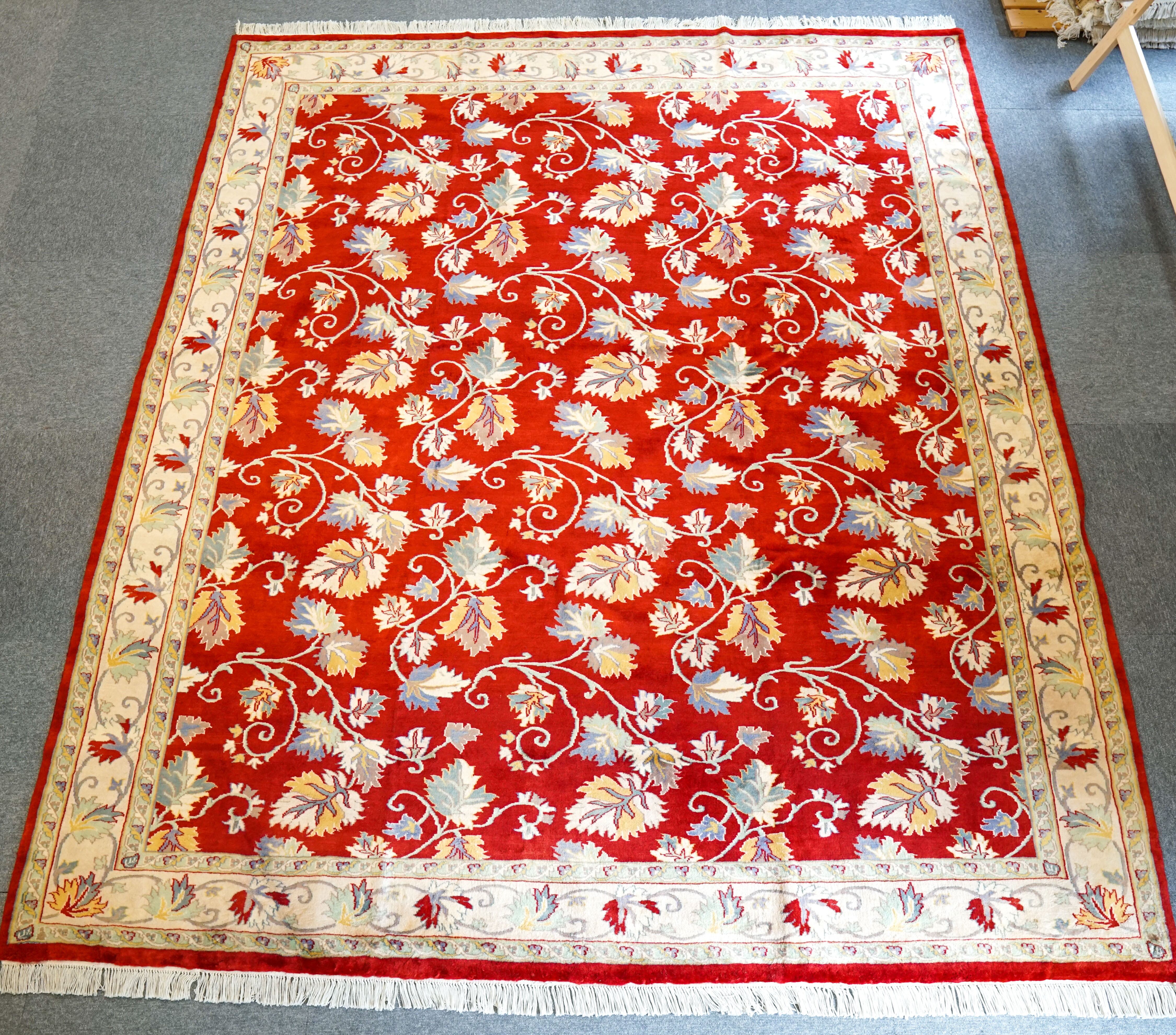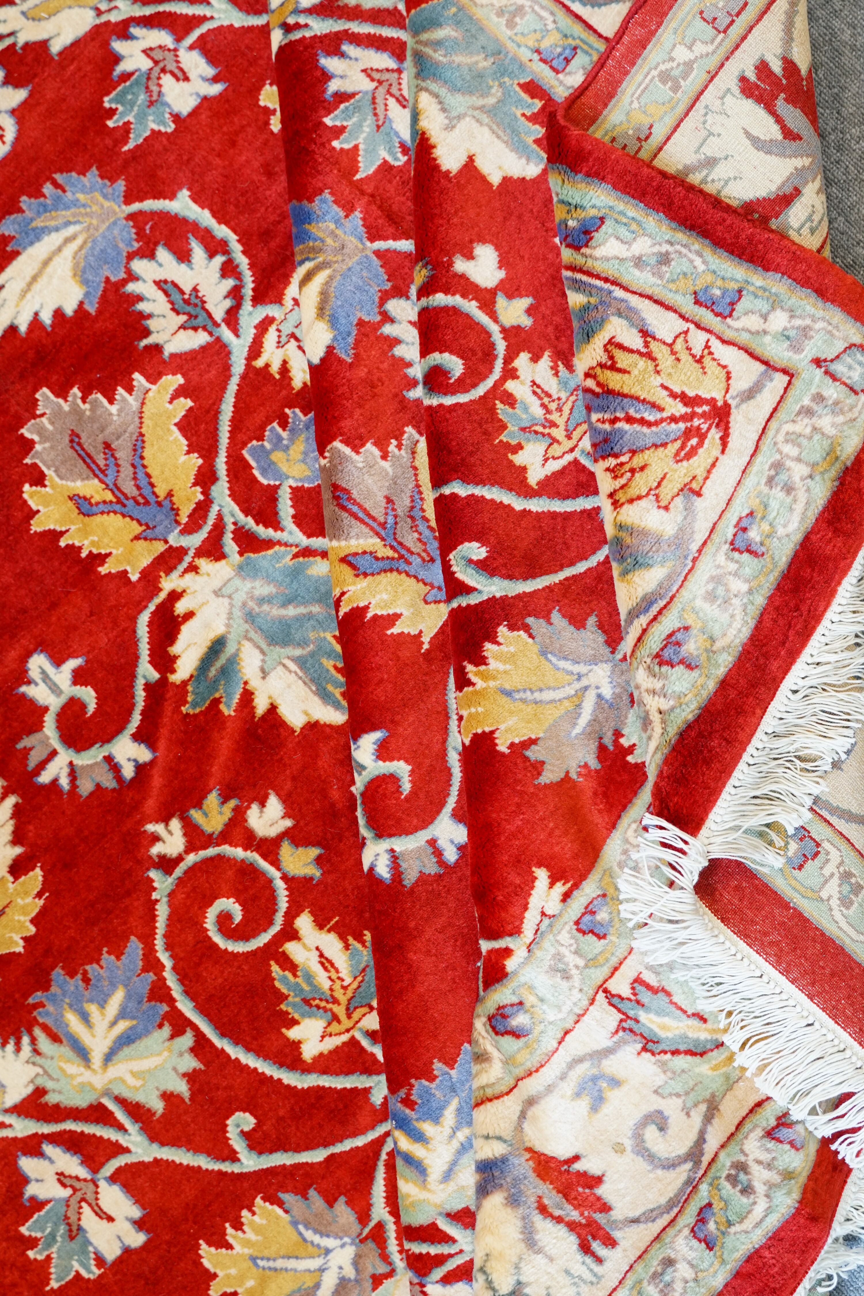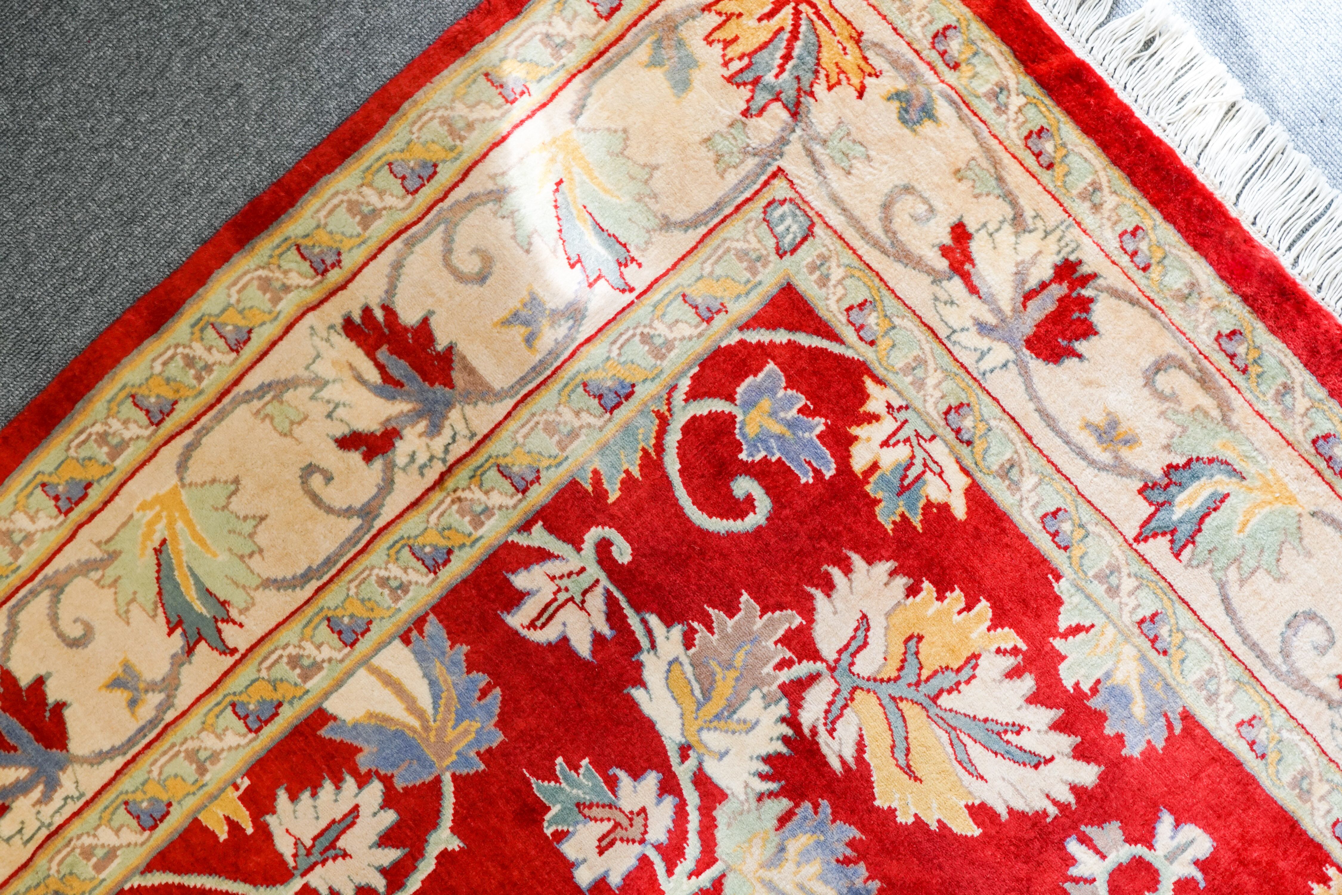 ニュージーランド産の上質なウールを使用し、信頼できる熟練した職人が手織りしたパキスタン絨毯です。ニュージーランド産のウールはタンパク質をたくさん含んでいるためハリ、艶に富むのが特徴です。肌触りはなめらかで柔らかく、弾力のあるパイル地が底冷えを防ぎ足元を快適にします。