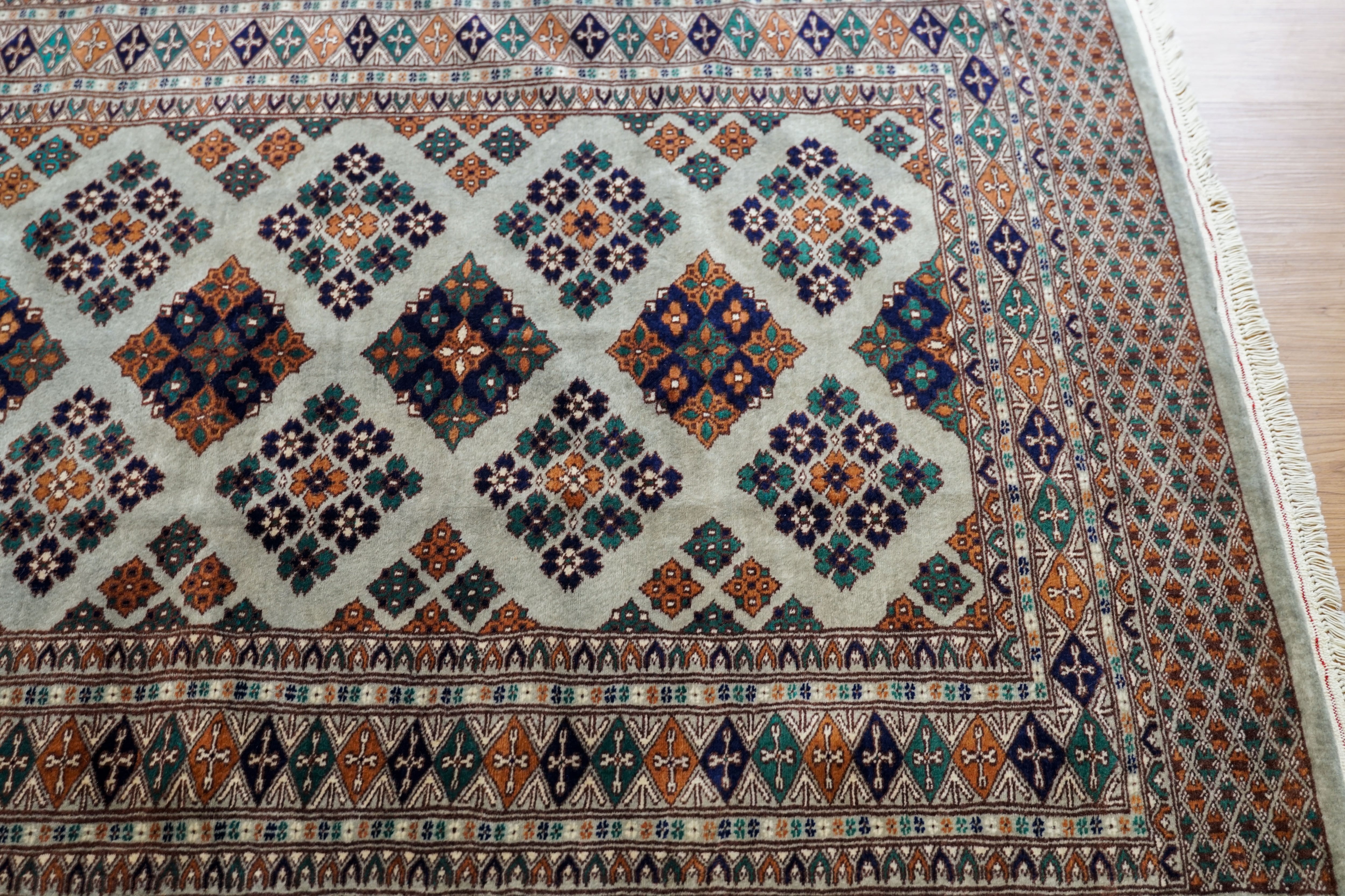 ニュージーランド産の上質なウールを使用し、信頼できる熟練した職人が手織りしたパキスタン絨毯です。ニュージーランド産のウールはタンパク質をたくさん含んでいるためハリ、艶に富むのが特徴です。肌触りはなめらかで柔らかく、弾力のあるパイル地が底冷えを防ぎ足元を快適にします。