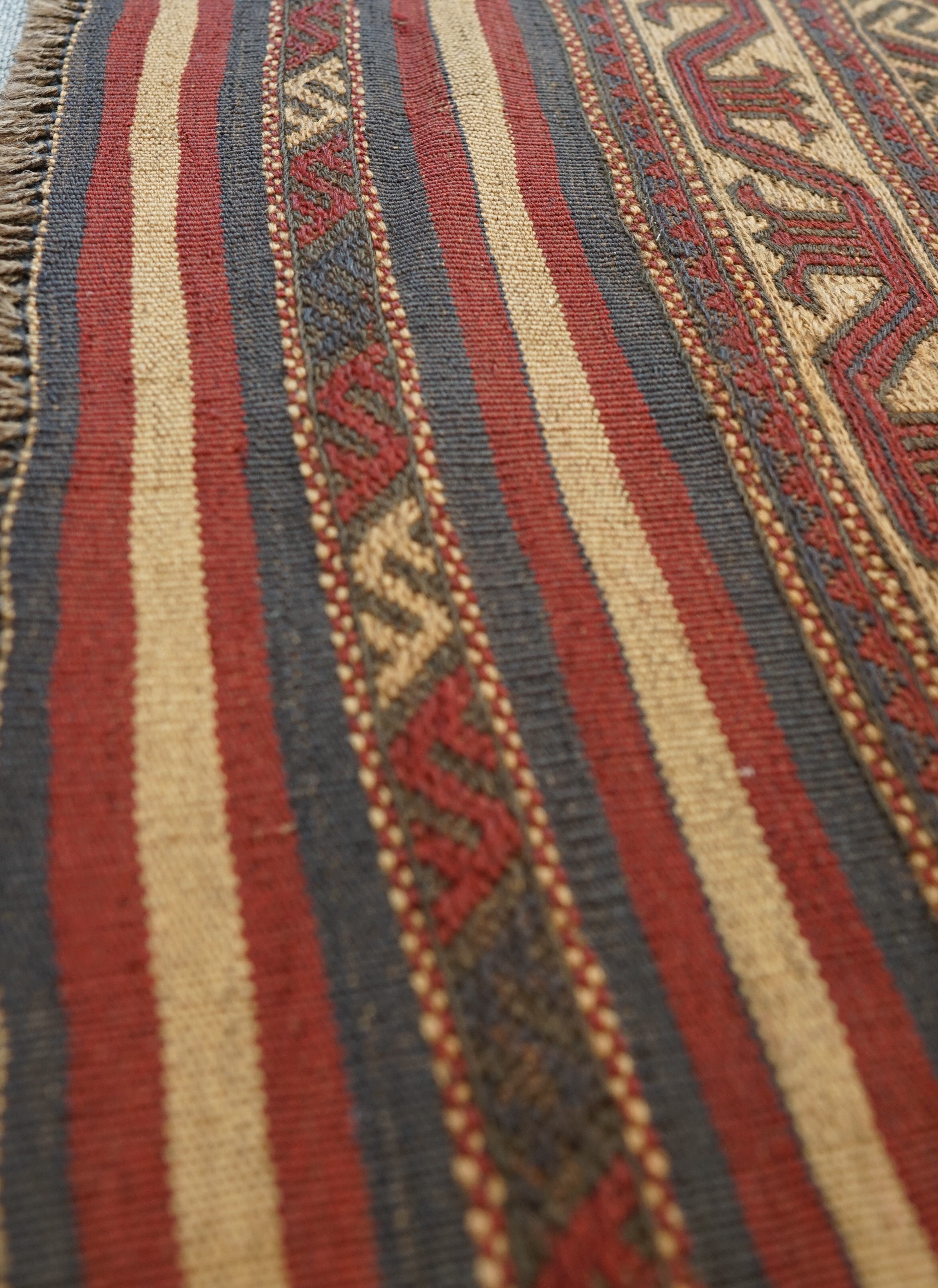 ペルシャの巧みな織り技術が活きたトライバルラグ。キリムという種類の毛足のない平織り絨毯です。素材はウールですが、麻のようにさらっとした肌触り。他国のキリムと比較して柄が細かく、表面もなめらかです。スマック織りという、縦糸と横糸に飾り糸を絡めて織る高度な技法を用いています。一般的な平織りキリムの場合、両面同じ模様ができますが、スマック織りは上記のように、手の込んだ立体的に仕上がる技法のため片面仕様となっています。