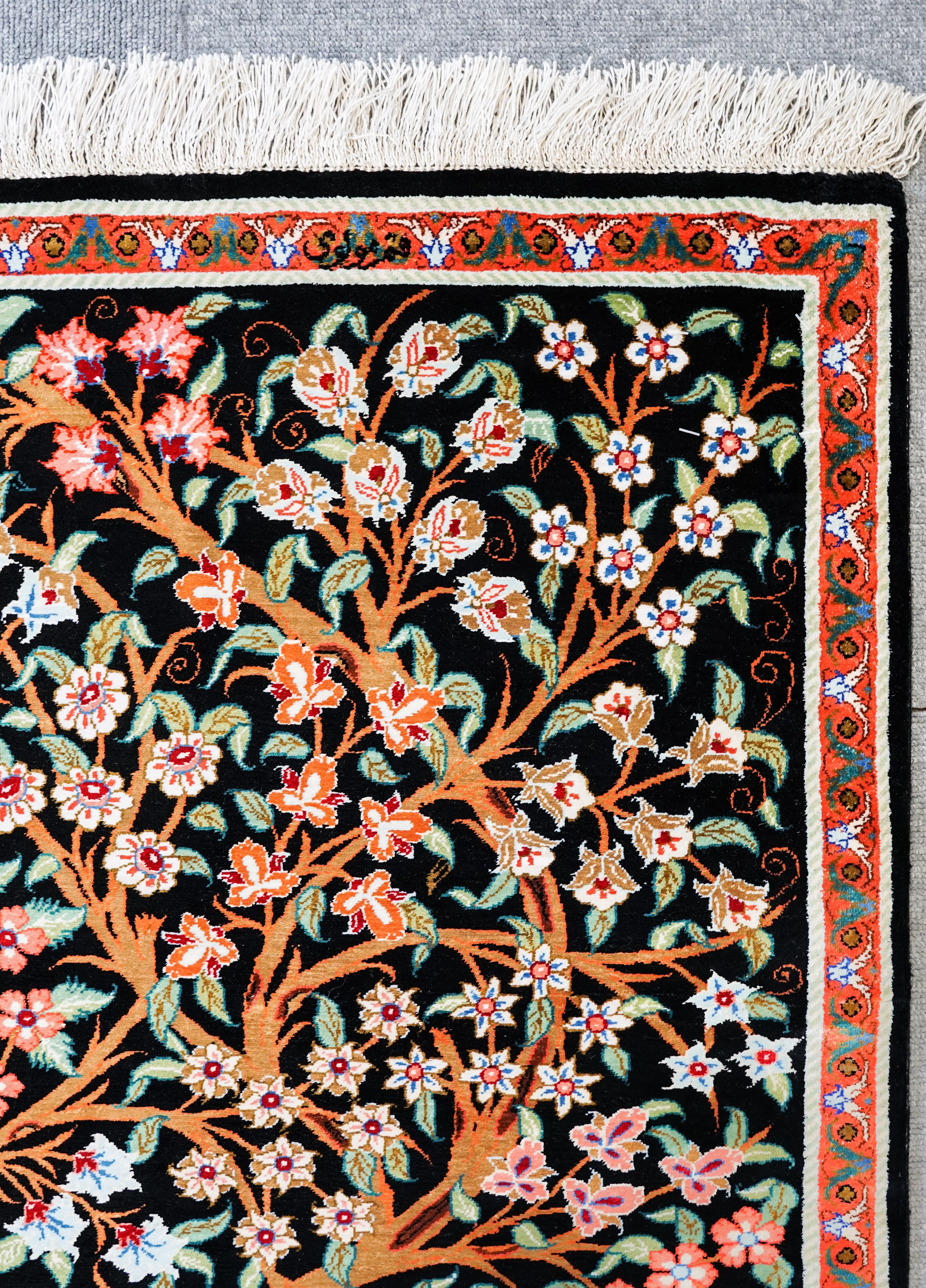 世界的な人気を誇るペルシャ クム産の総シルク手織り絨毯。熟練した職人が一結び一結びまごころ込めて織っています。