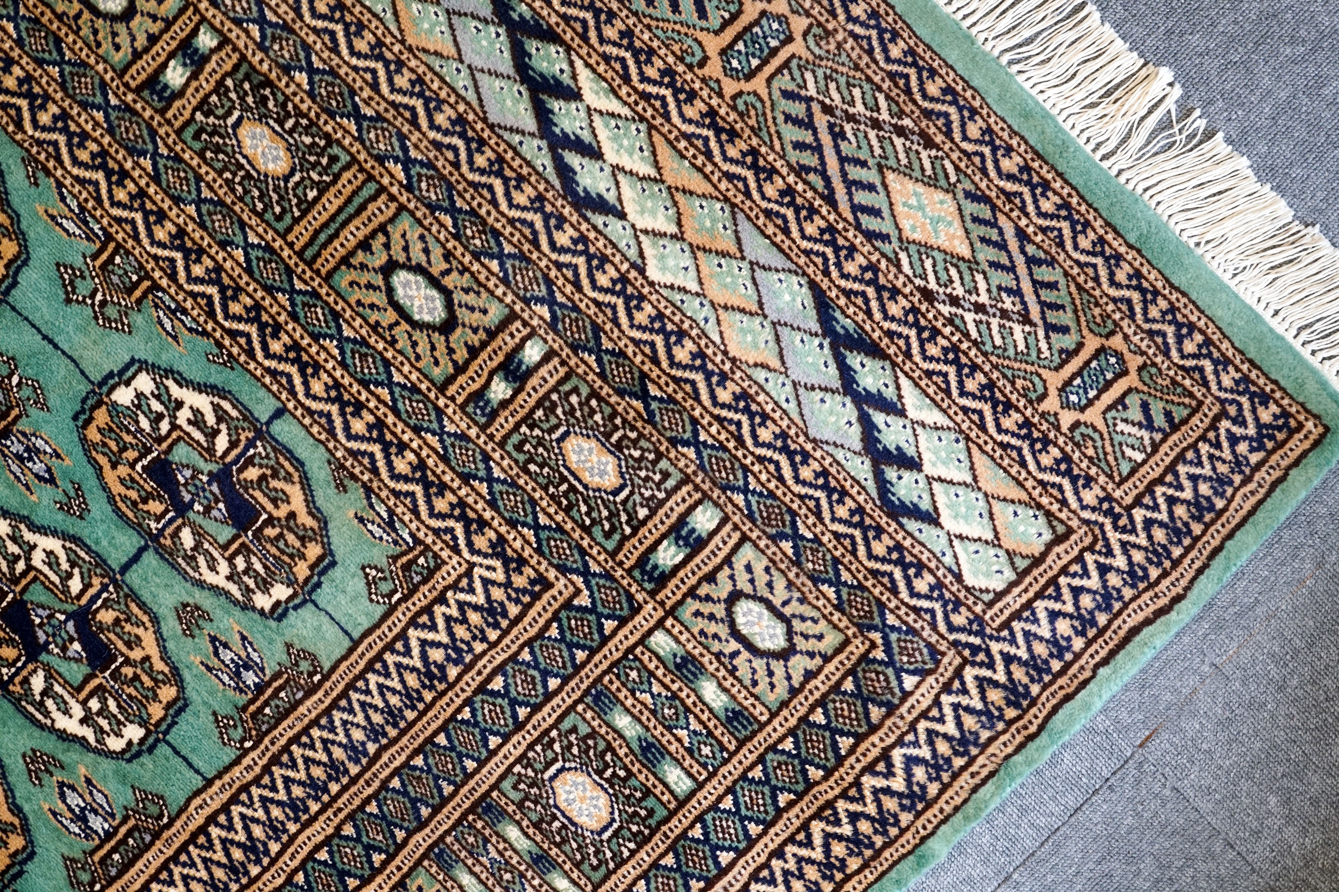 アンニュイなグリーンカラーがお洒落な色合い。光の具合や見る方向によって彩度が変わって見える手織り絨毯の特性も存分に活かされた仕上がり。上品な艶のあるウールがデザインをより美しく際立たせます。