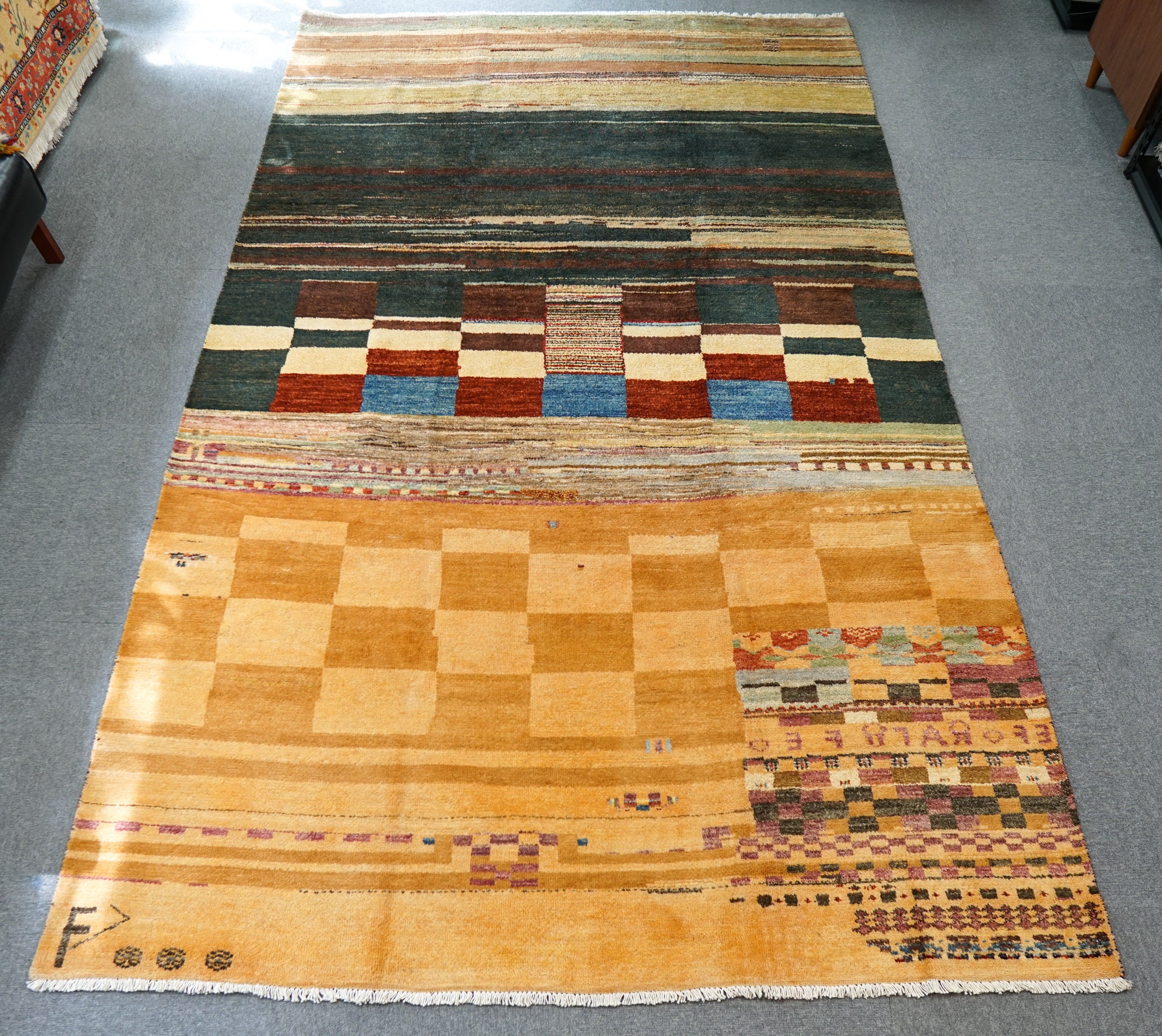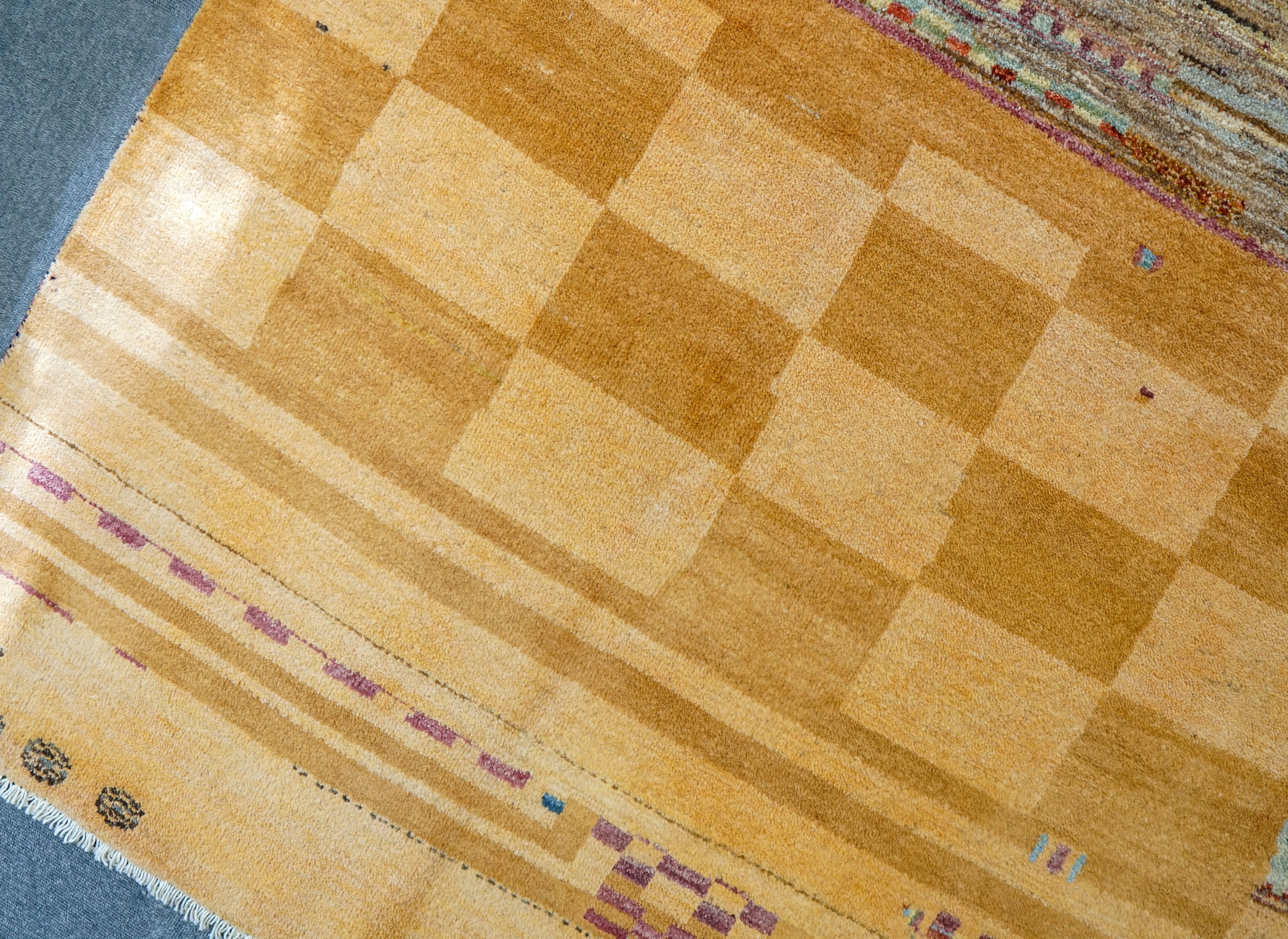 手紡ぎウールは、機械で紡いだウールより色に不均一さが出て、素朴で可愛らしく、よりナチュラルな印象の絨毯に仕上がります。ペルシャ産のギャッベと比較して厚さは若干薄めです。