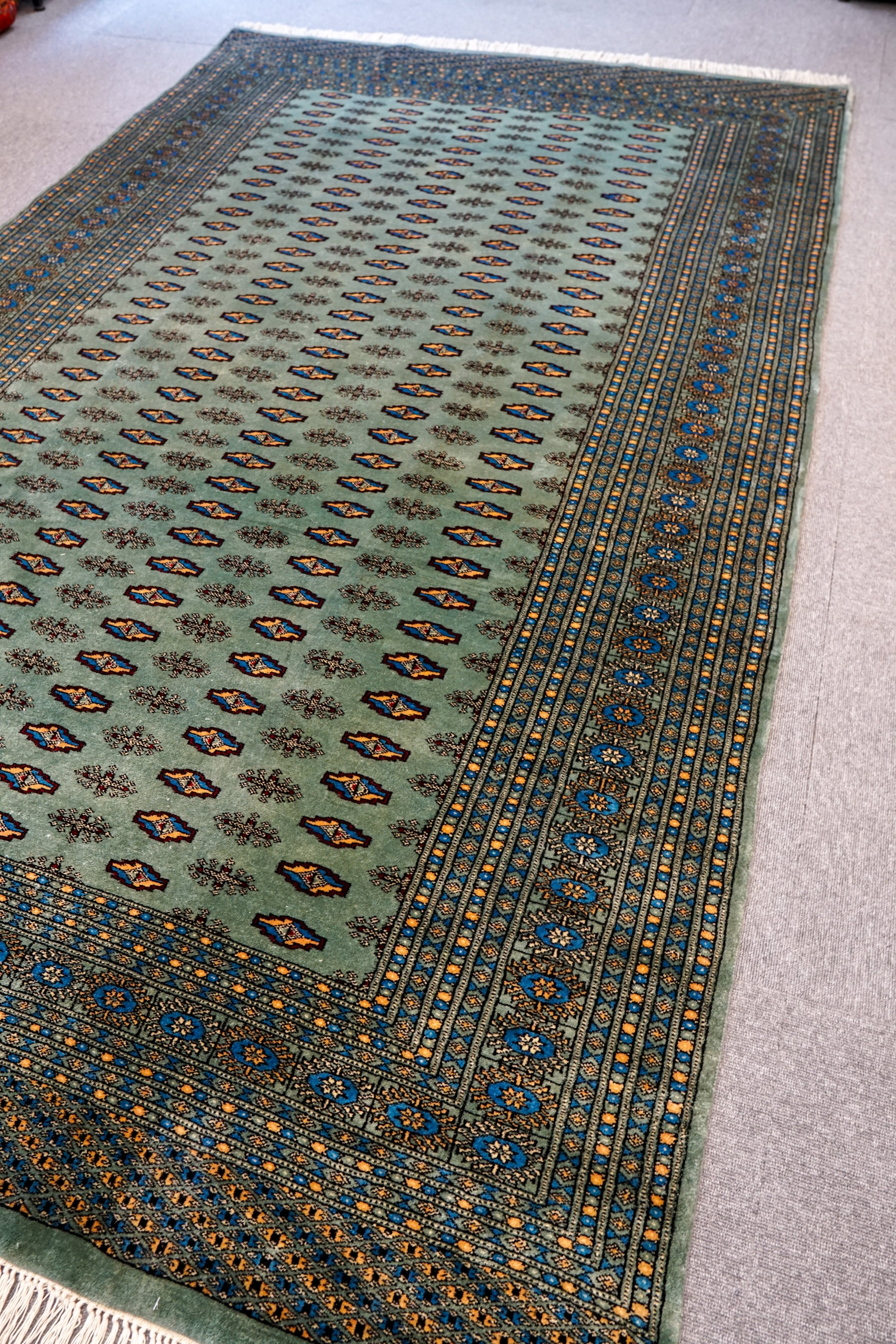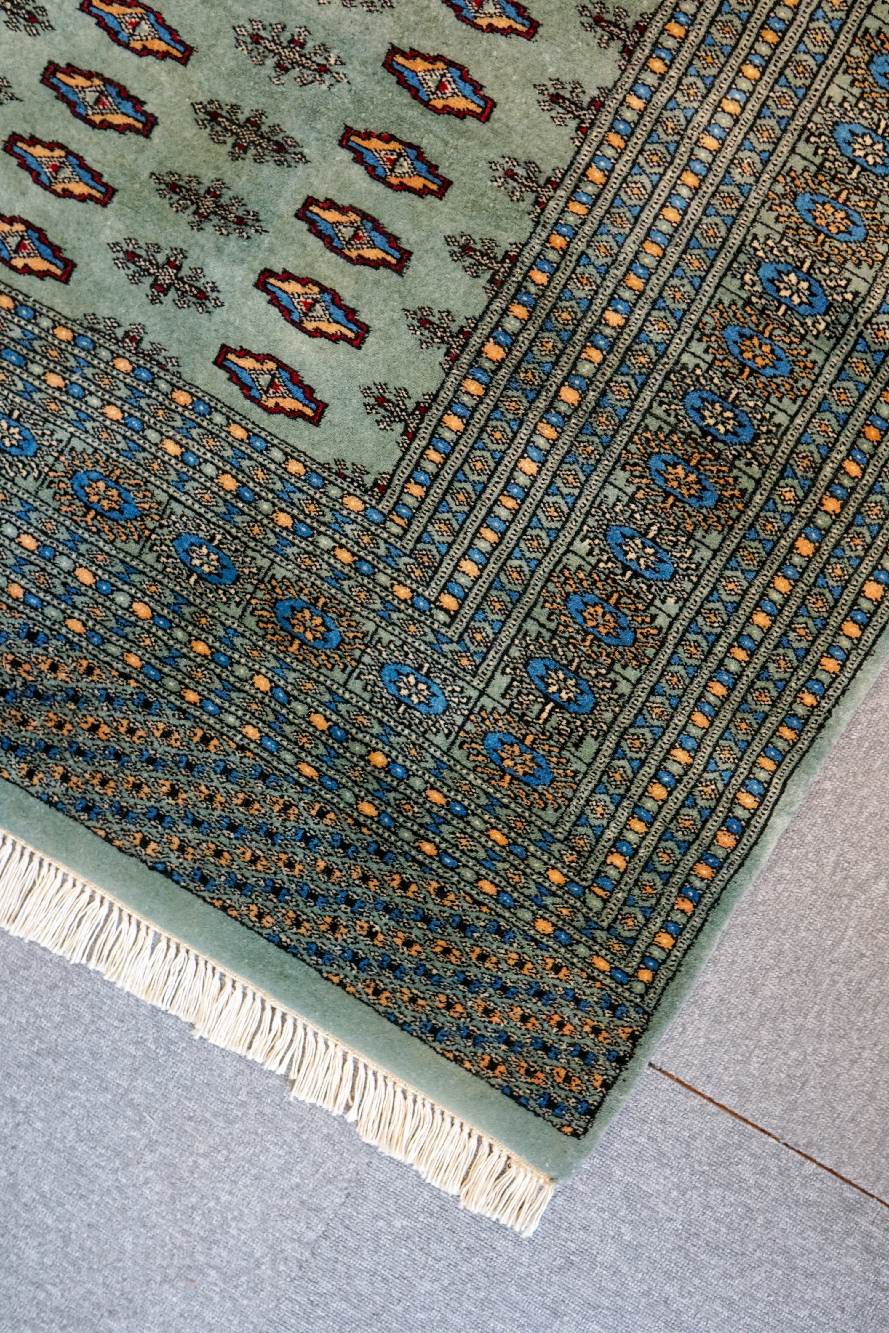 渋みのあるグリーンに伝統的なギュルを組み合わせたデザイン。光の具合や見る方向によって彩度が変わって見える手織り絨毯の特性も存分に活かされた仕上がり。上品な艶のあるウールがデザインをより美しく際立たせます。