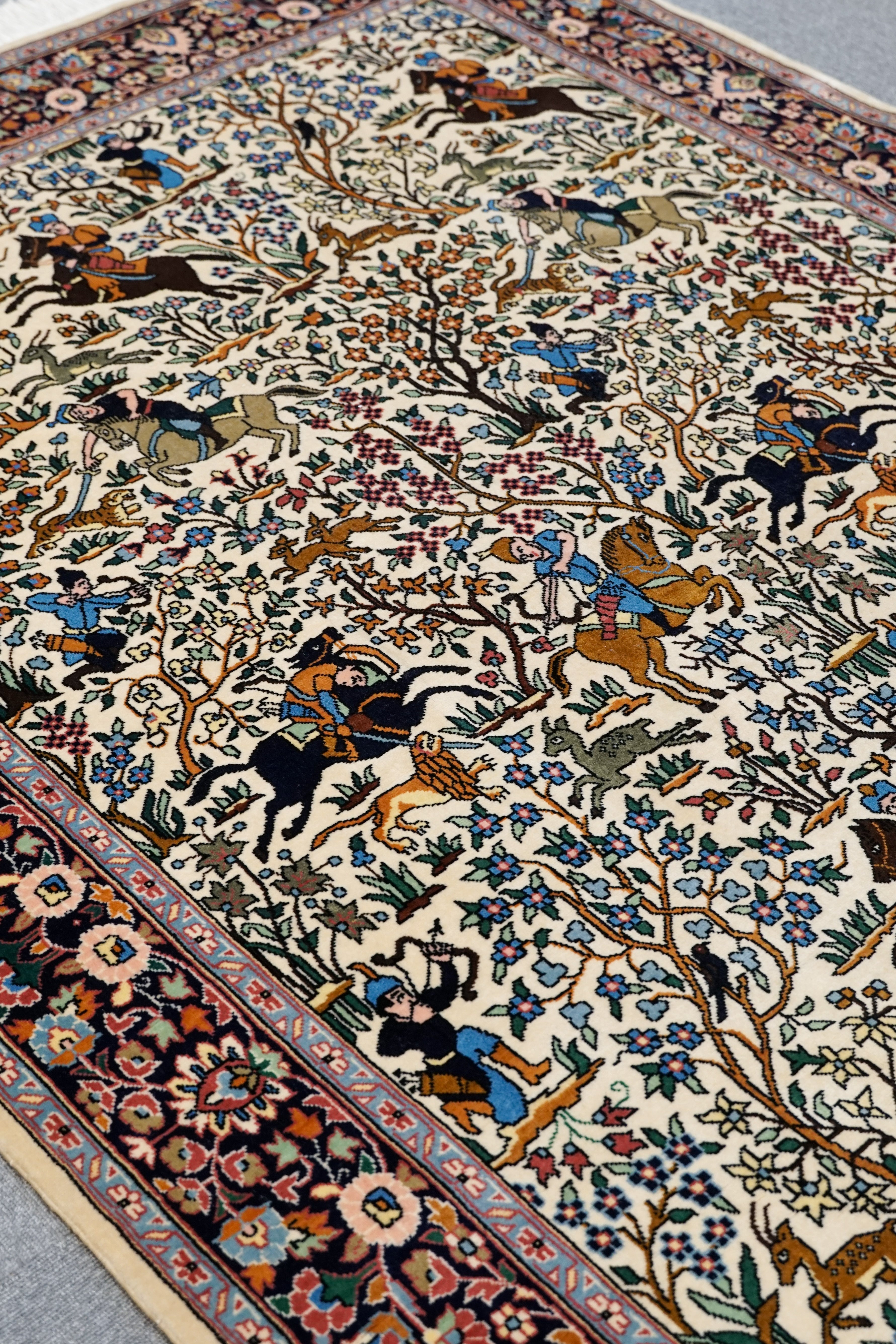 『ダブルノット』といって、通常の2倍のウールを使用し、2倍の手間をかけて織られています。結び目が通常のものより多いため裏面が硬めにできており滑りにくいです。また、ペルシャ絨毯のような繊細なデザインを再現できるという特徴があります。丈夫さも2倍で、破れにくく、長年愛せる高品質です。