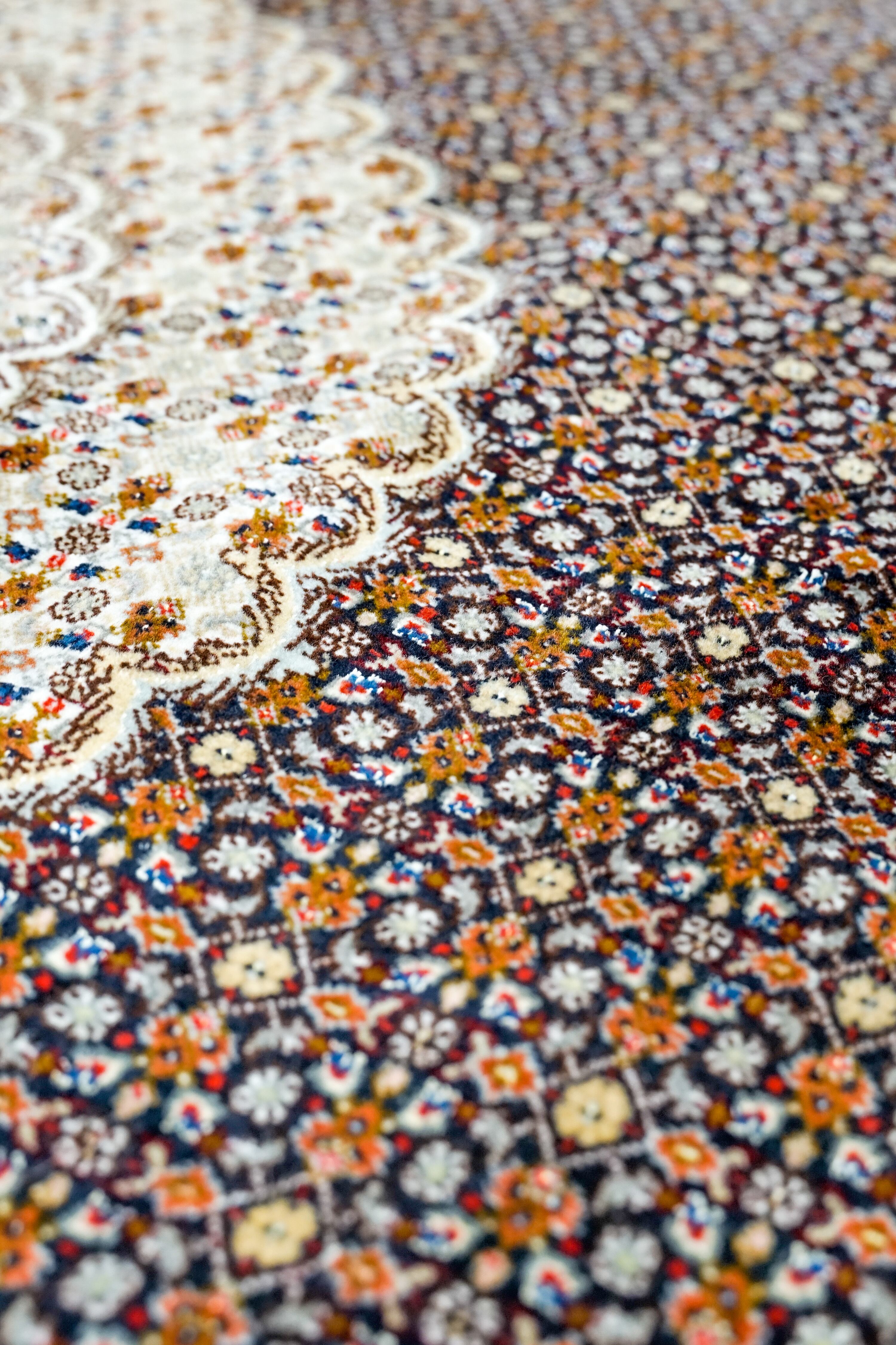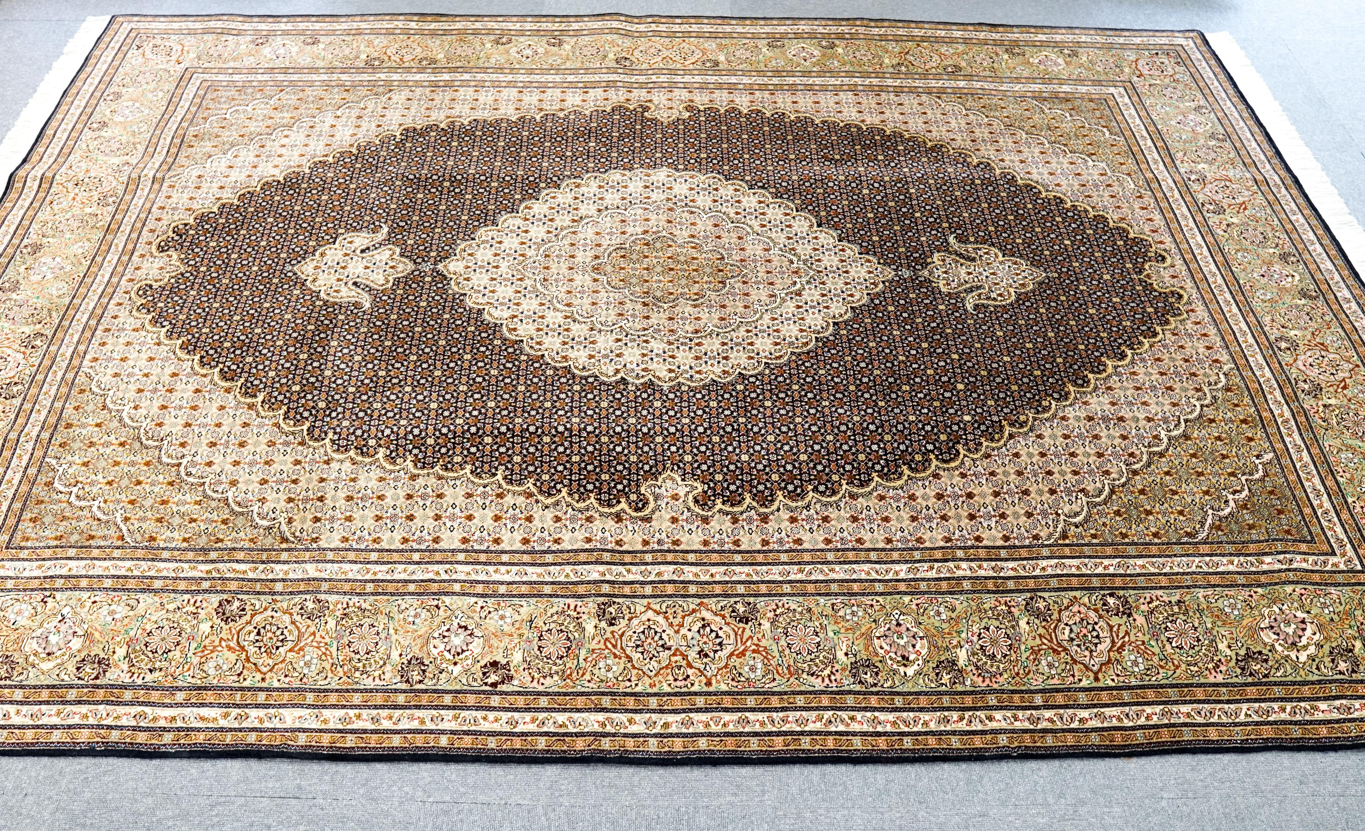 ペルシャ タブリーズ産の手織り絨毯。50ラージ(1平方メートルに49~50万以上のノットがある)の最高品質。高い織り密度により細かな柄まで繊細に表現することができ、格段に美しくなります。また、しなやかさが増すので、女性や年配の方でもより扱いやすくなります。