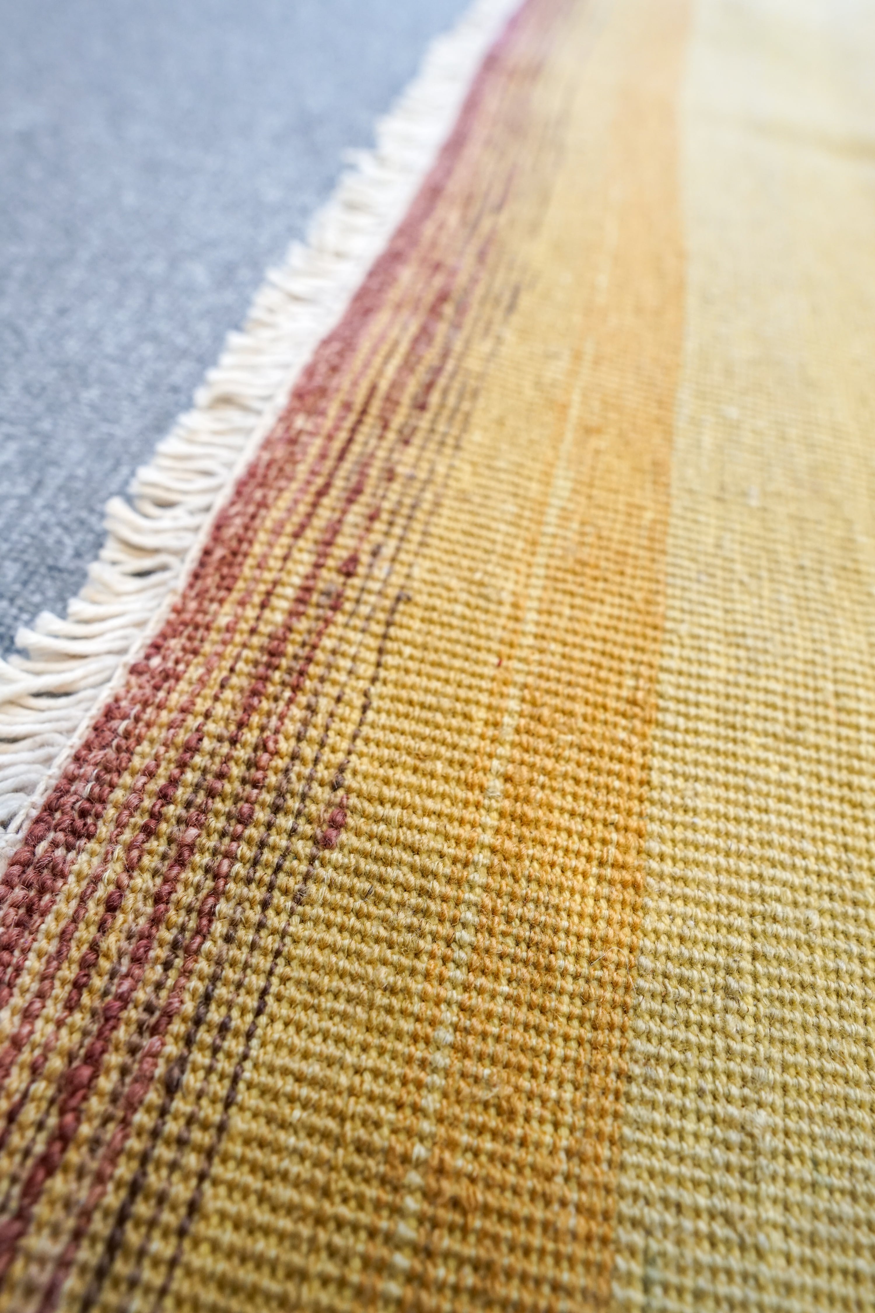 手紡ぎウールは、機械で紡いだウールより色味に不均一さが出てより自然の色が活かされた味のある絨毯に仕上がります。ペルシャ産のギャッベと比較して厚さは若干薄めです。