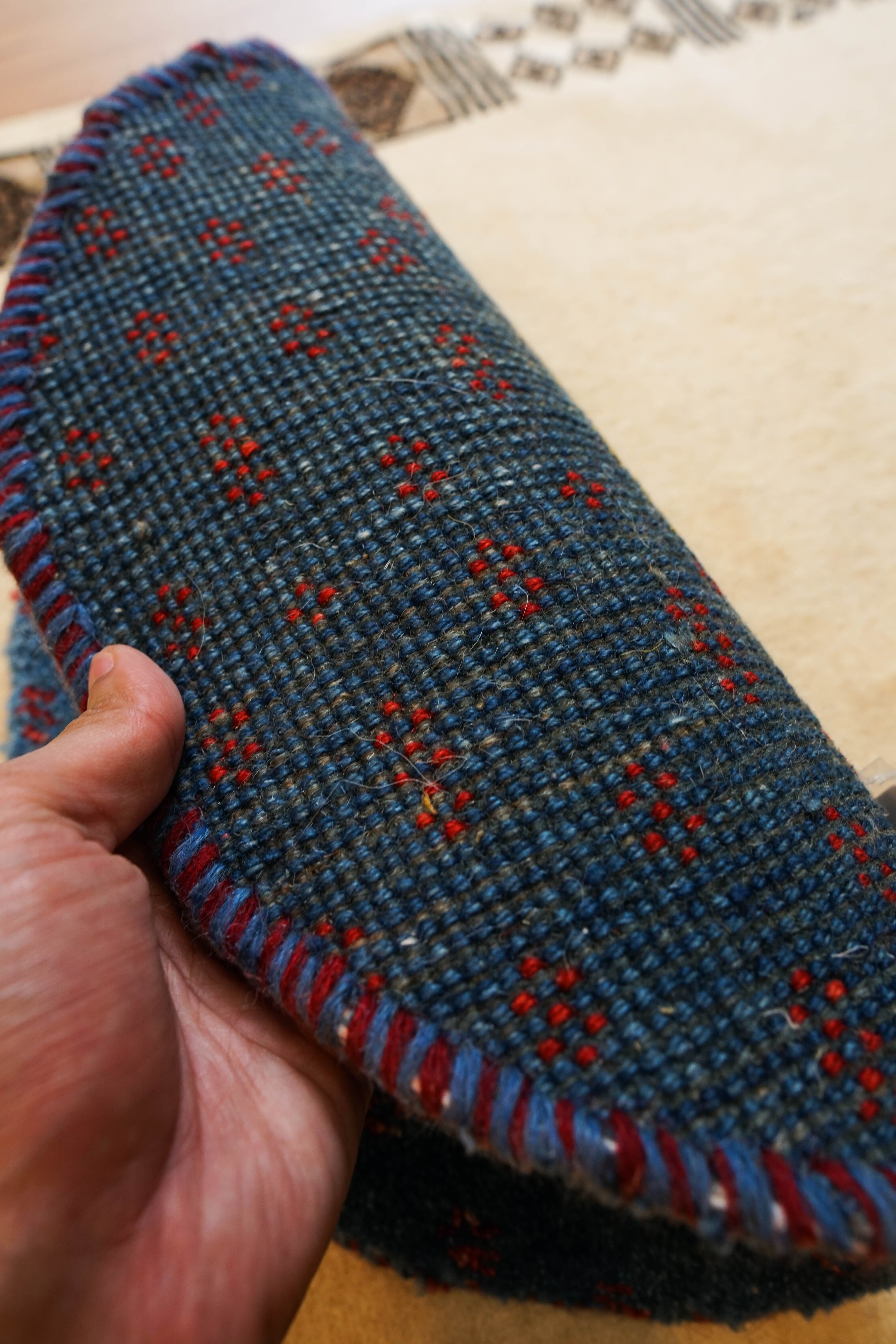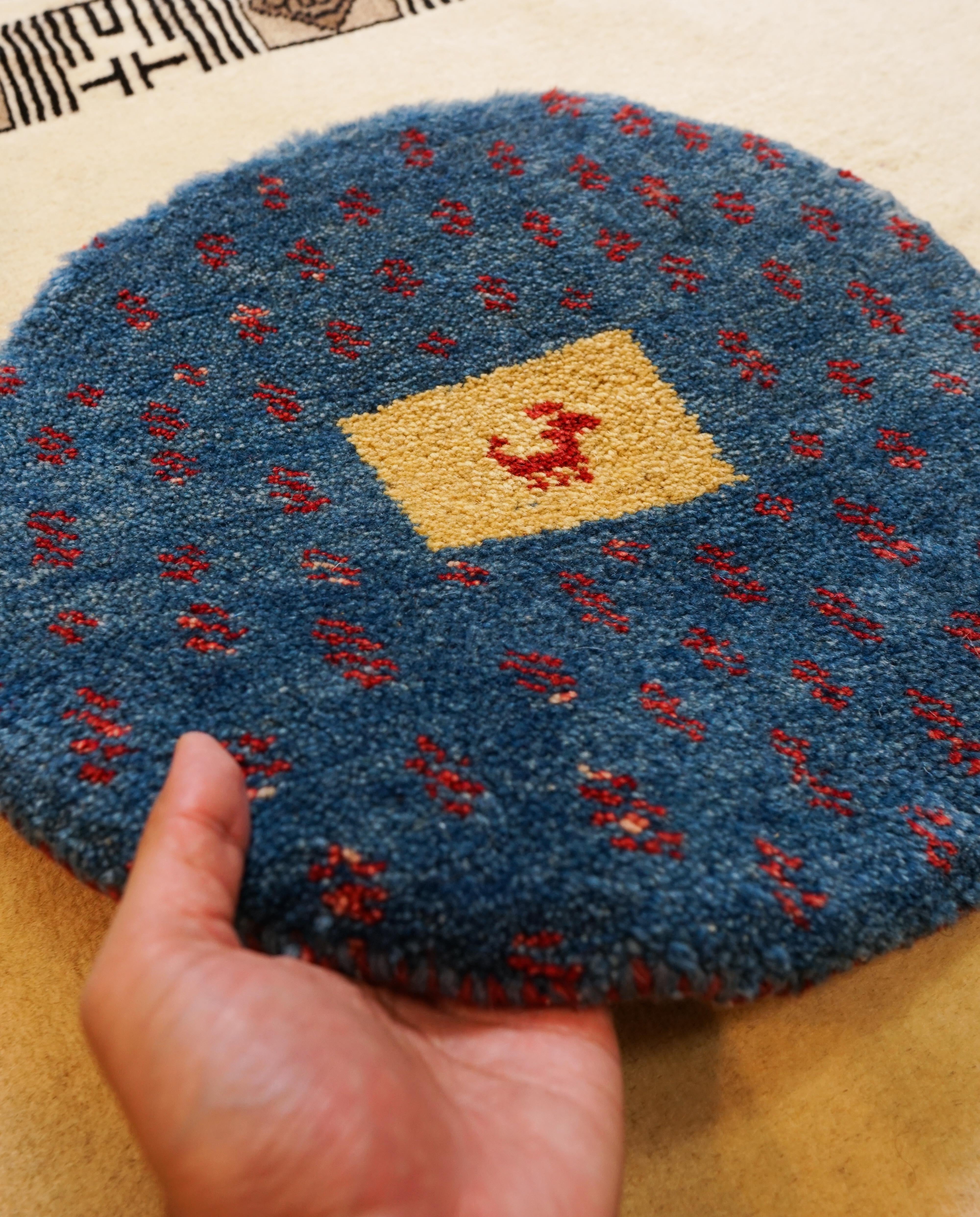 イランの遊牧民カシュガイ族が手織りする、草木染の手紡ぎウールを使ったギャッベという絨毯。太めのウールでざっくりと織られていて厚みがあり、素朴で可愛らしい柄・色遣いが特徴です。