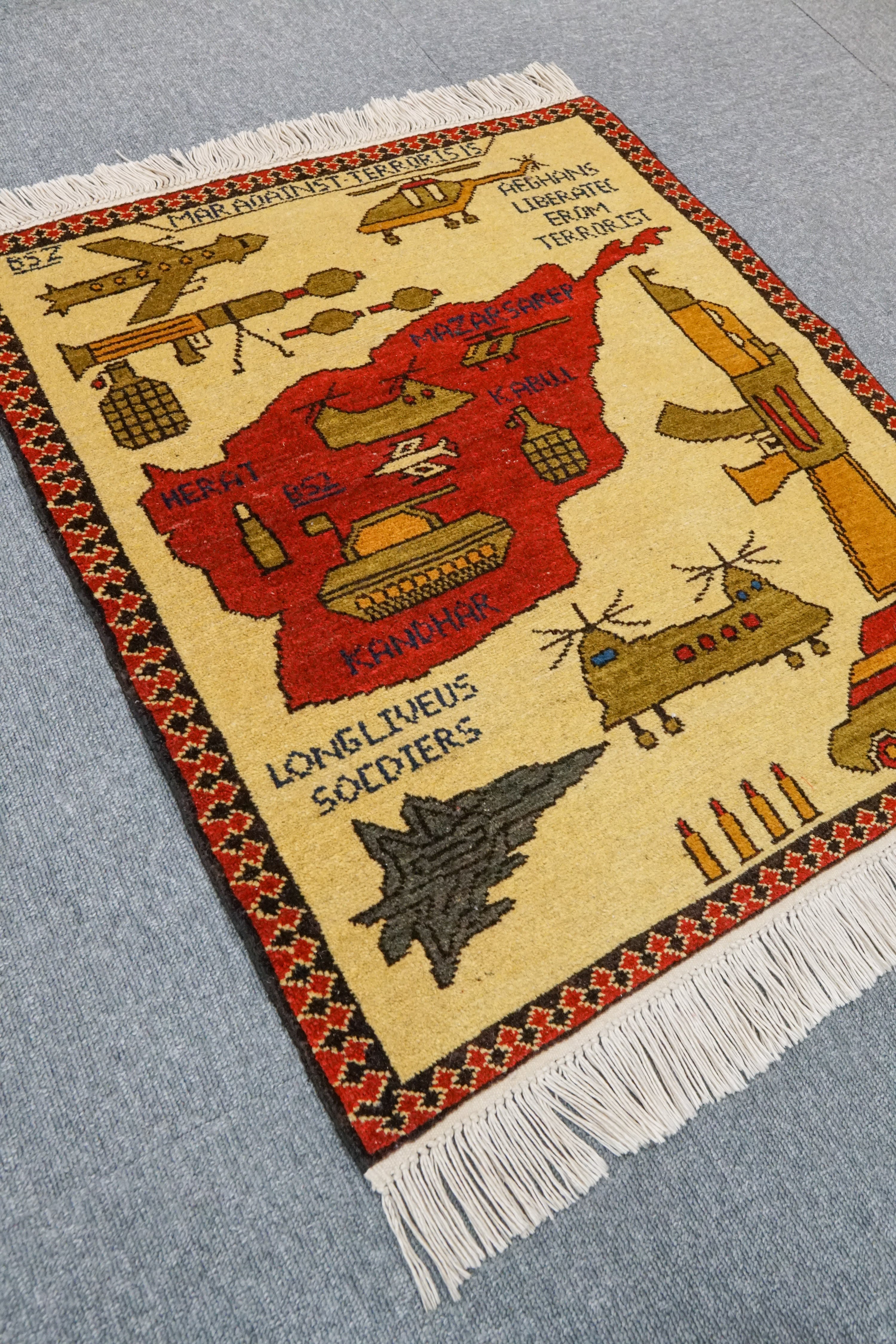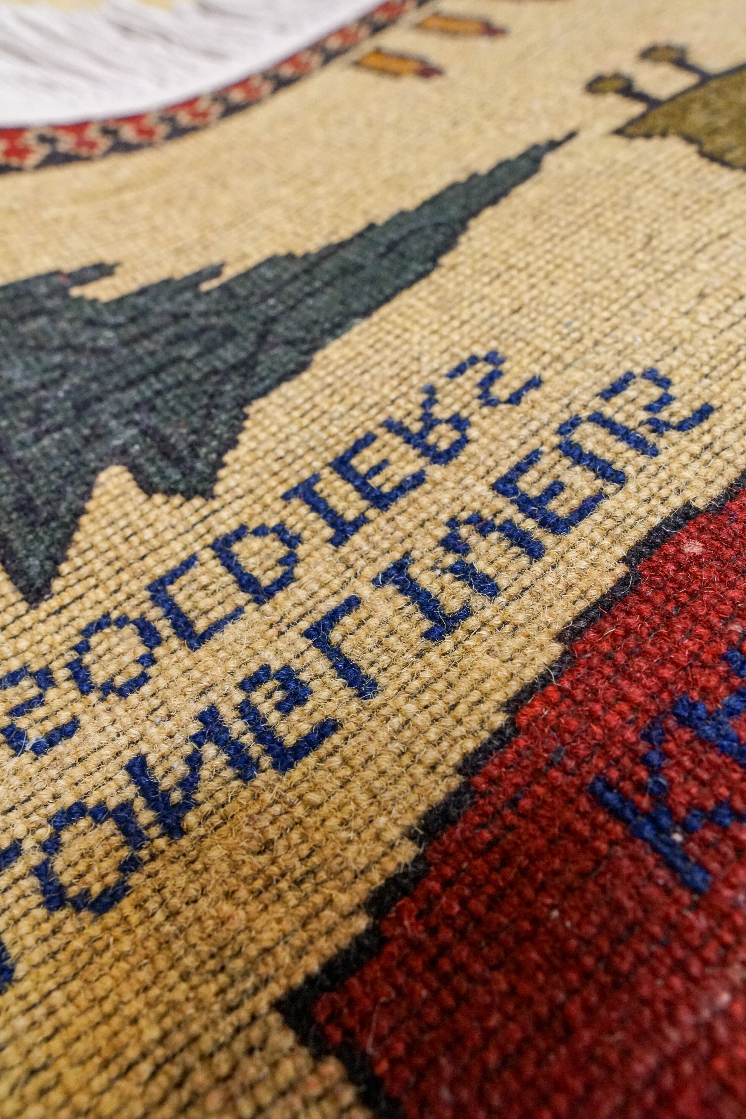 ポップに描かれた武器や戦車。日本では見慣れないものですが、現地では毎日のようにこれらに怯えながら生活しています。安全で豊かな暮らしは当然難しく、現地の織り手(特に女性)は外での仕事も制限が多いため、子どもたちに少しでも多くの食事を与えるべく、家で絨毯を織っています。