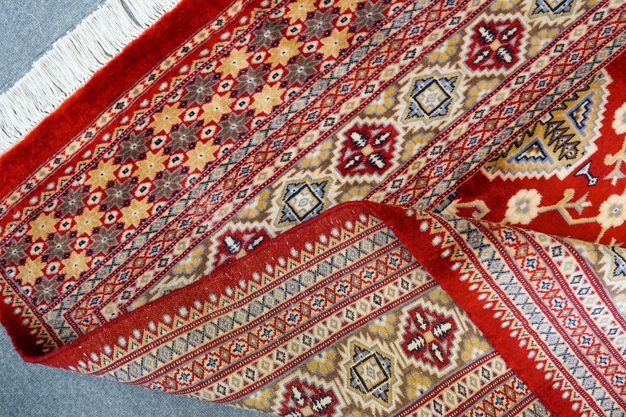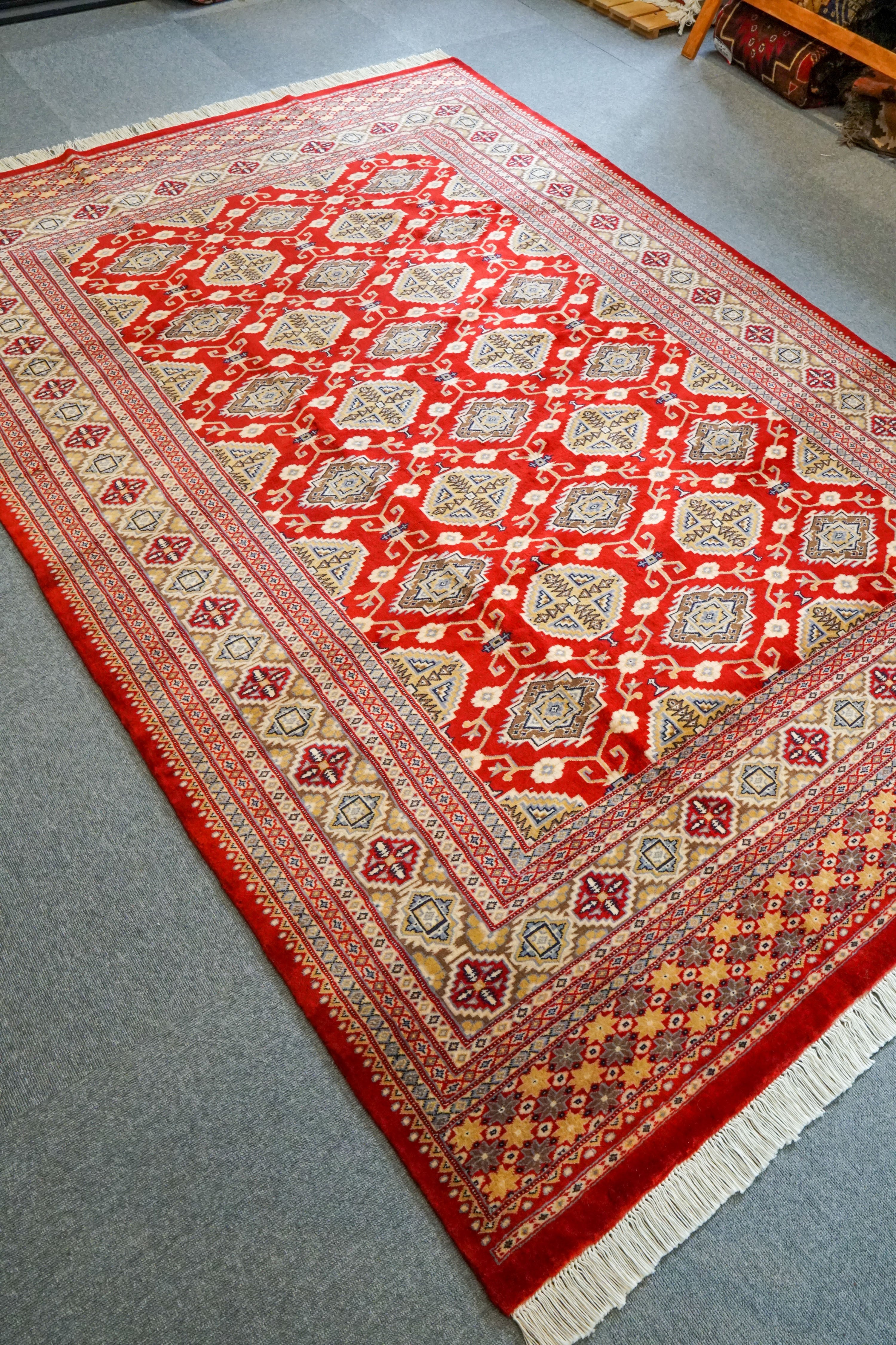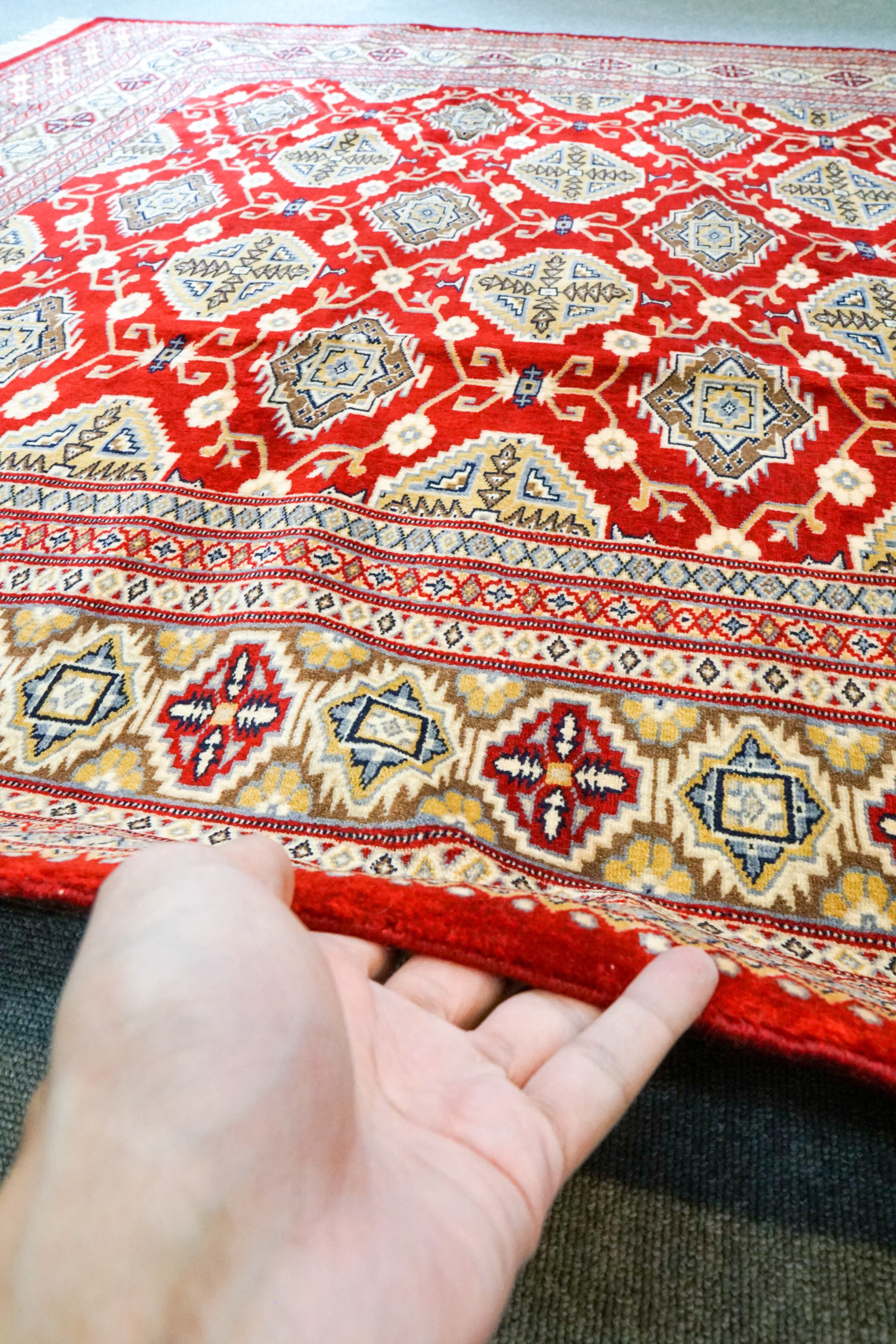 ニュージーランド産の上質なウールに草木染めを施し、パキスタンの職人が何ヶ月もの歳月をかけて手織りした絨毯です。1㎠に約64ノットの高品質。高い織り密度により、しなやかで扱いやすく、細かな柄まで明瞭に織り上げています。