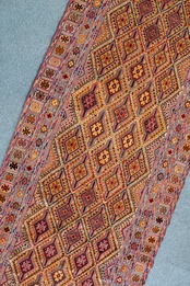 毛足のない麻のような肌触りのキリムと、パイル地の絨毯部分を合わせもった凸凹のある絨毯で、幾何学的なデザインが美しく、踏み心地も大変良いです。