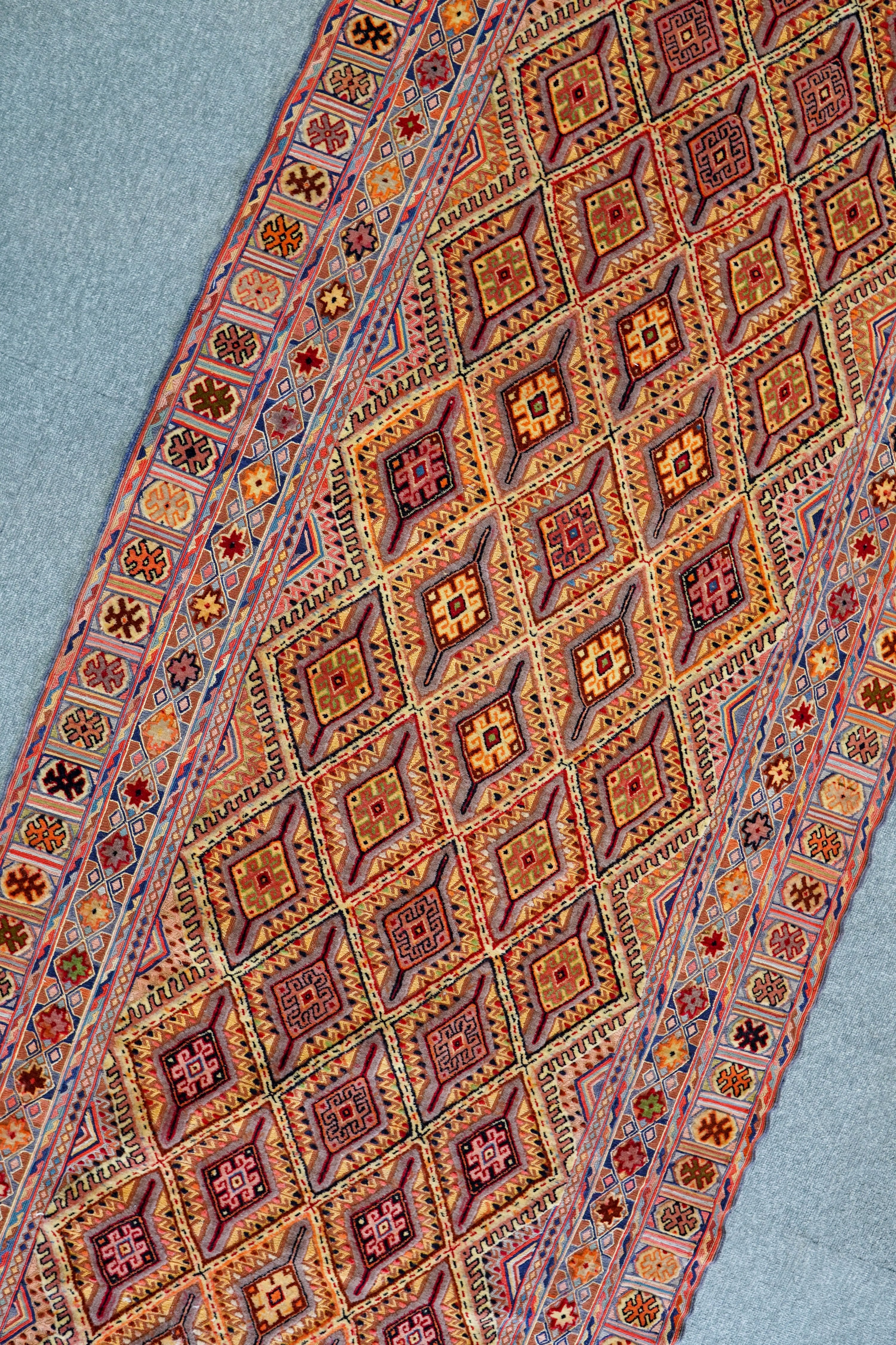 アフガニスタン ヘラート産のマシュワニキリムです。マシュワニ族という部族が手織りしています。彼らの得意とするスマック織りという技法は、複雑な織り技術を要するため難易度が高く、希少で日本ではあまり出回っていません。