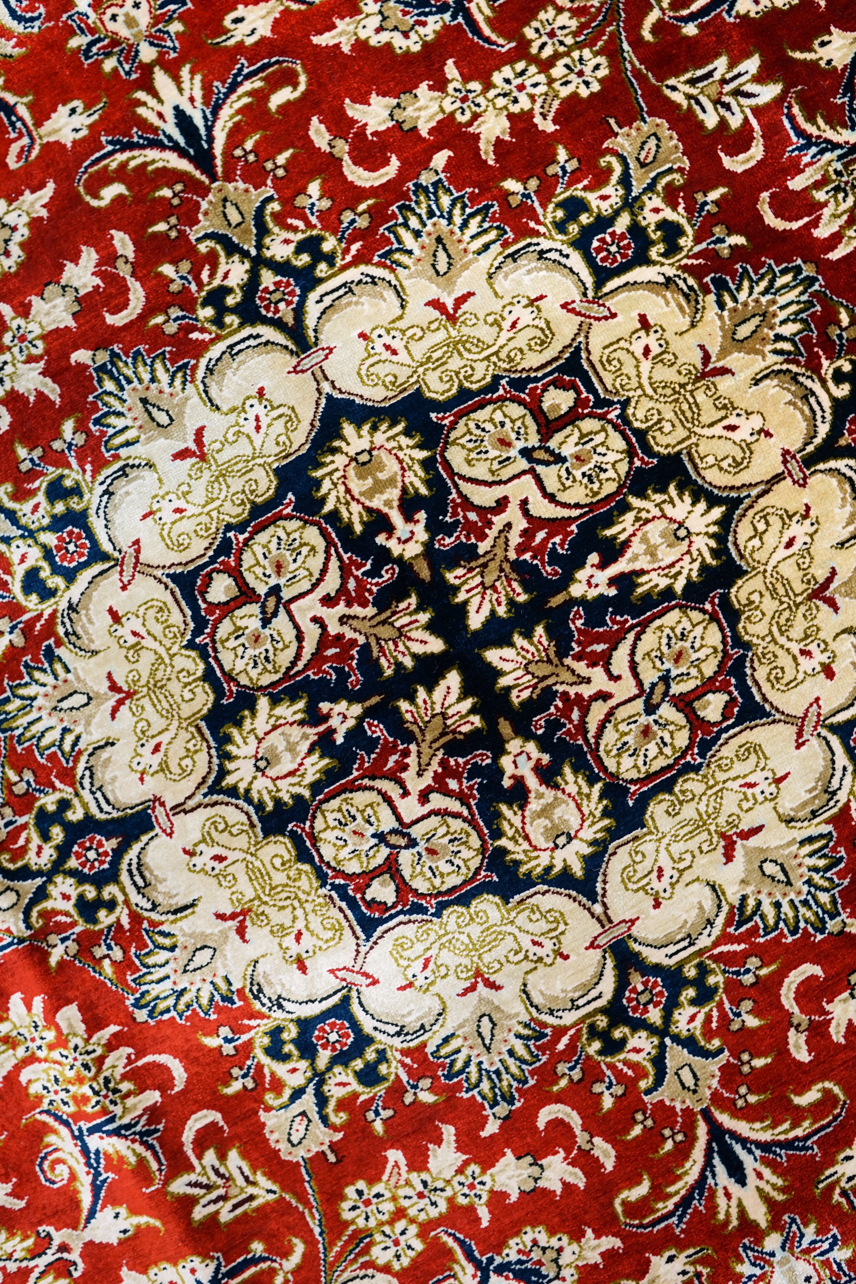 中央には伝統的なメダリオンを施し、鮮やかな赤色とネイビーが高貴な雰囲気を高めます。