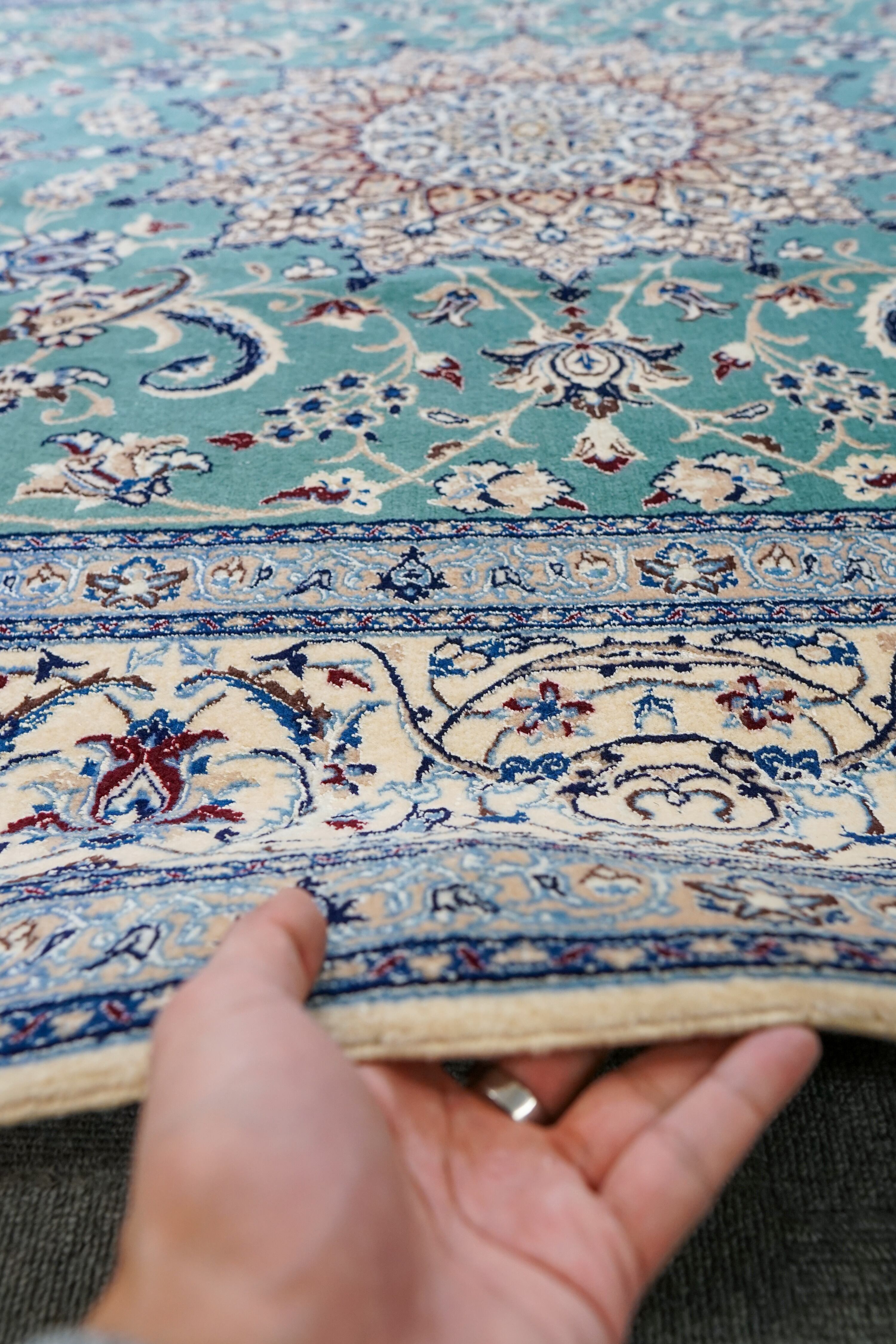 ペルシャ ナイン産の手織り絨毯。コールクウールという生まれて1年以内の子羊から刈り取った貴重なウールとシルクで織り上げた大変柔らかい絨毯です。6LA の高品質。しなやかで、大きいサイズですが比較的女性や年配の方でも扱いやすいです。