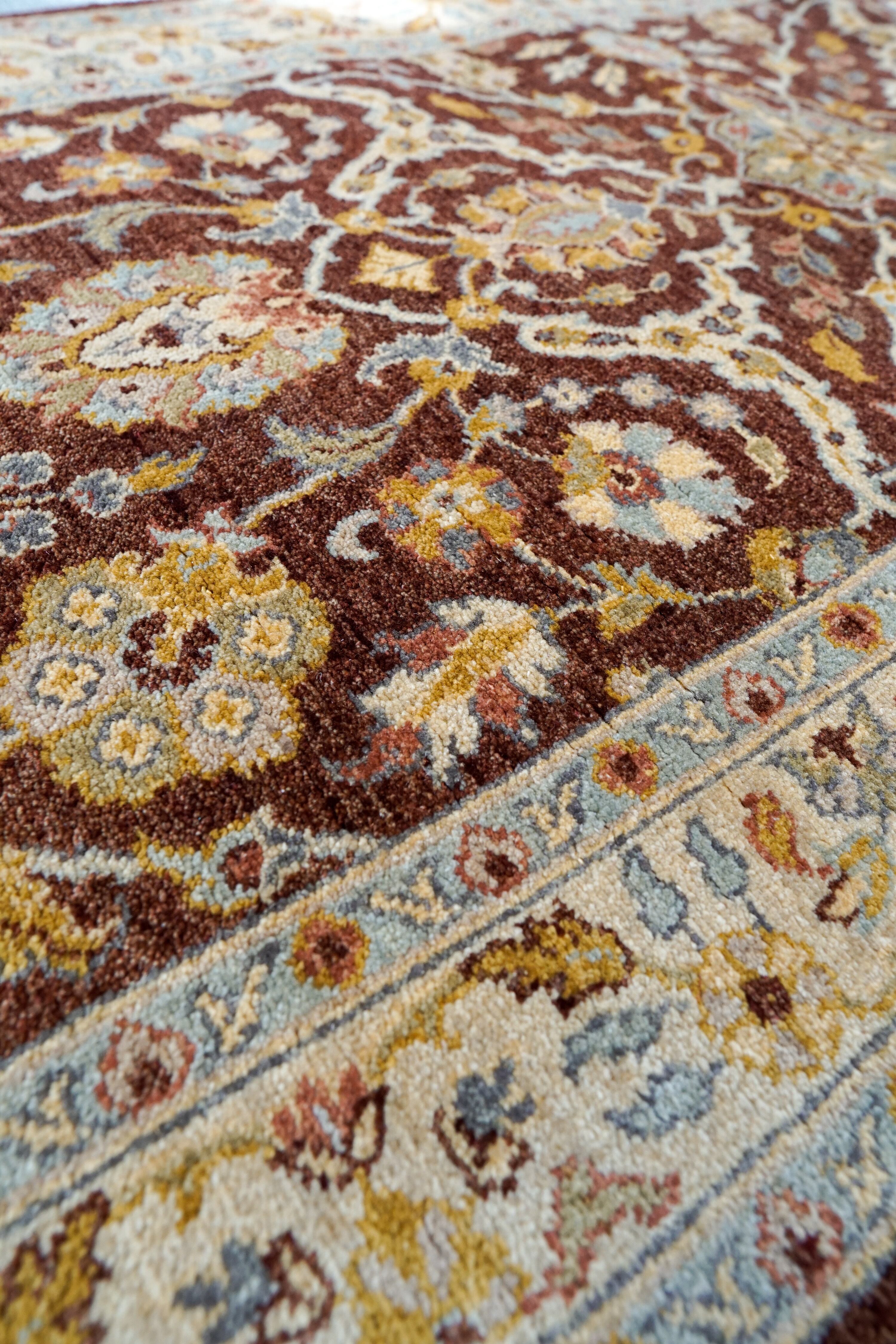 『ダブルノット』といって、通常の絨毯の2倍のウールを使用し、2倍の手間をかけて織られています。結び目が通常のものより多いため裏面が硬めにできており、滑りにくく、通常よりたっぷりウールを用いることでより細かな柄を織ることができるのが特徴です。