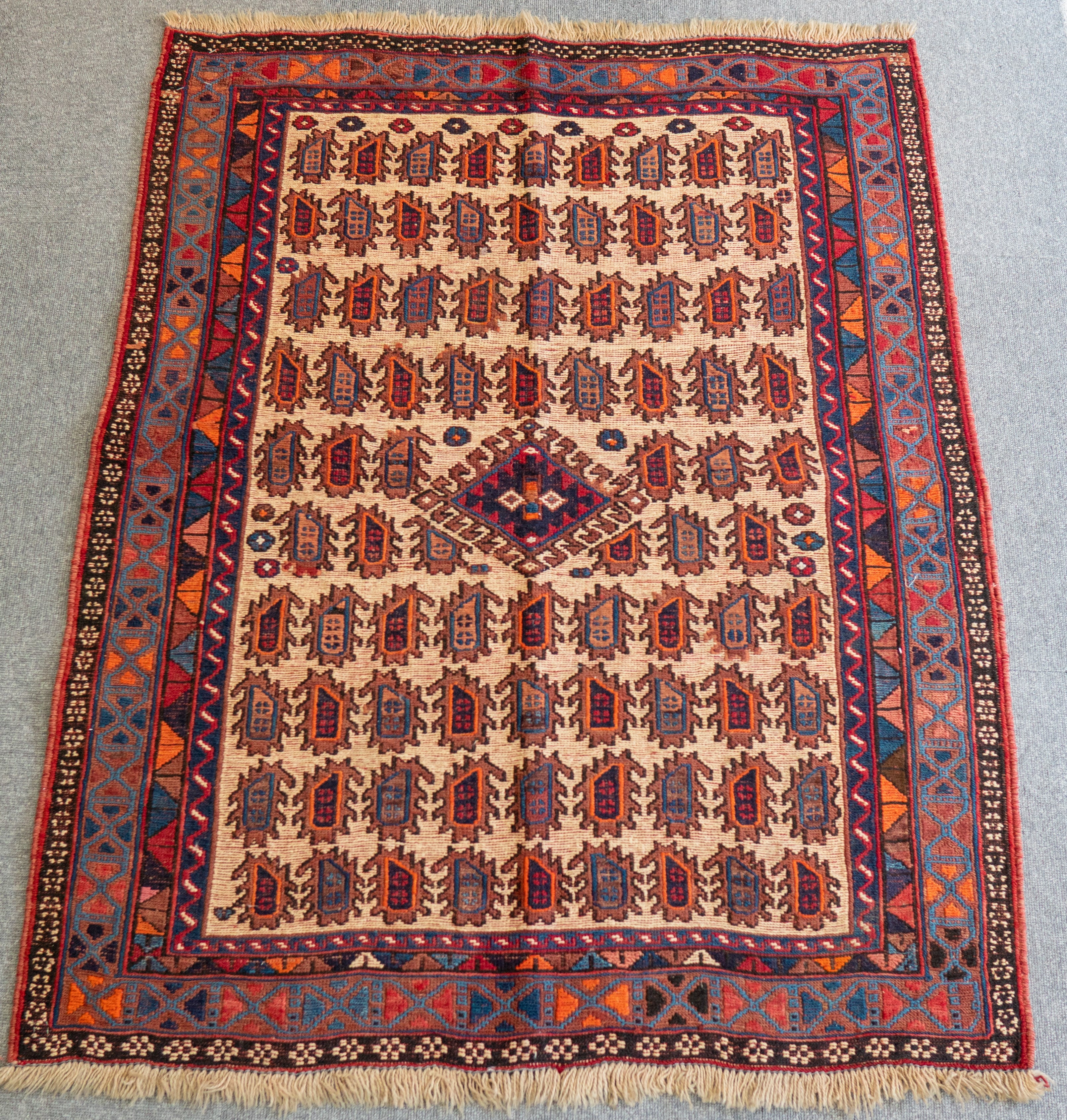 毛足のないイランの平織りトライバルラグです。スマック織りという、縦糸と横糸に飾り糸を絡めて織る高度な技法を用いています。一般的な平織りキリムの場合、両面同じ模様ができますが、スマック織りは上記のように、手の込んだ立体的に仕上がる技法のため片面仕様となっています。素材はウールですが、麻のようにさらっとした肌触り。他国のキリムと比較して柄が細かく、表面もなめらかです。