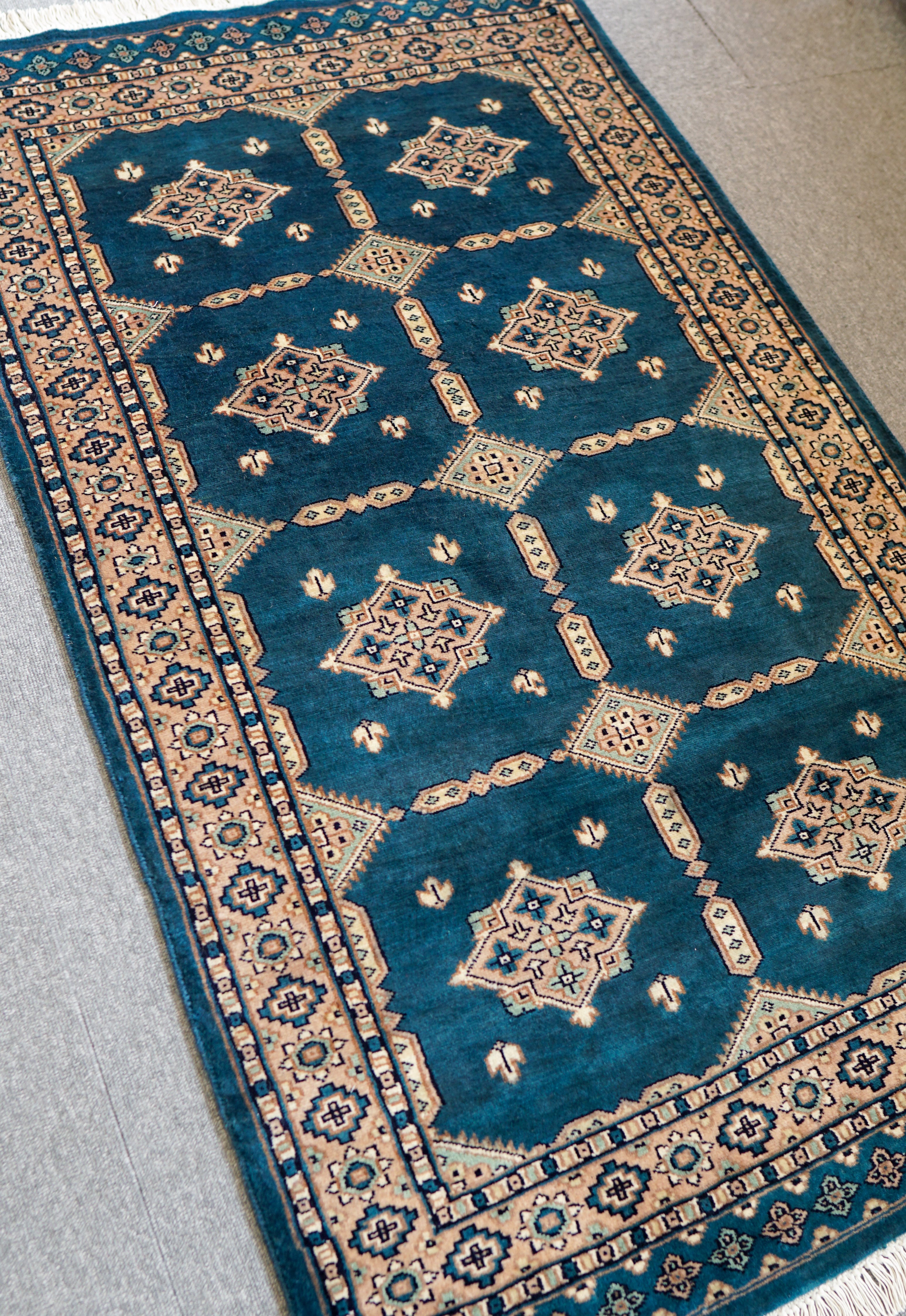 草木染めした上質なニュージーランド産ウールを使用し、パキスタンの職人が何ヶ月もの歳月をかけて手織りした絨毯です。結び目の密度が高いため、繊細なデザインをより鮮明に表します。しなやかで柔らかく、扱いやすさも格別です。
