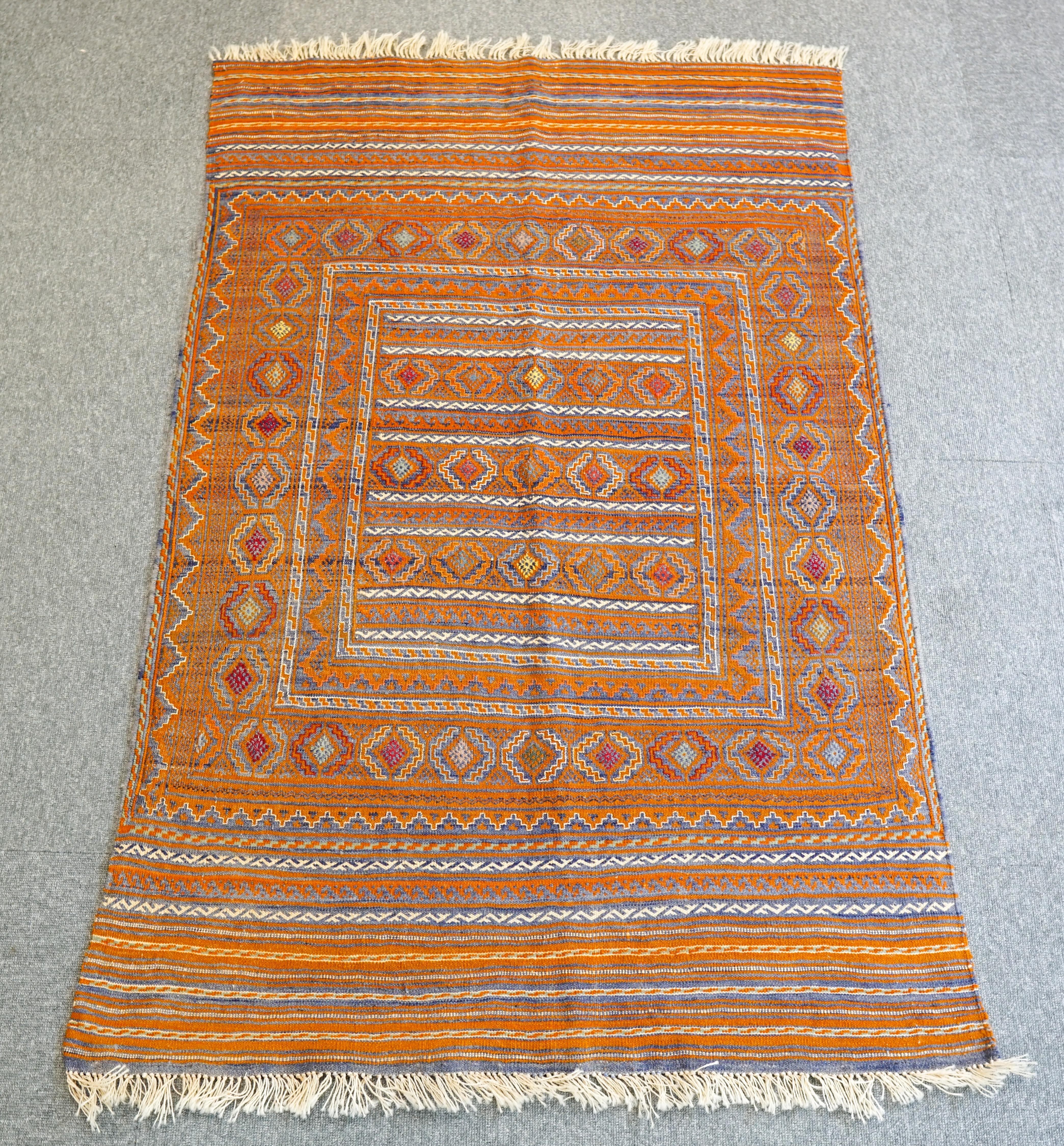 イラン シラーズ地方の高い織り技術が光る手織りキリム。毛足のない平織りのトライバルラグです。素材はウールですが、麻のようにさらっとした肌触りです。