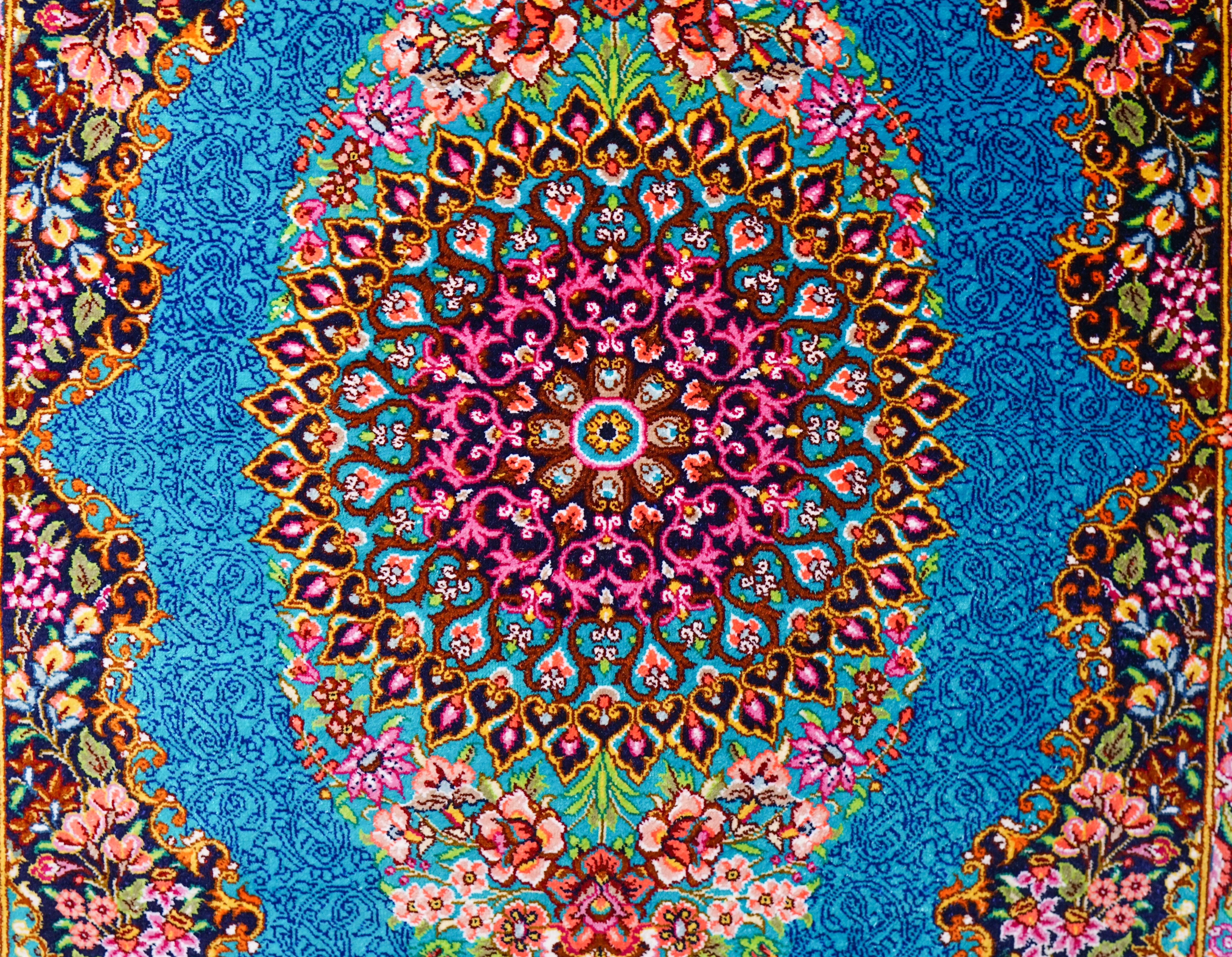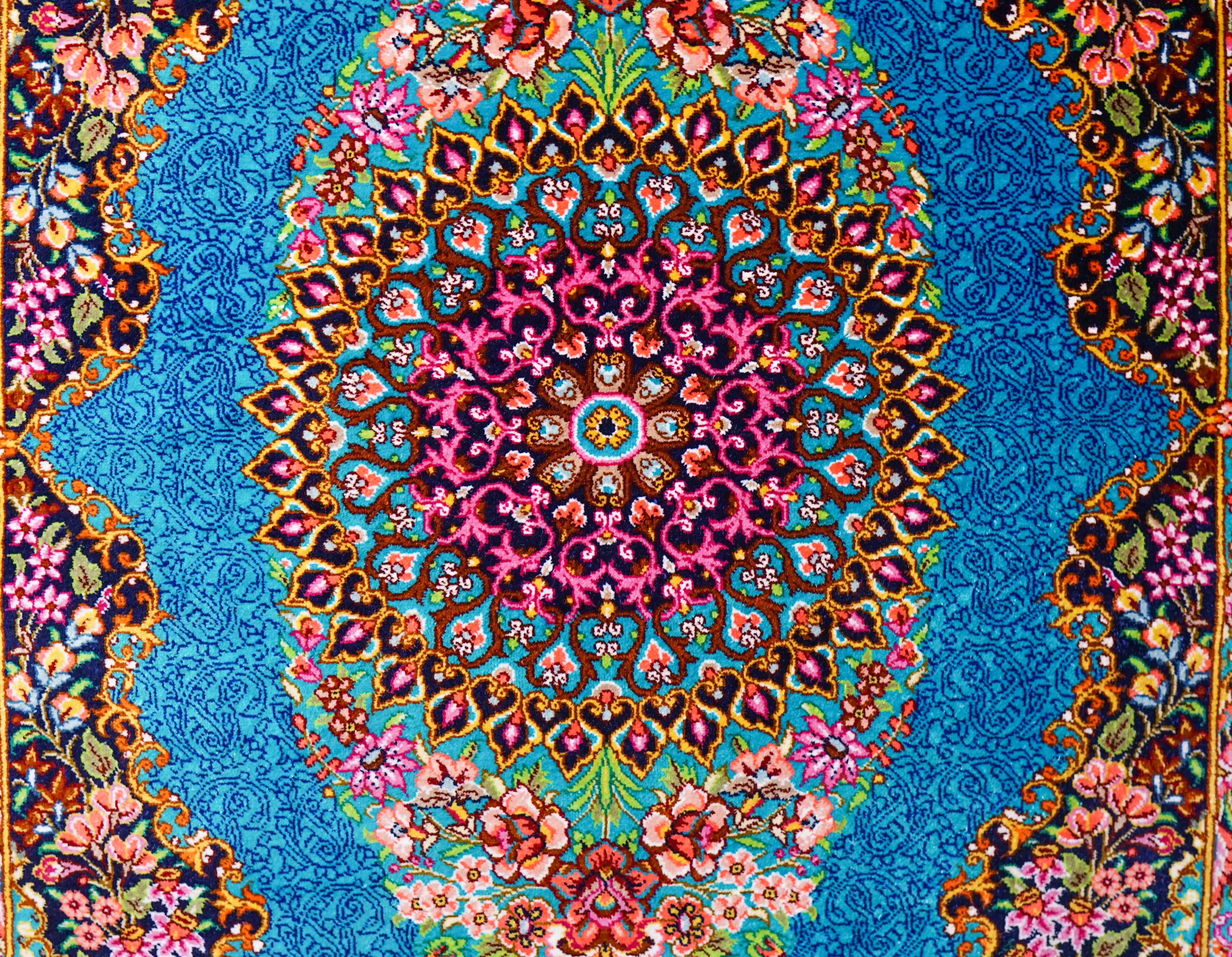 シルク100%の手織り絨毯。世界的な人気を誇るペルシャ絨毯の代表産地クム産の、玄関用や壁掛け用に最適なサイズです。