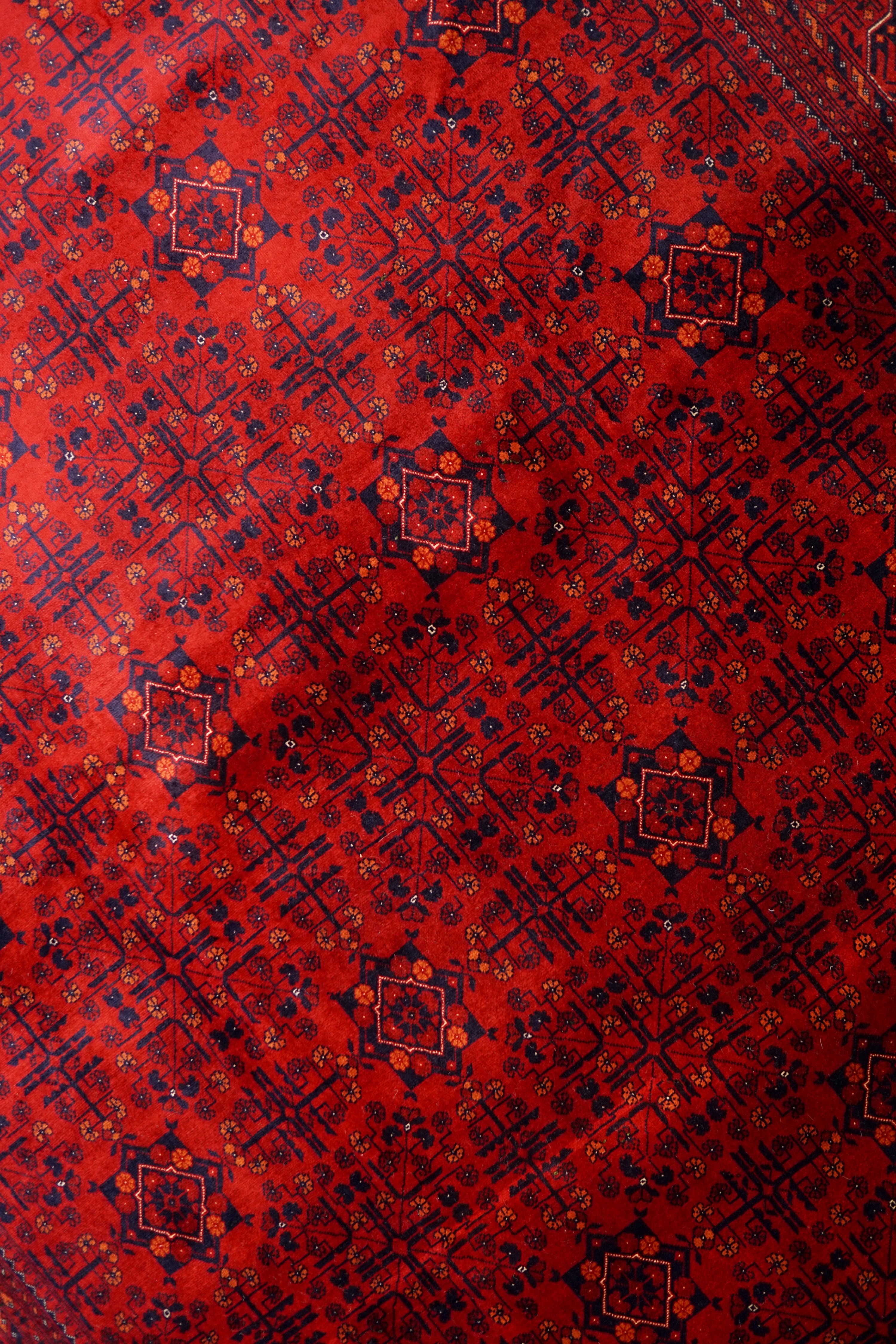 アフガン絨毯の中でも人気の高い『Khal Mohammadi(カールモハメディ)』は、耐久性に優れ、アフガニスタン産の中では最良品質といわれています。深みのある赤色とブラックネイビーの落ち着いた色合いが特徴で、シンプルな色数にすることで高級感が高まり洗練された雰囲気を宿します。あえて艶を抑えることで色の深みをより楽しめる仕上がり。