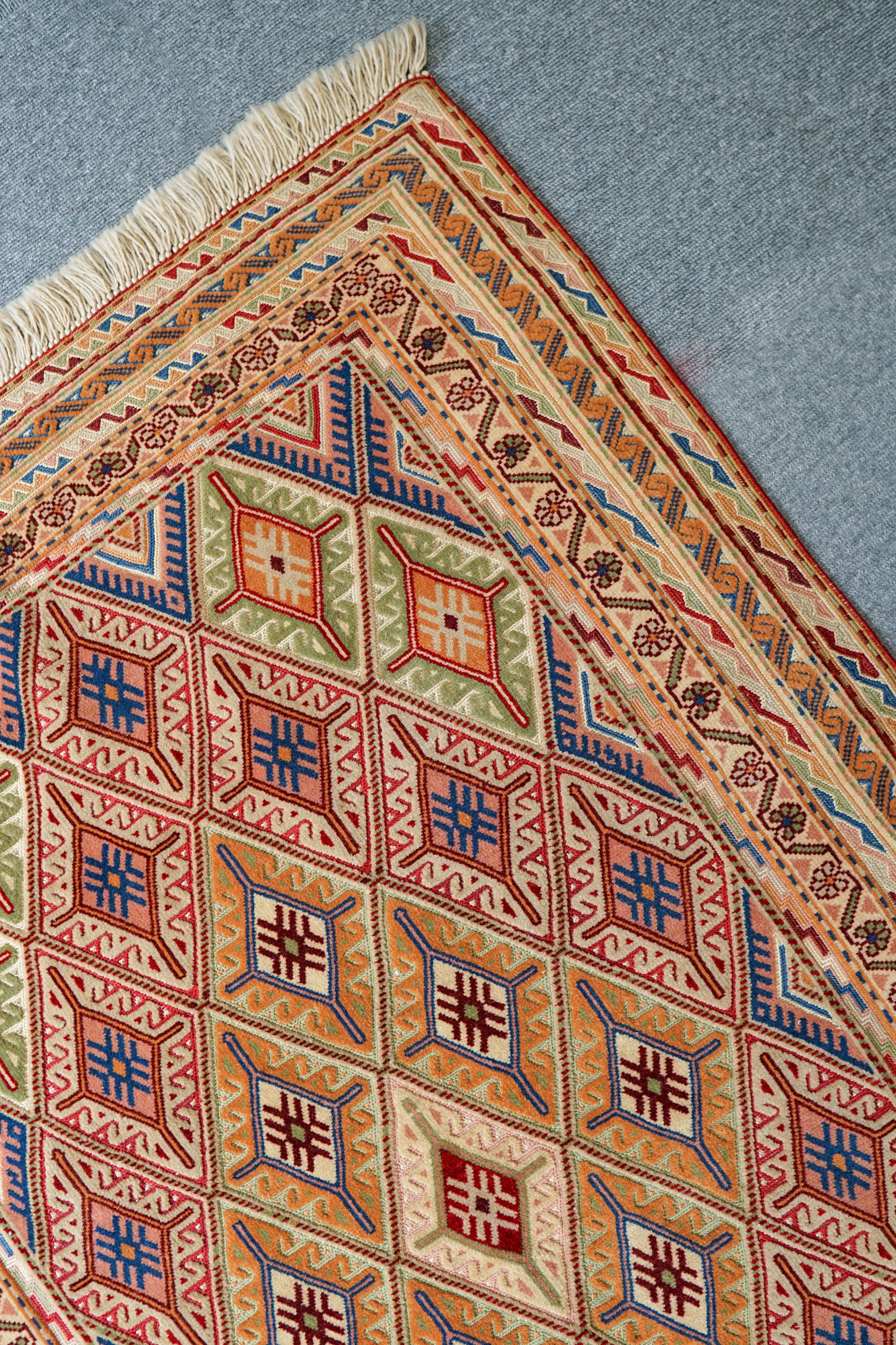 毛足のない麻のような肌触りのキリムと、パイル地の絨毯部分を合わせもった凸凹のある絨毯で、幾何学的なデザインが美しく、踏み心地も大変良いです。