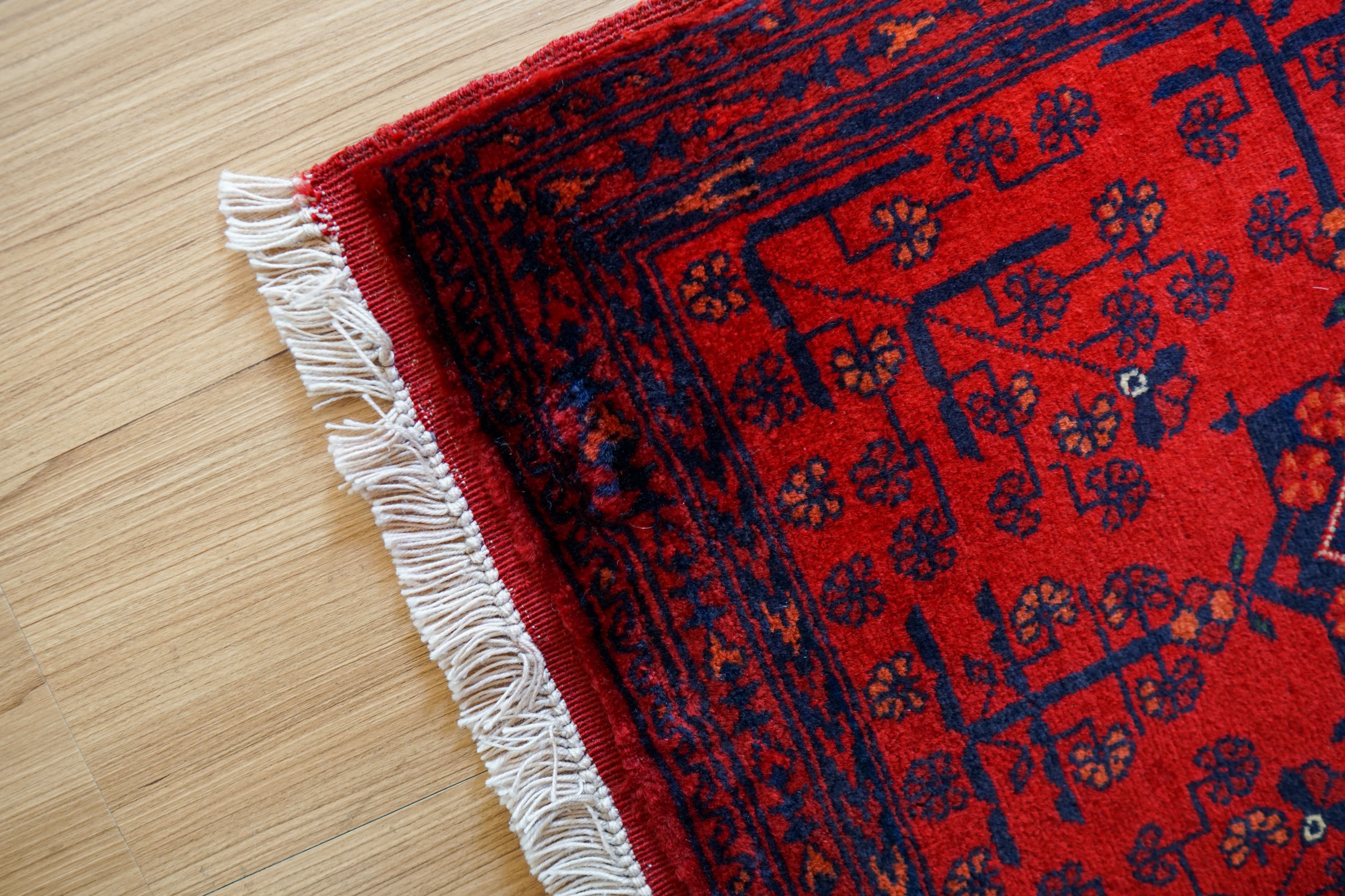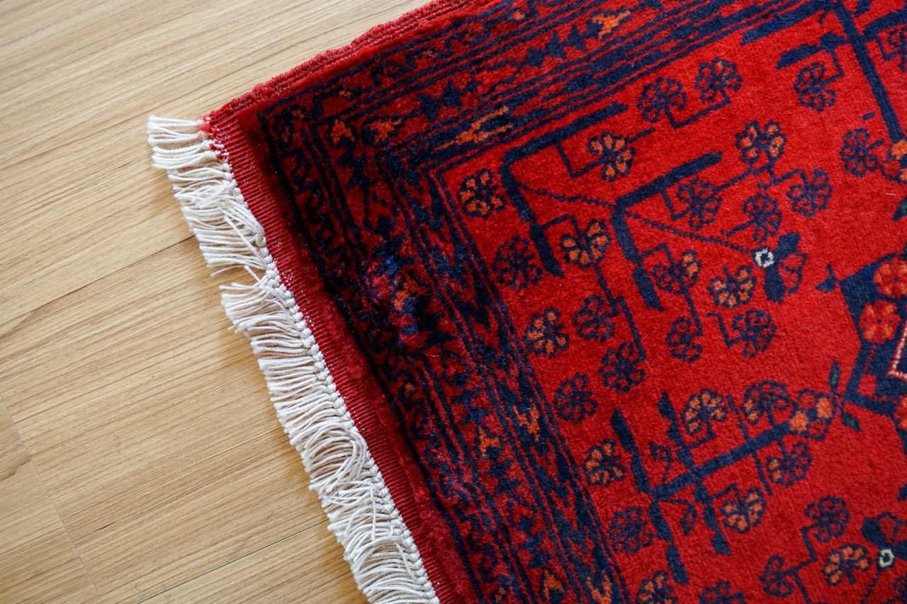アフガン絨毯の中でも人気の高い『Khal Mohammadi(カールモハメディ)』は、耐久性に優れ、アフガニスタン産の中では最良品質といわれています。深みのある赤色とブラックの落ち着いた色合いが特徴で、シンプルな色数にすることで高級感が高まり洗練された雰囲気を宿します。あえて艶を抑えることで色の深みをより楽しめる仕上がり。